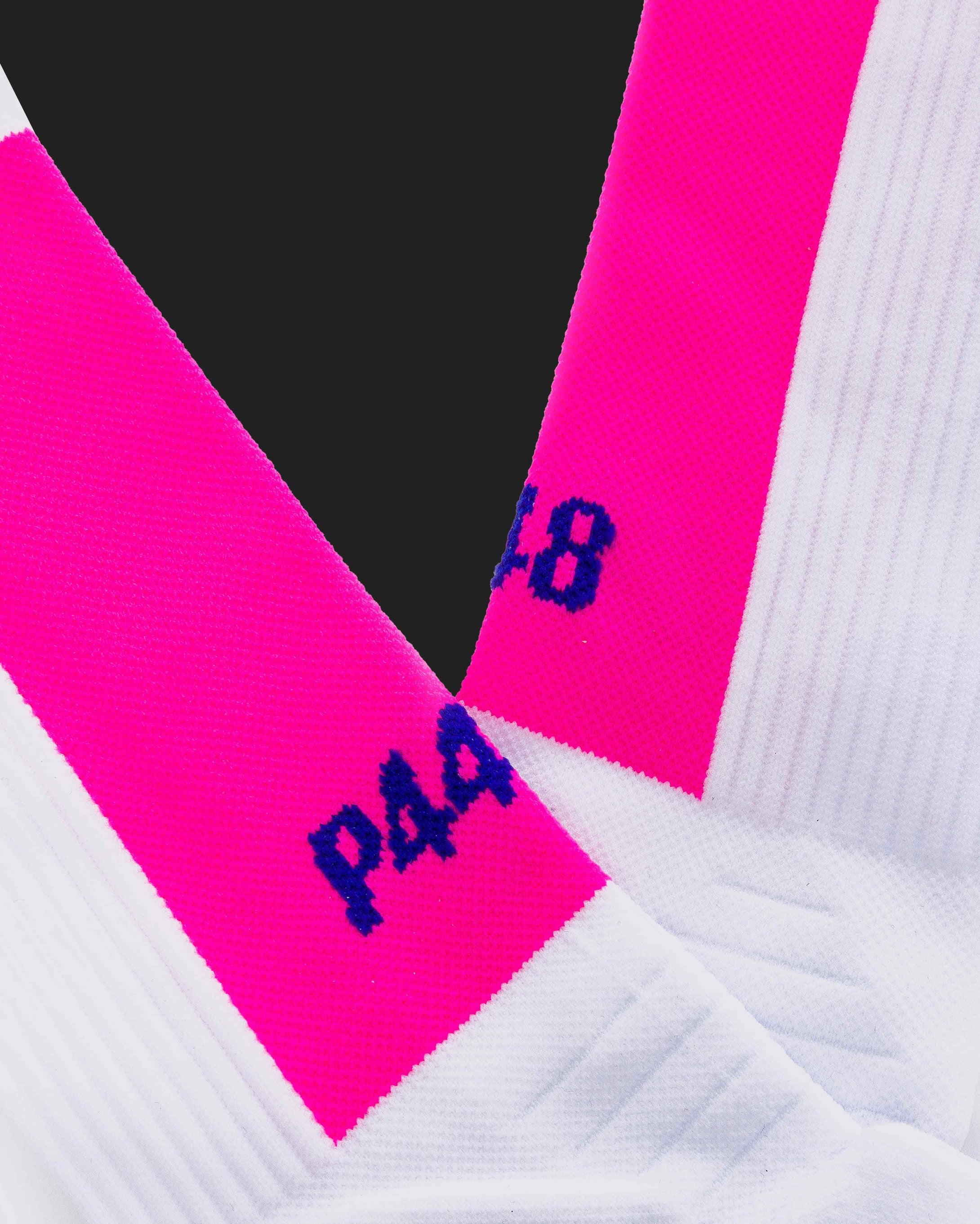 Expecting the unexpected is what P448 is all about. In this white sock, a fluorescent pink stripe surrounds the ankle, adding a fun flash to any shoe with which you wear them.