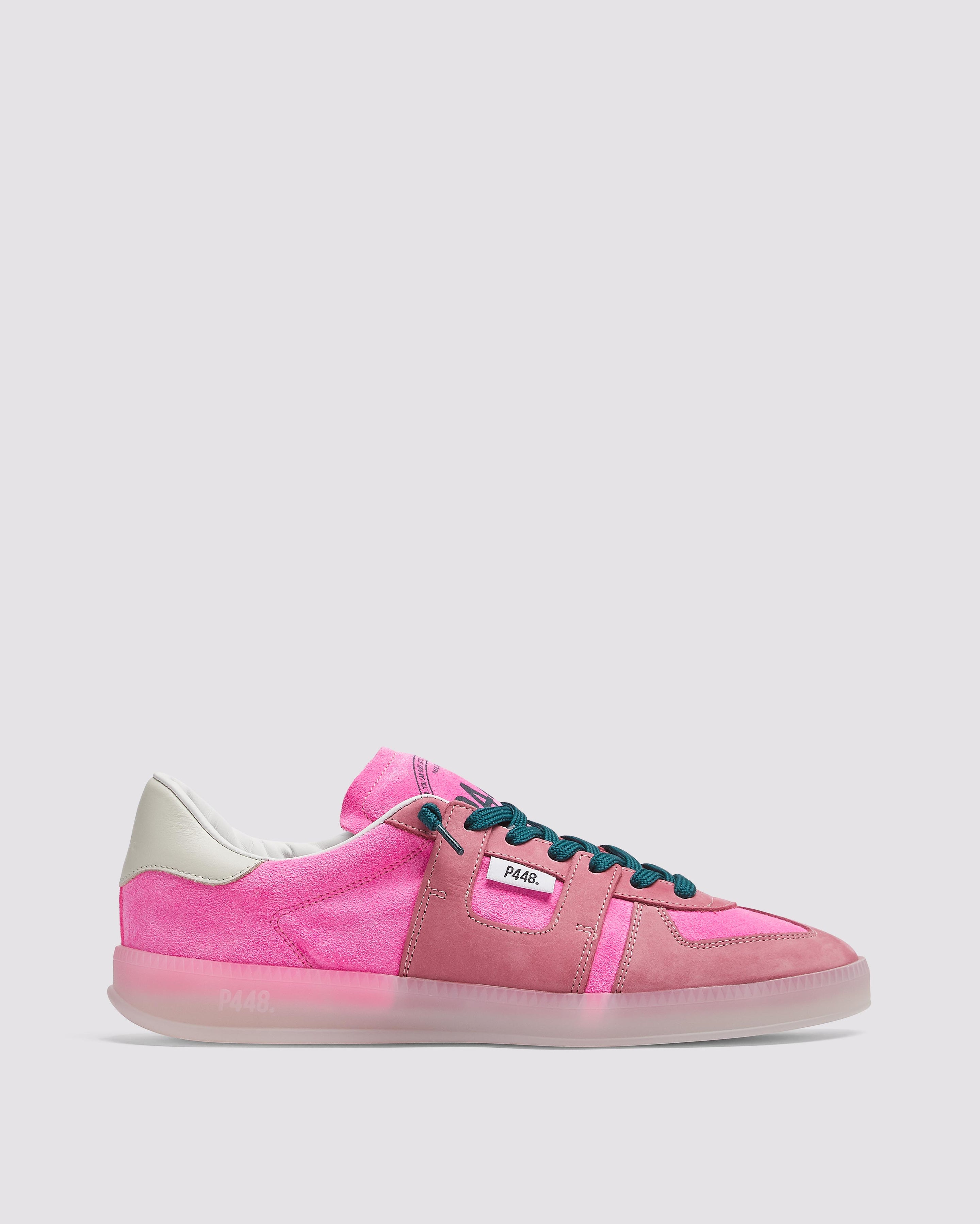 More than a pop of pink. The Monza Neon Pink is wrapped in fluorescent pink suede, grounded by a white leather heel tab and a transparent rubber sole. Navy cotton laces tie it all together.