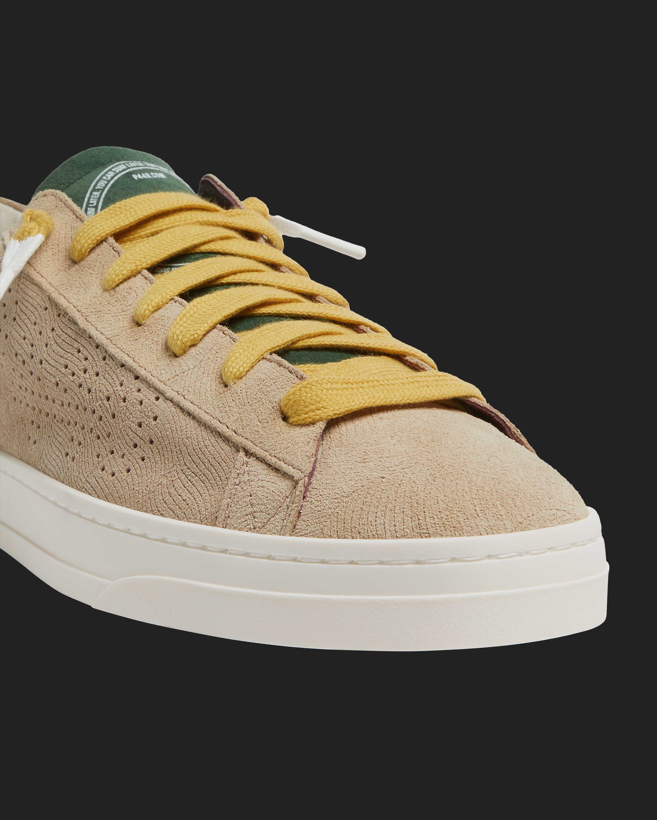 The Jack Palm is wrapped in beige suede complemented by a green suede trim and heel tab. Unique mustard cotton laces and our signature P448 rubber sole ground the look.