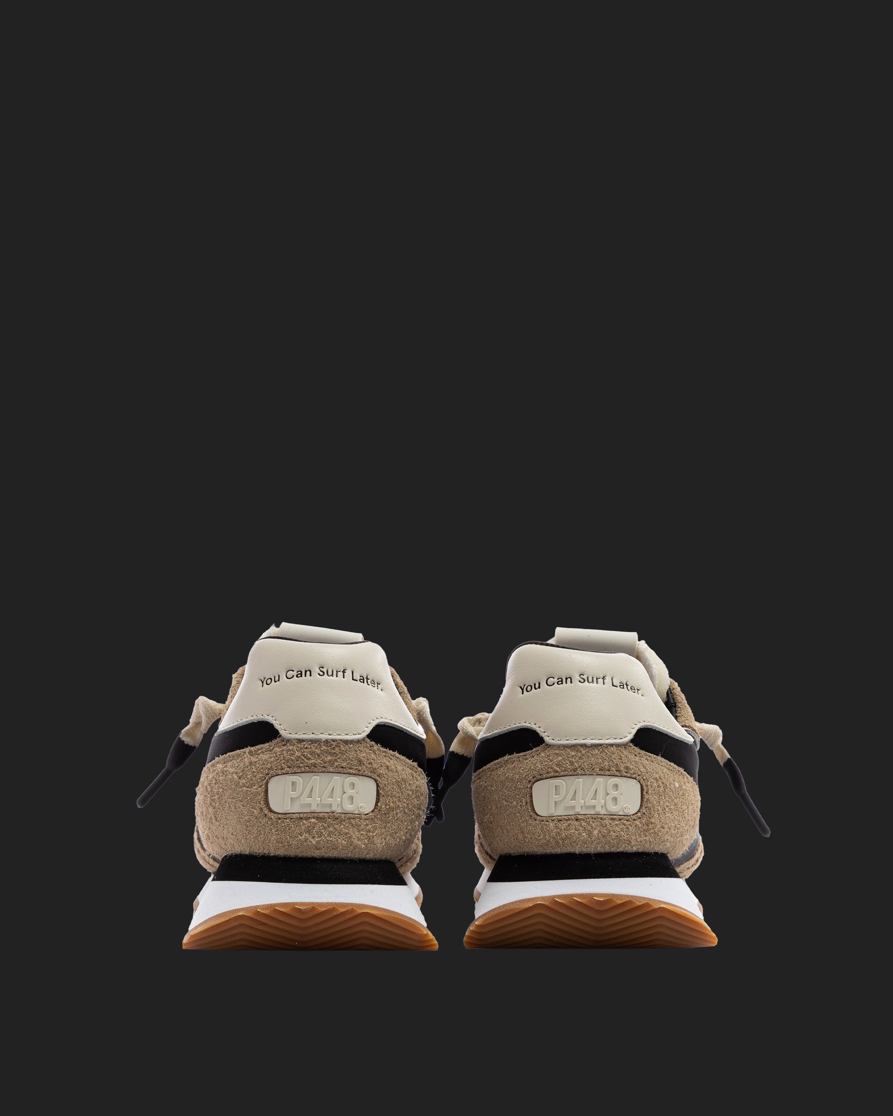 The Jesse Black features a beige suede and black nylon design, complemented by beige suede accents and a cream leather heel tab. White cotton laces with black silicone aglets, and our signature P448 amber treads finish off the sporty look.