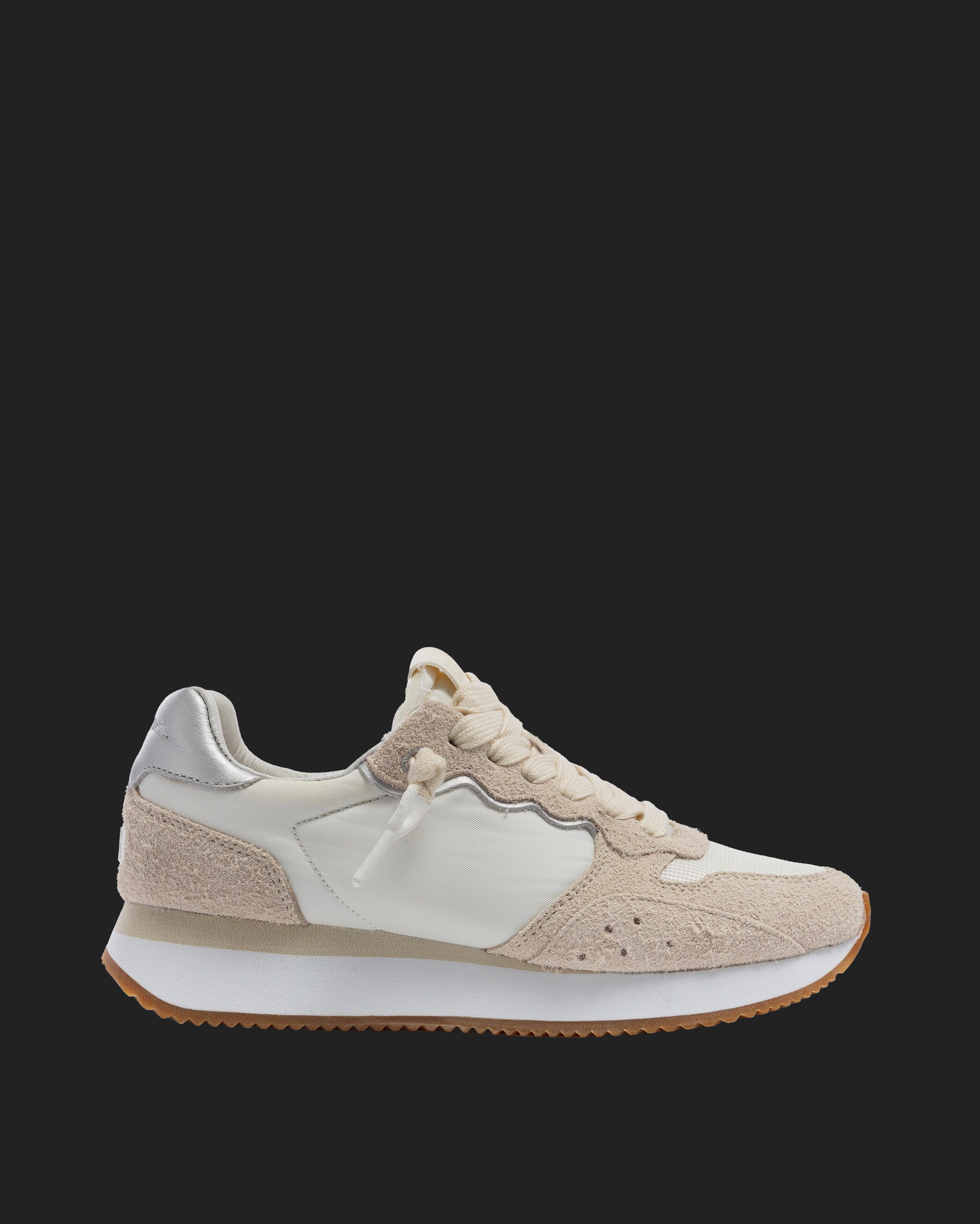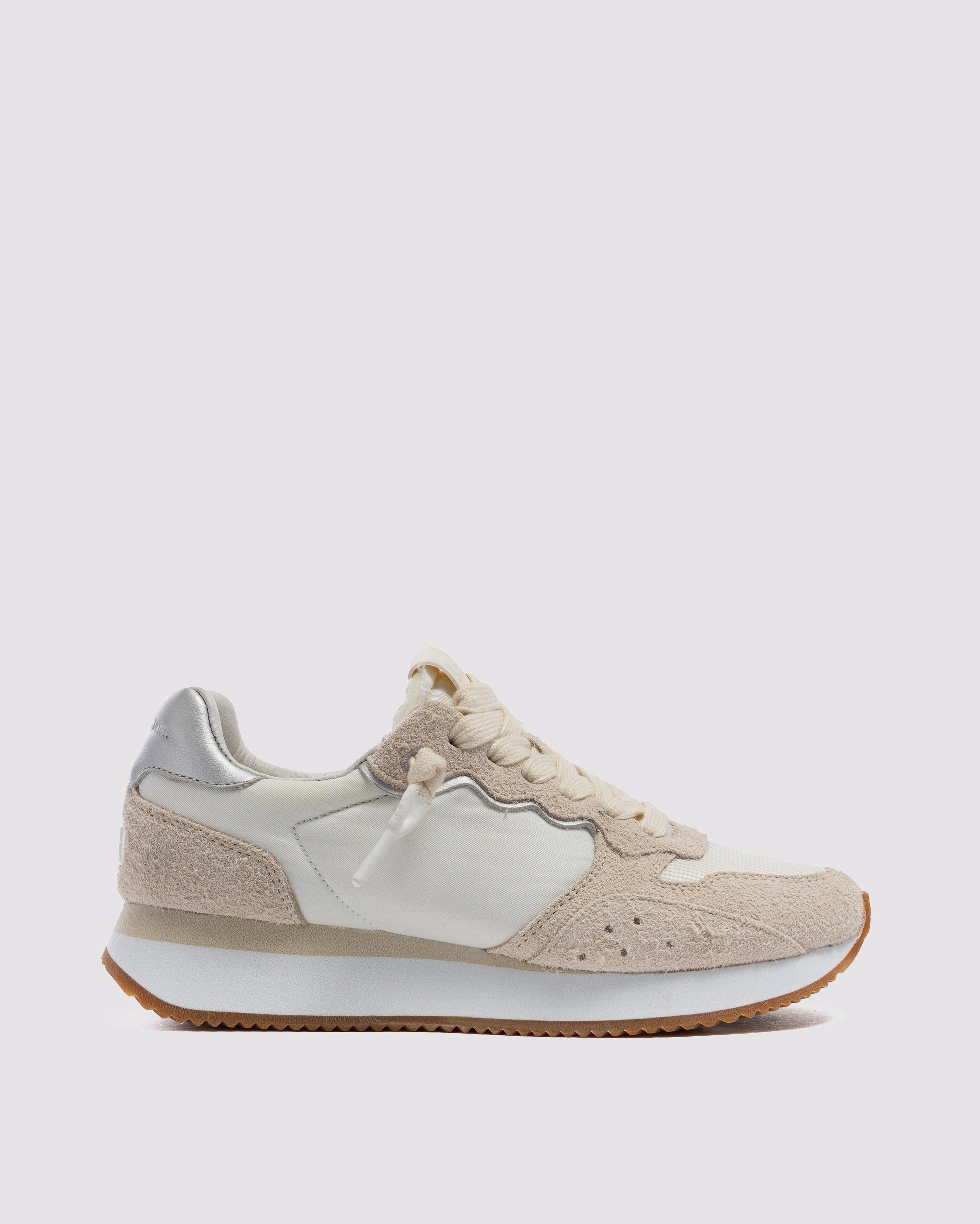 The Jesse White features a beige suede and white nylon design, complemented by beige suede details and a matte silver...