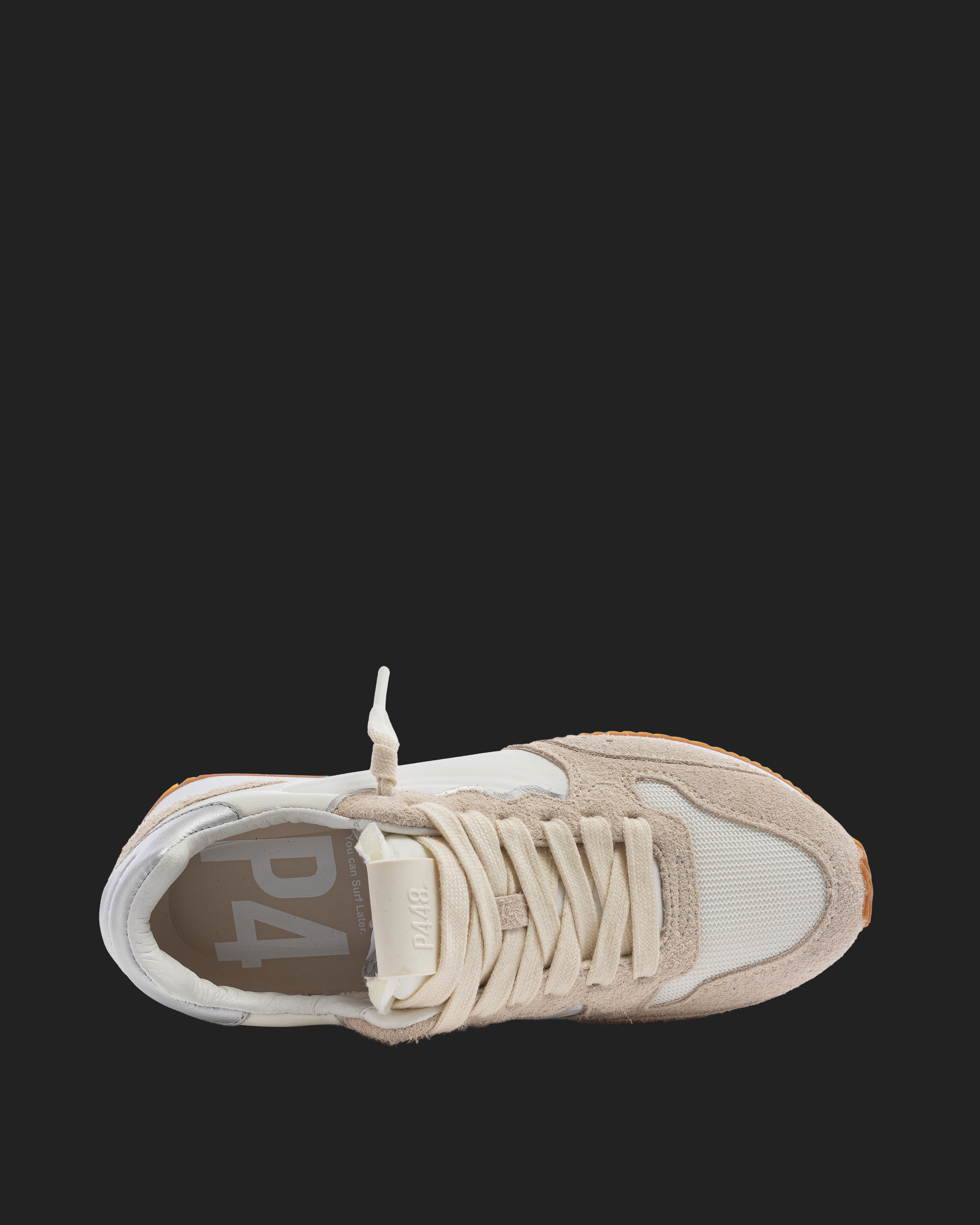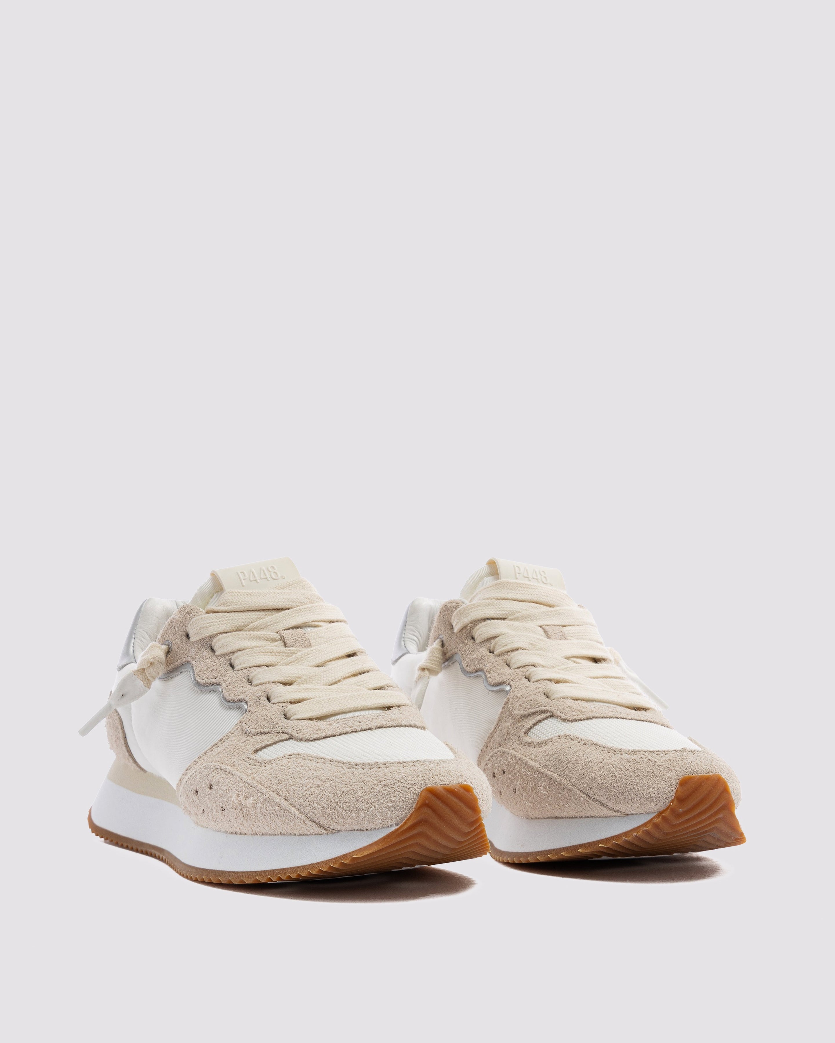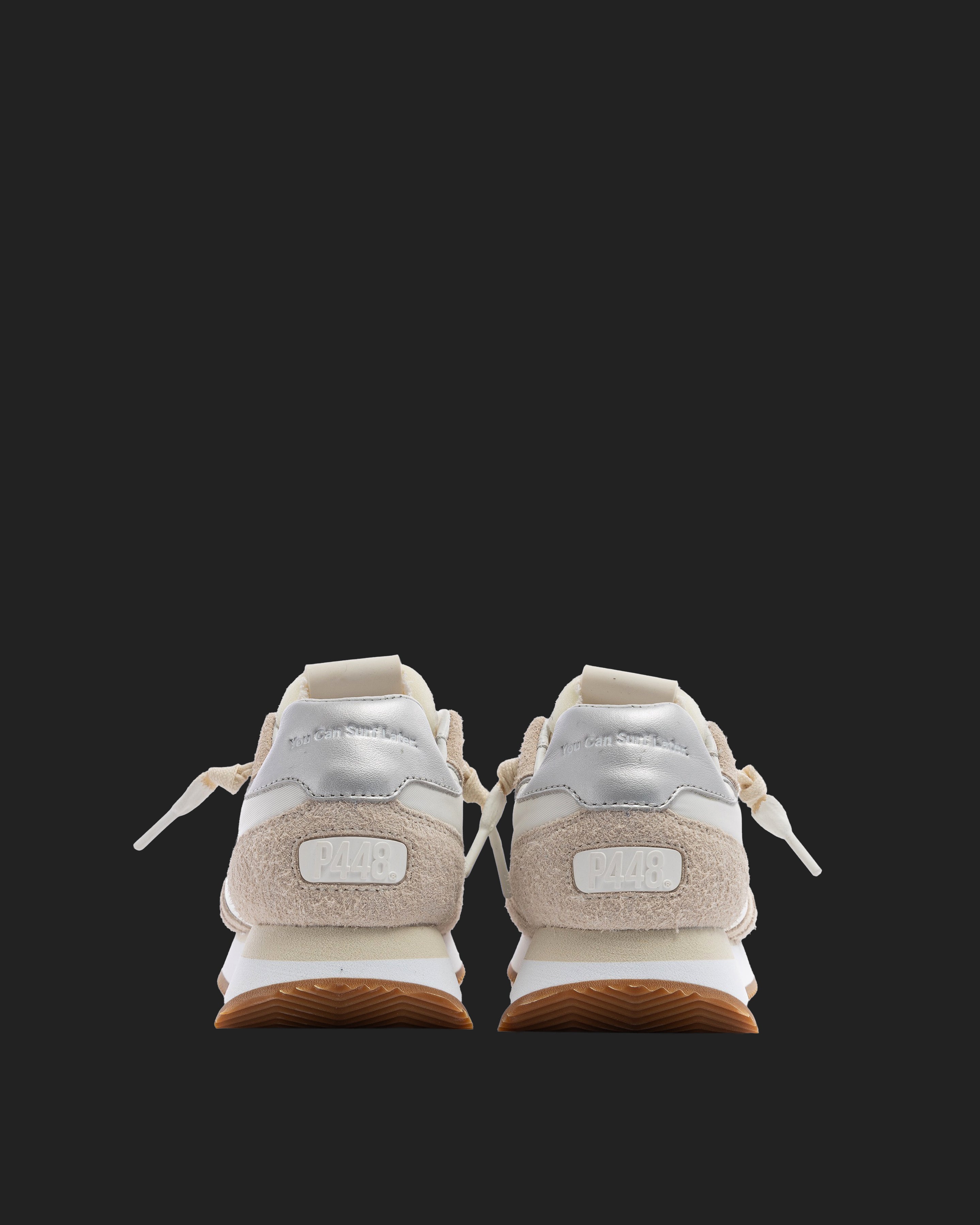 The Jesse White features a beige suede and white nylon design, complemented by beige suede details and a matte silver leather heel tab. Cream cotton laces with white silicone aglets, and our signature P448 amber treads finish off the sporty look.