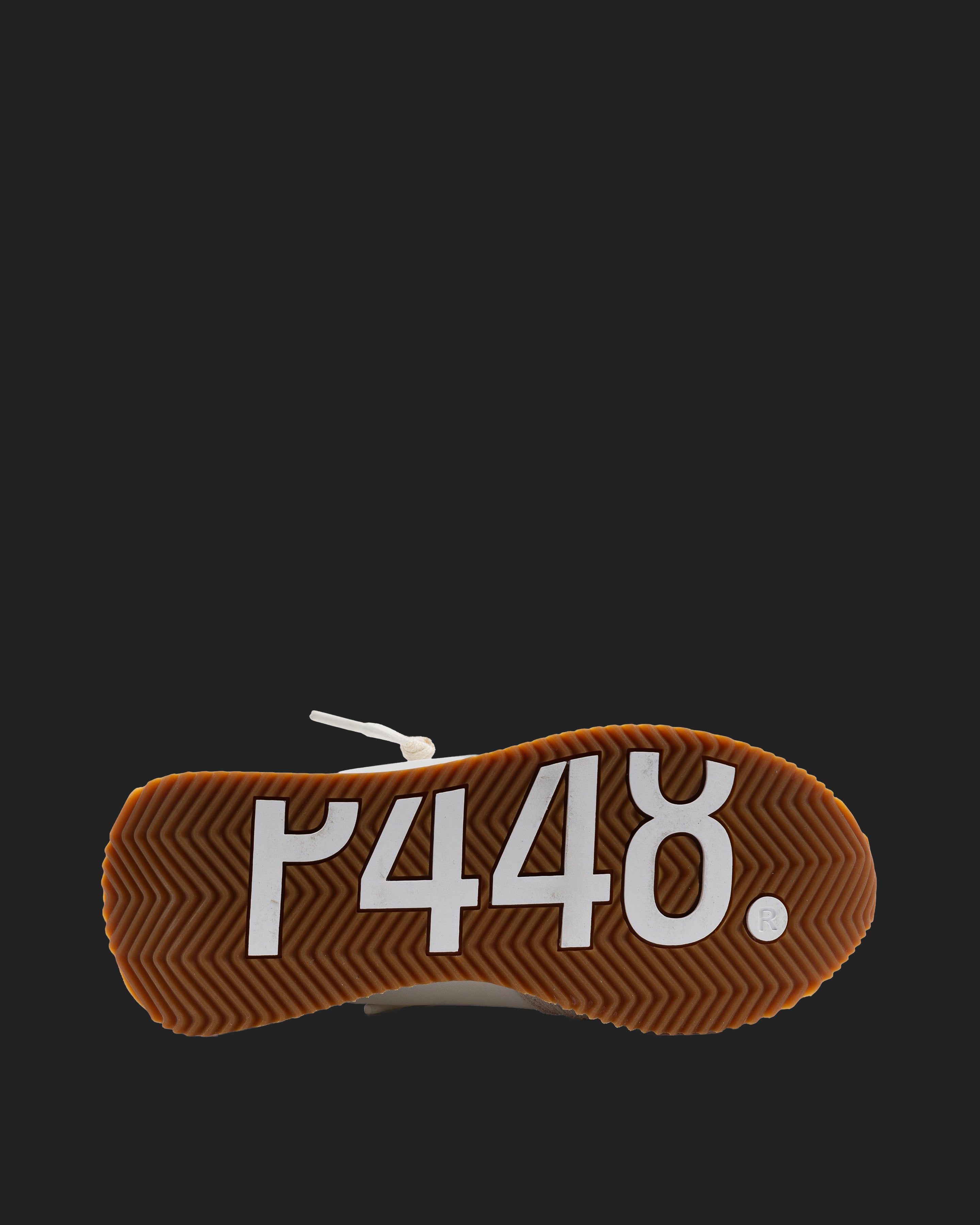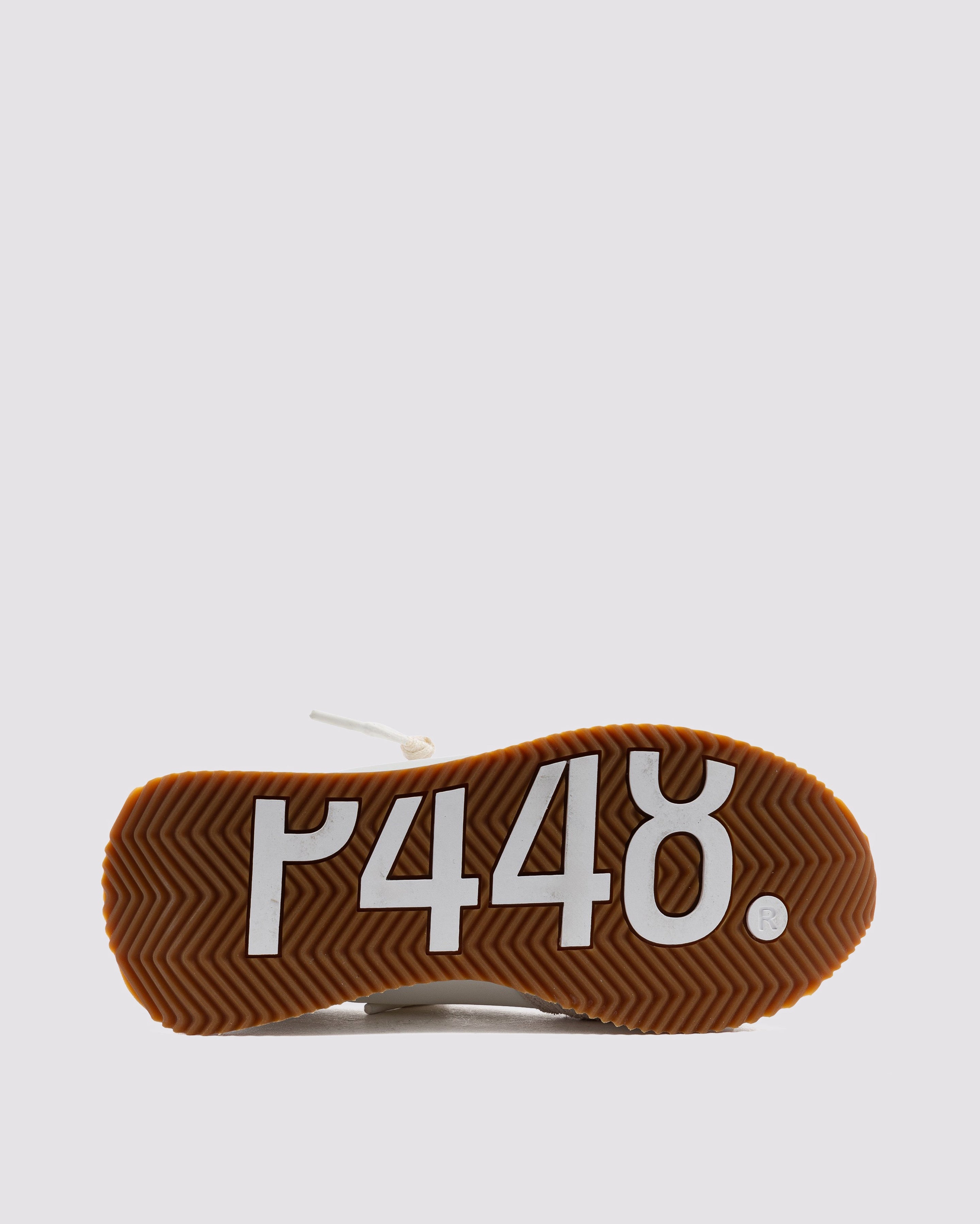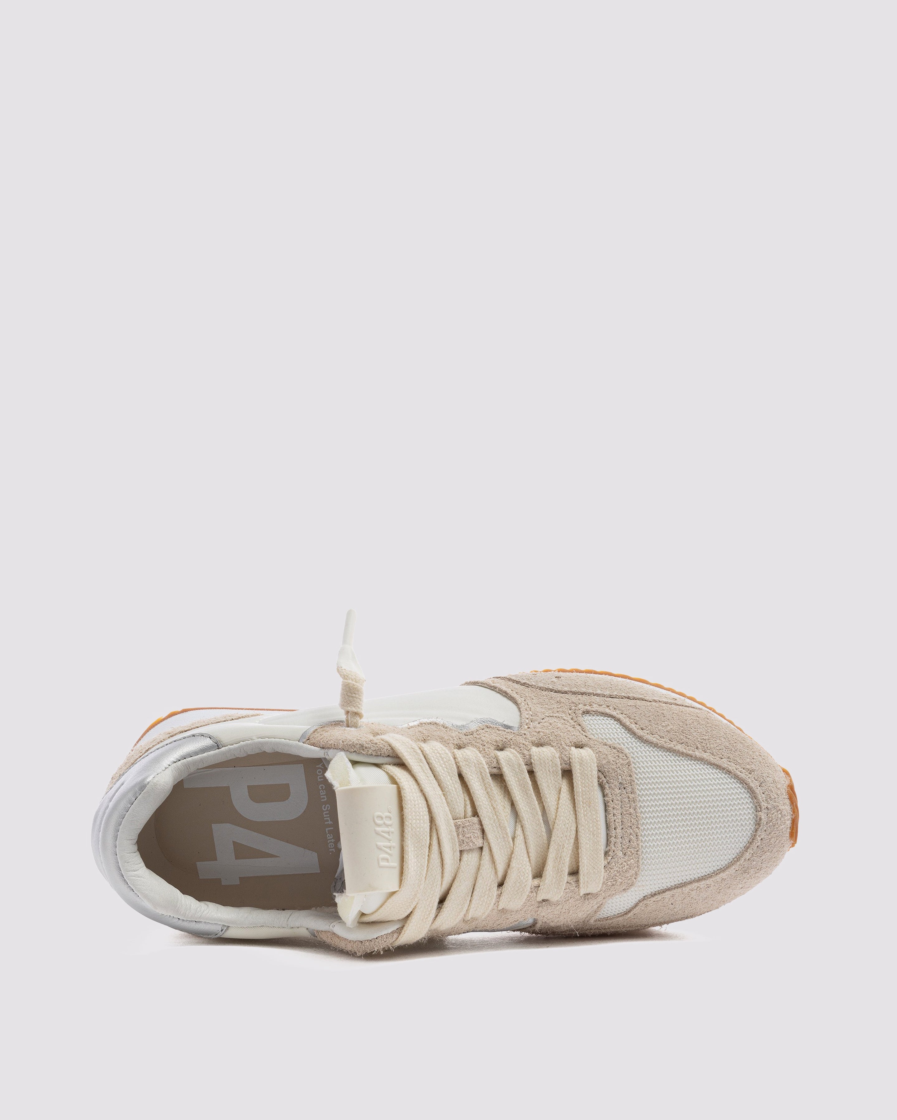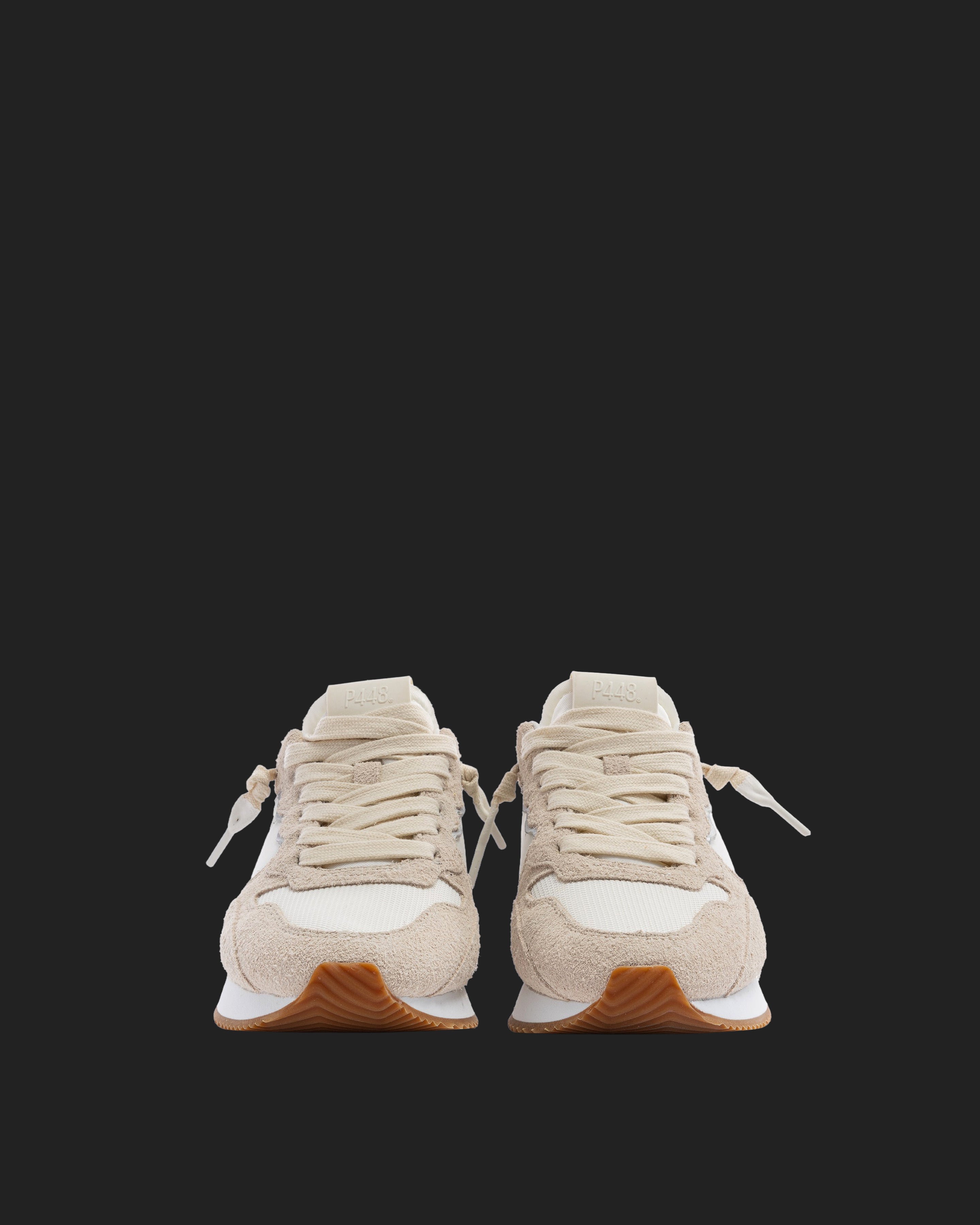 The Jesse White features a beige suede and white nylon design, complemented by beige suede details and a matte silver leather heel tab. Cream cotton laces with white silicone aglets, and our signature P448 amber treads finish off the sporty look.