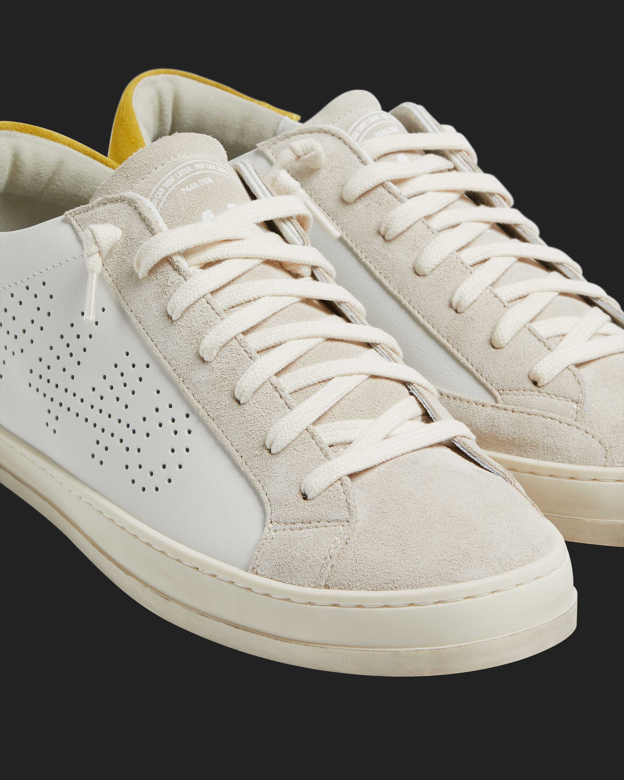 The John Ochre is wrapped in white leather, complemented by beige suede accents and a printed yellow suede heel tab. Cream cotton laces and our signature P448 hand-distressed rubber sole with neutral tread ground the look.