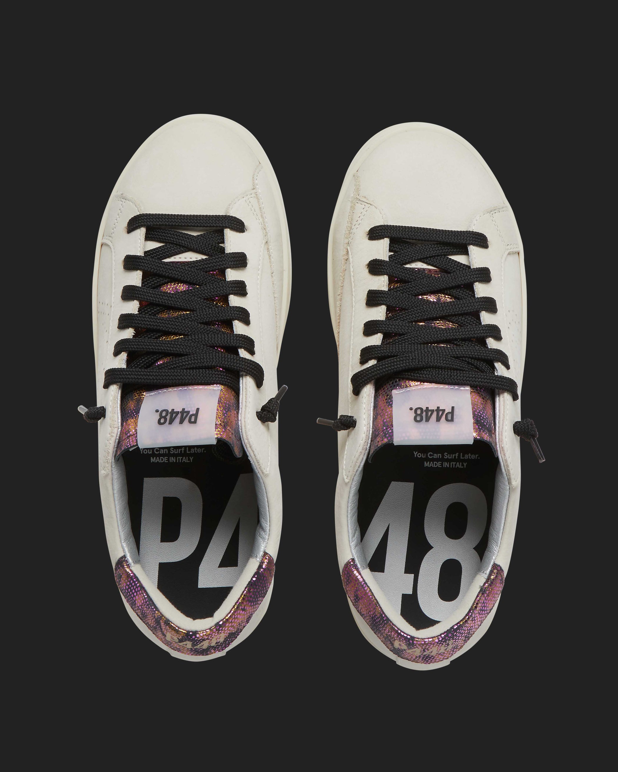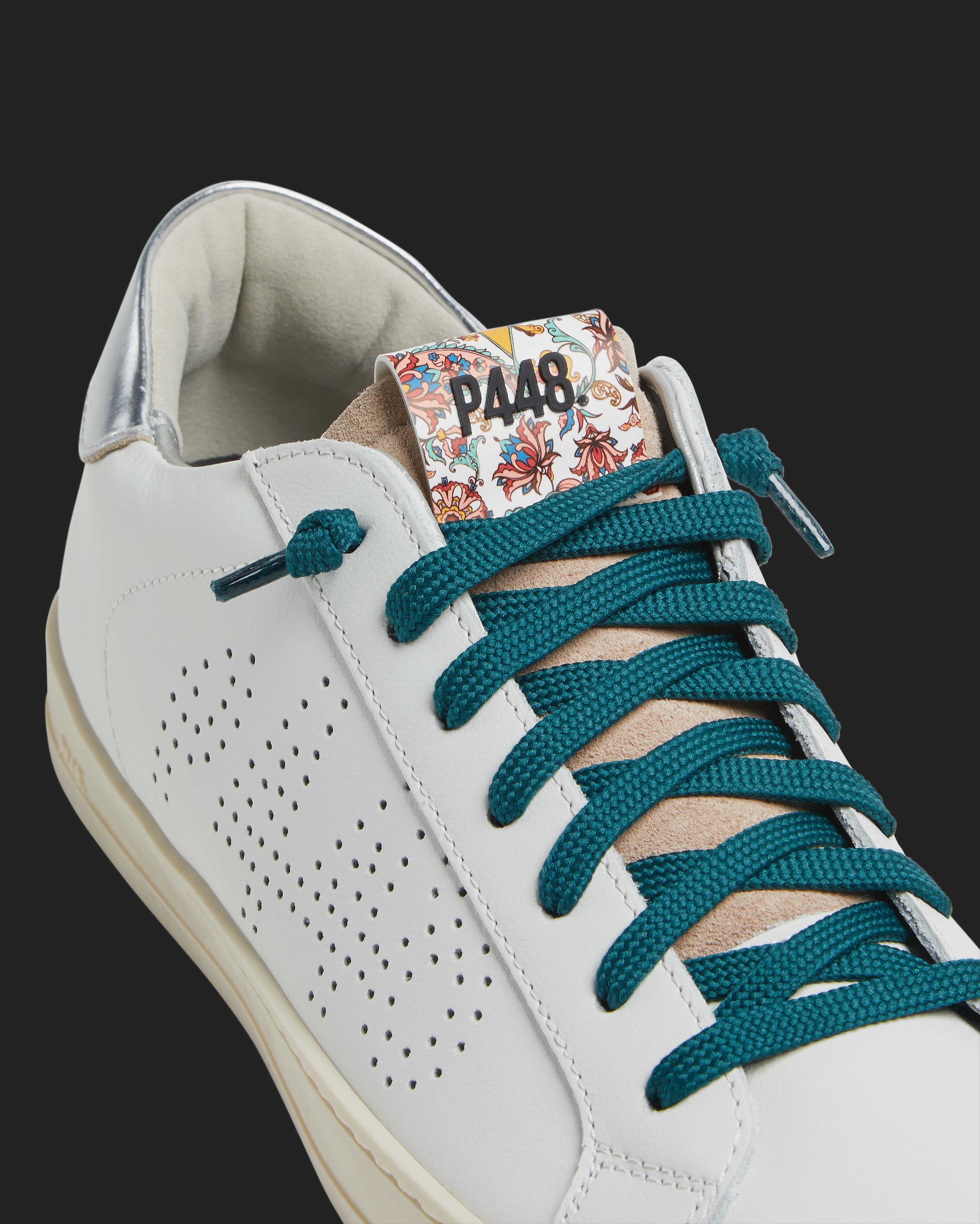 The John Foil is wrapped in white leather and peach suede with a contrasting metallic silver leather heel tab. Dark teal laces and our signature P448 rubber soles with paisley-printed treads tie it all together.