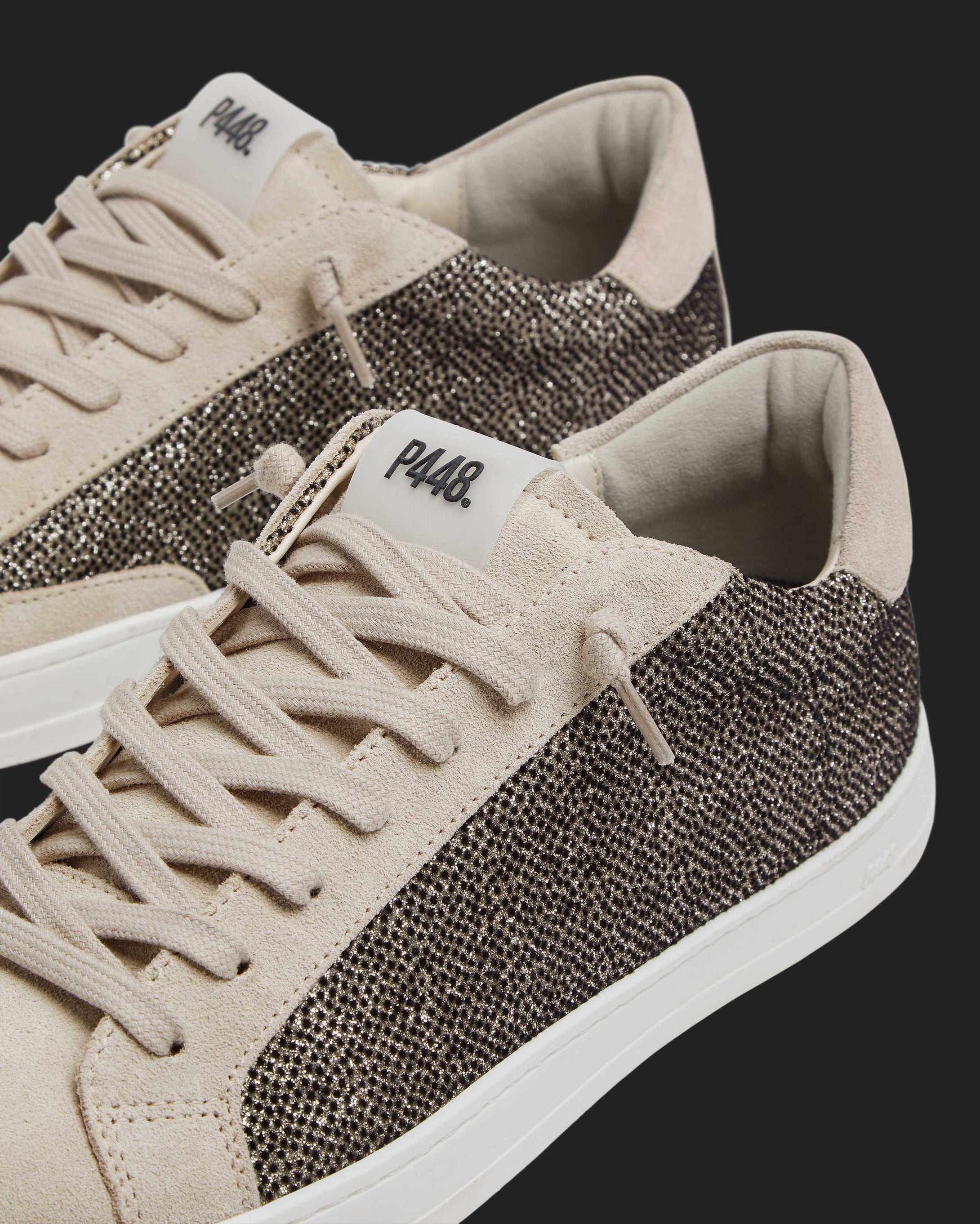 The John Felix/Gold is wrapped in black and gold dotted velvet, grounded by sand suede accents. Beige cotton laces and our signature P448 rubber soles tie it all together.