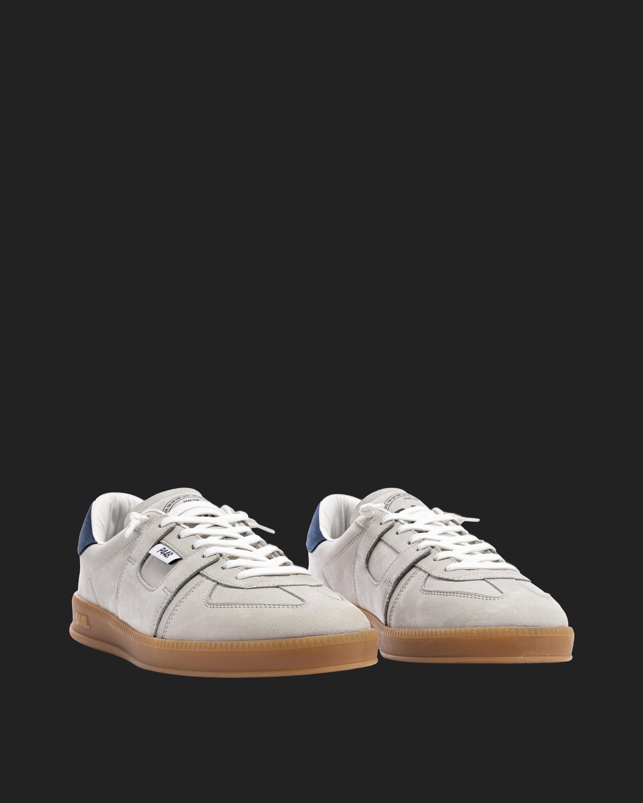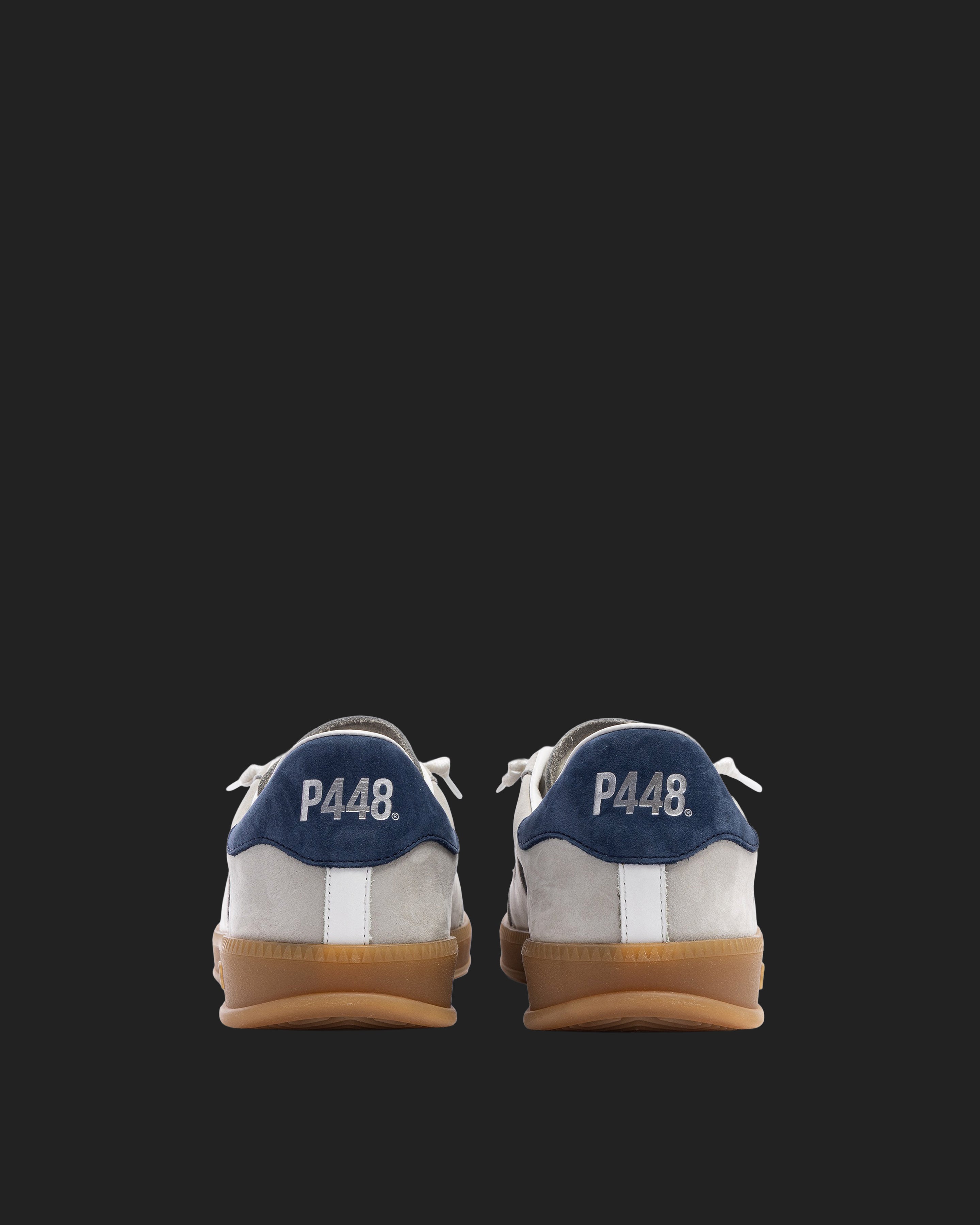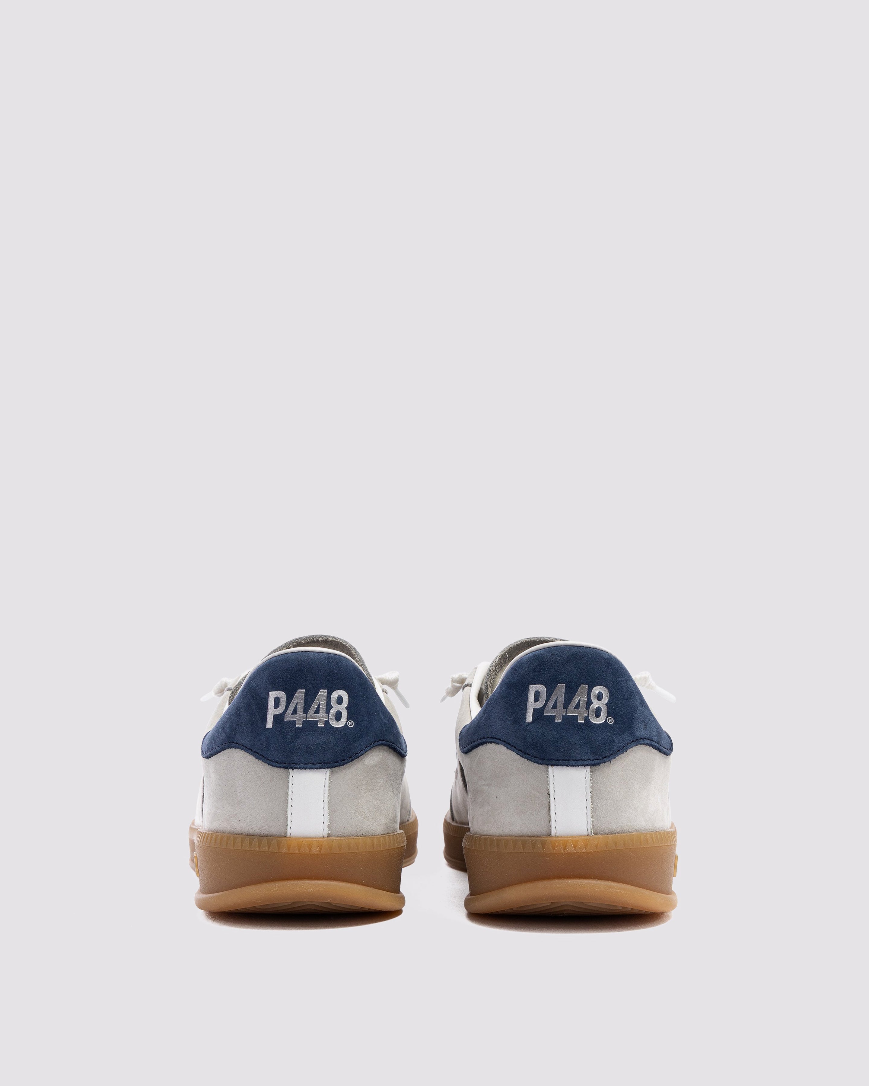 The Monza Grey/Navy features an all-over light grey nubuck leather upper with matching tongue, trim, and toe, accented by a navy blue leather heel tab and white cotton laces for a clean contrast. Finished with our signature P448 gum sole and memory foam insole for all-day comfort and timeless style.