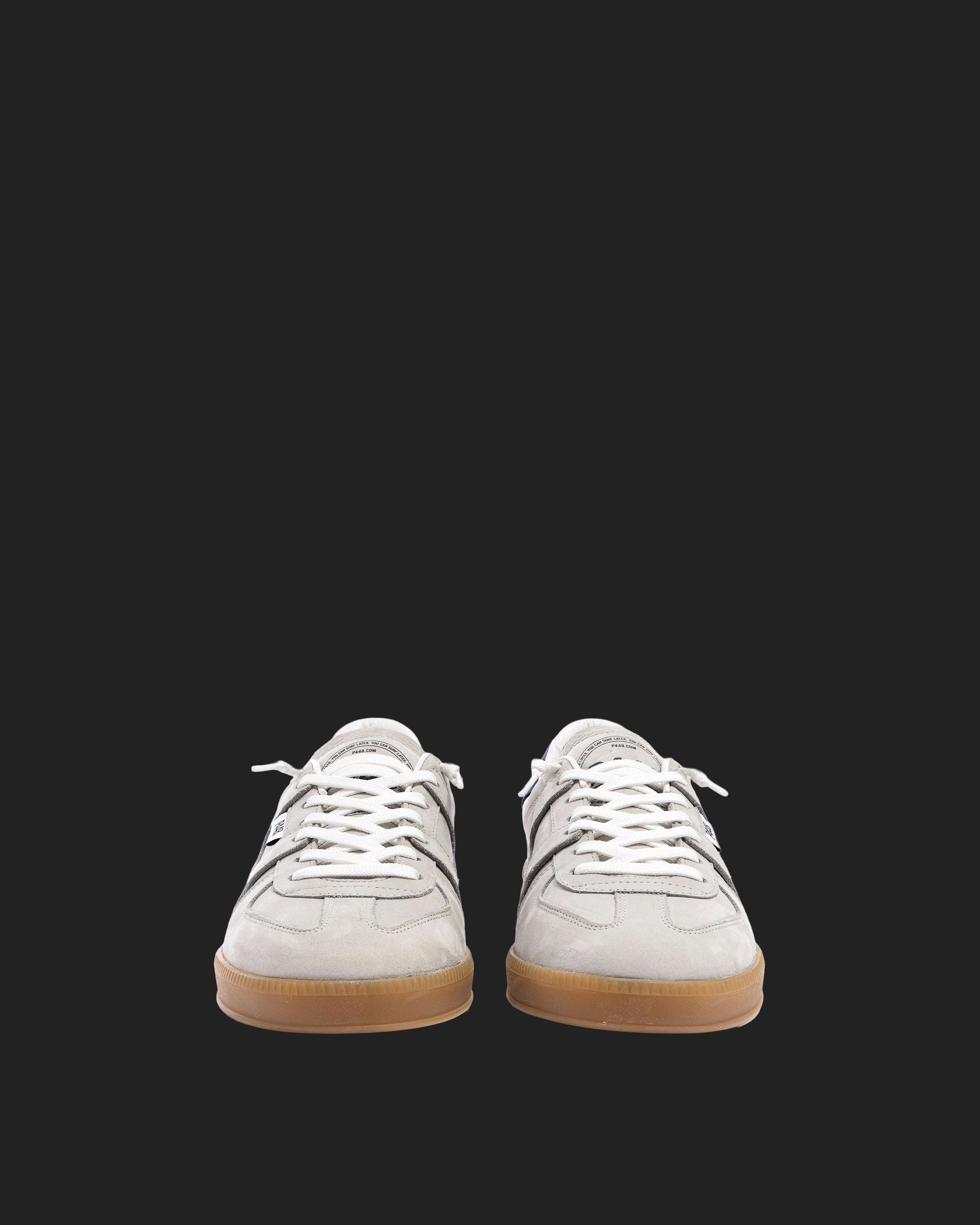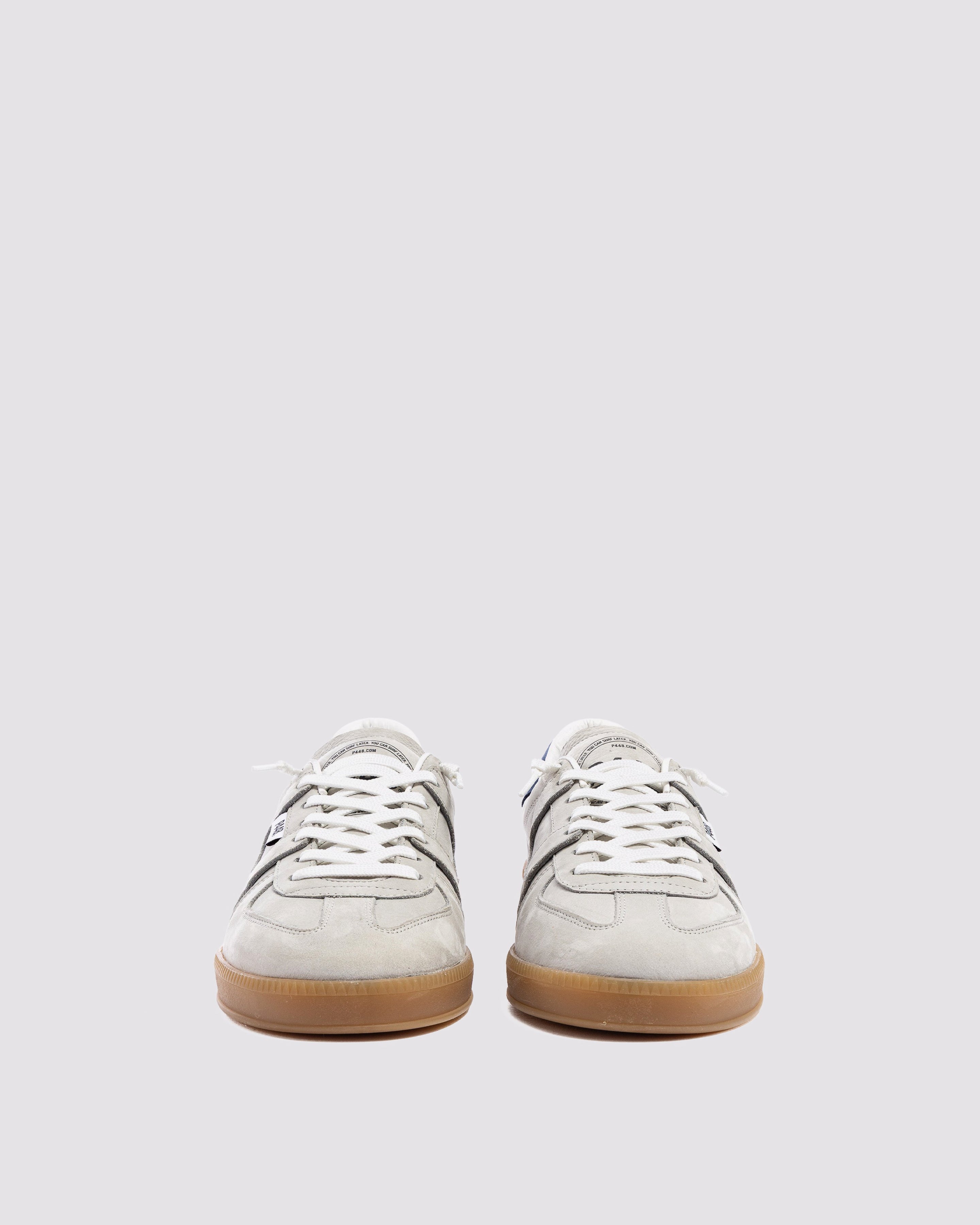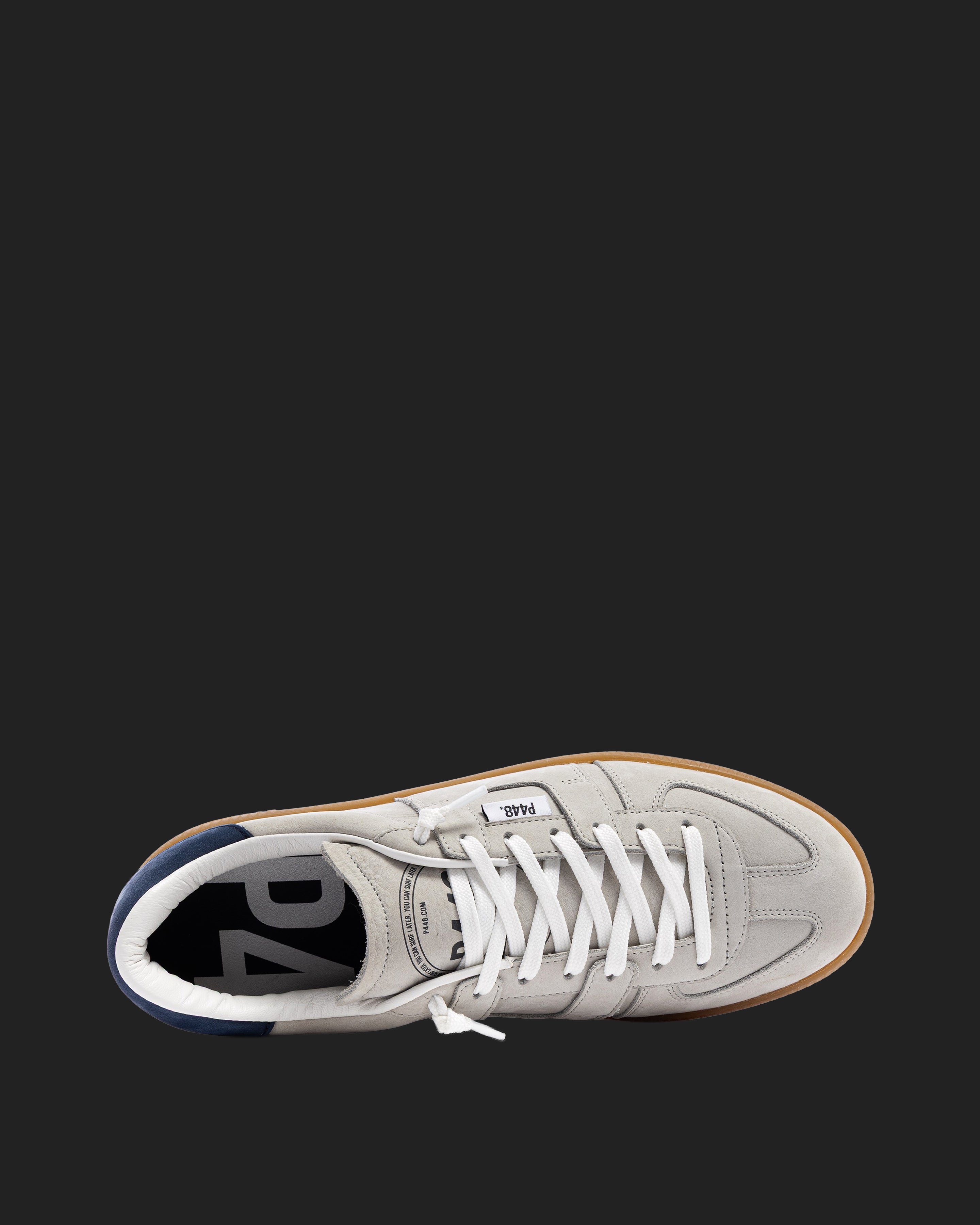 The Monza Grey/Navy features an all-over light grey nubuck leather upper with matching tongue, trim, and toe, accented by a navy blue leather heel tab and white cotton laces for a clean contrast. Finished with our signature P448 gum sole and memory foam insole for all-day comfort and timeless style.