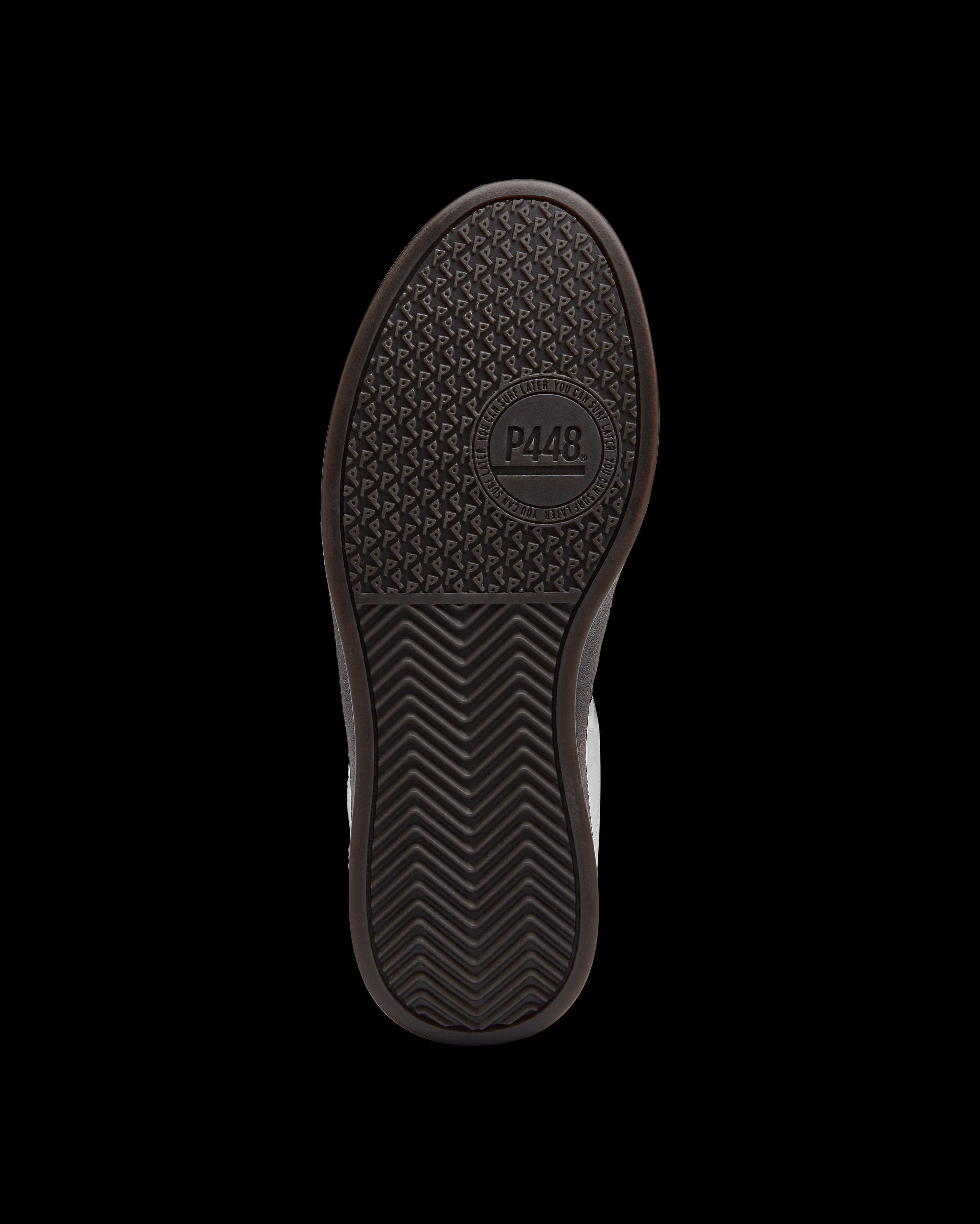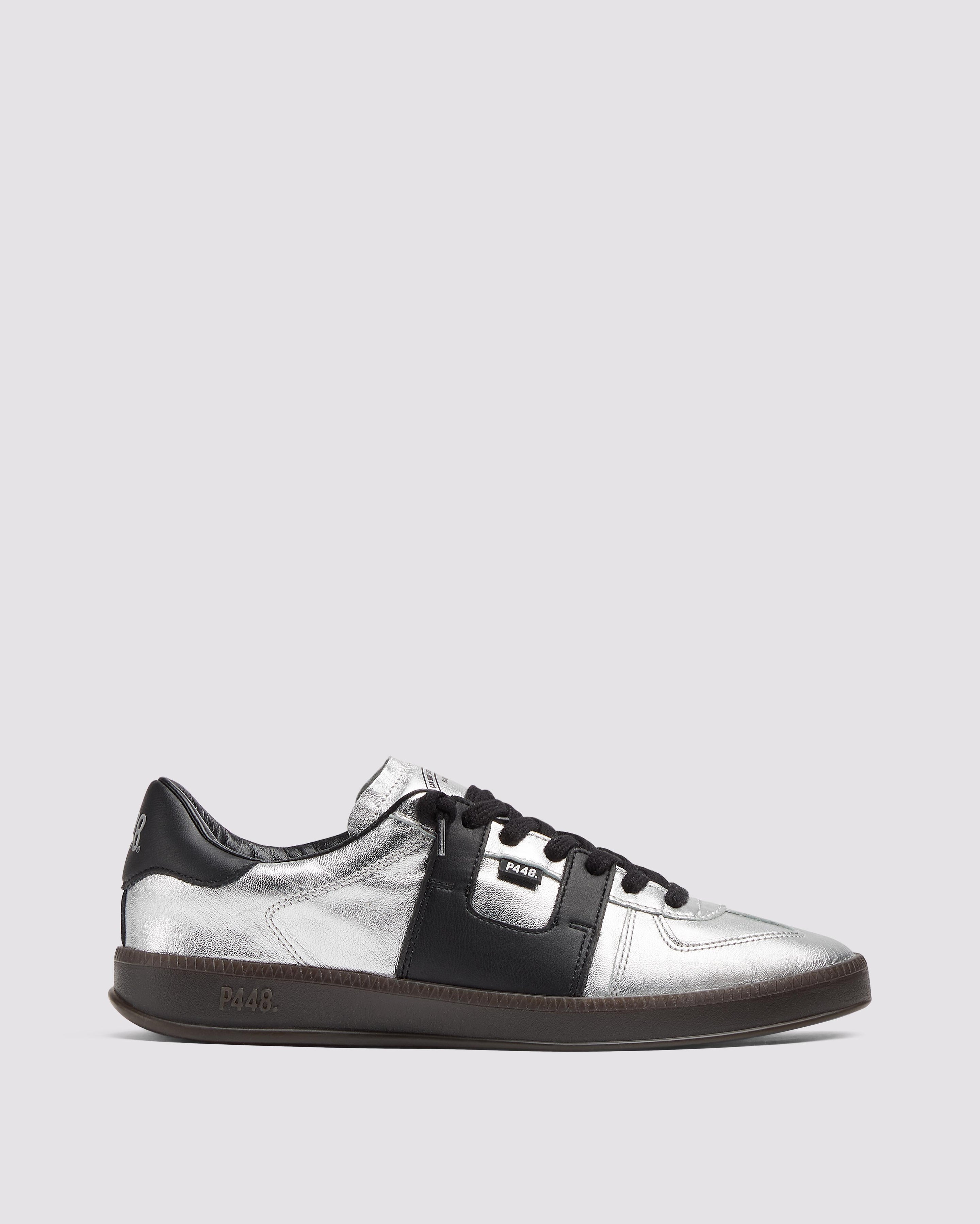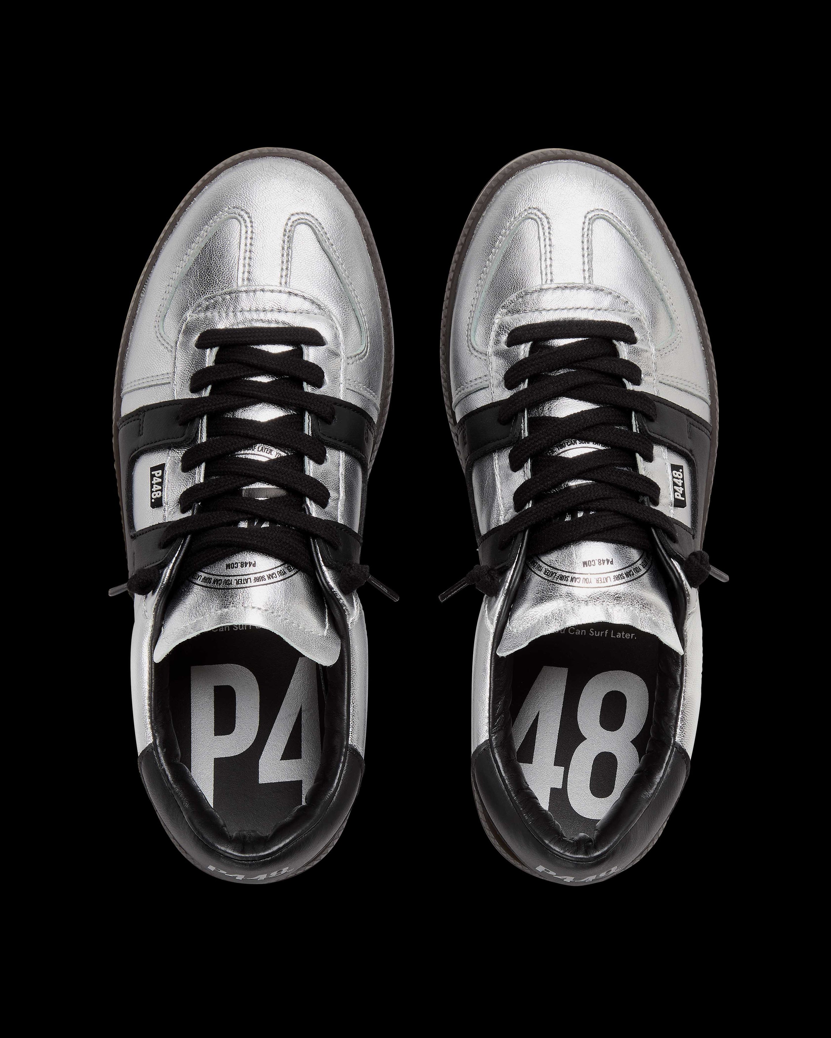 The Monza Silver features all-over silver leather accented by a black leather heel tab & trim. Black cotton laces and our signature P448 dark brown rubber soles finish off the look.