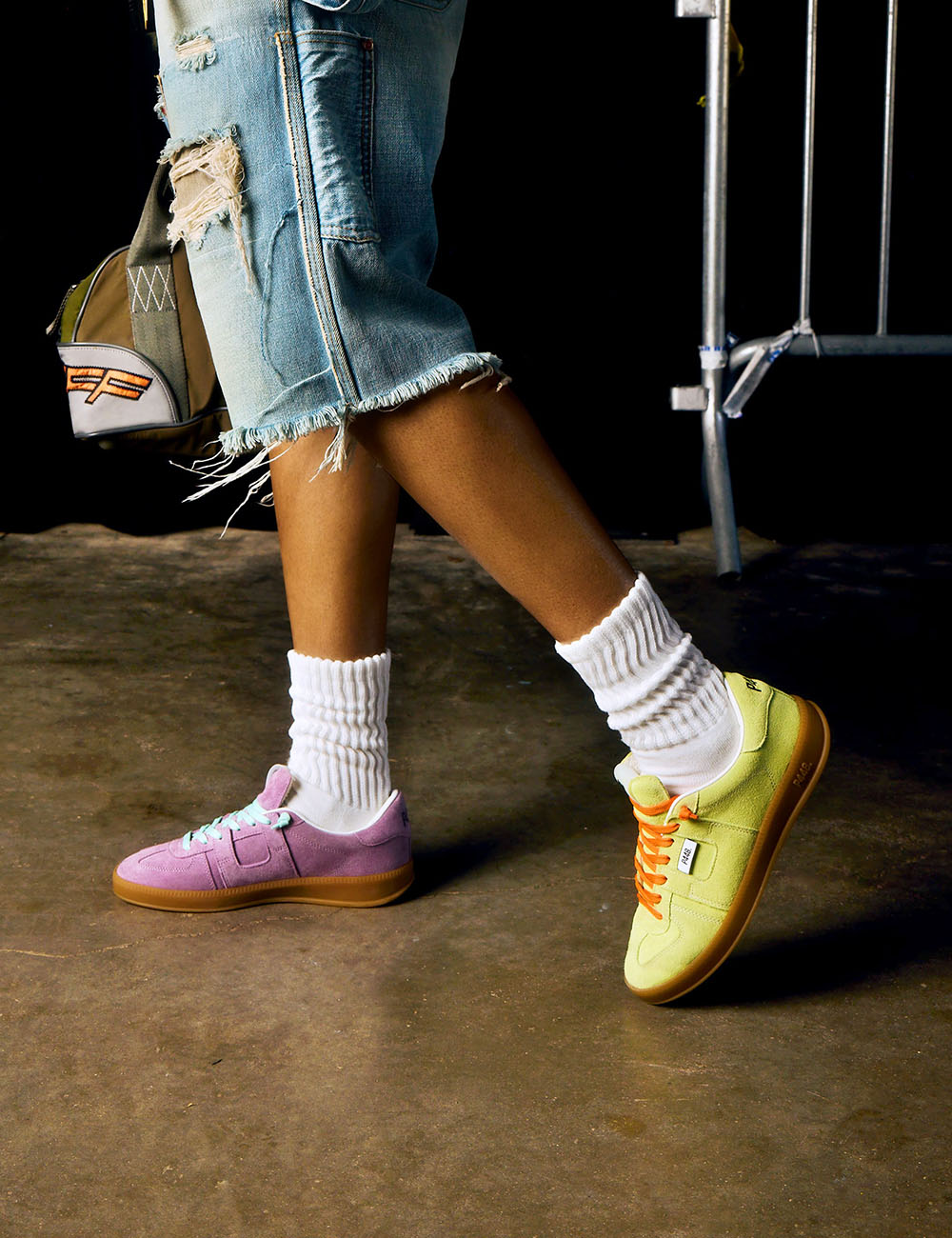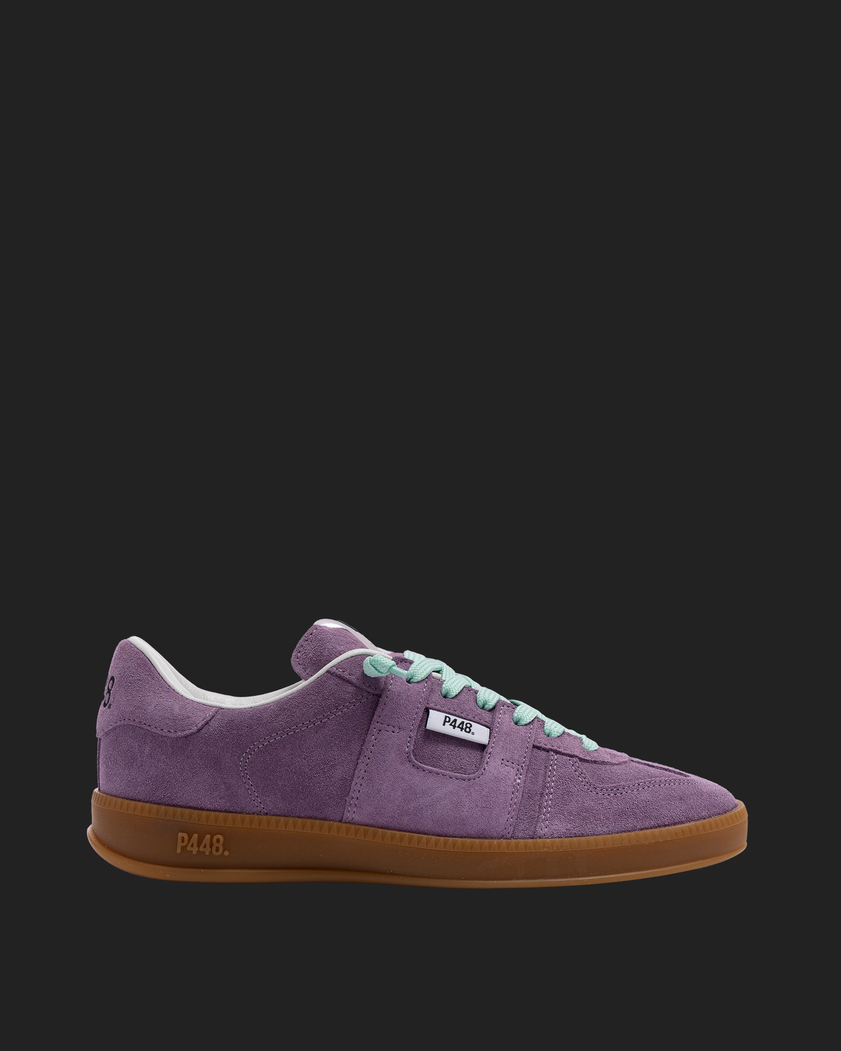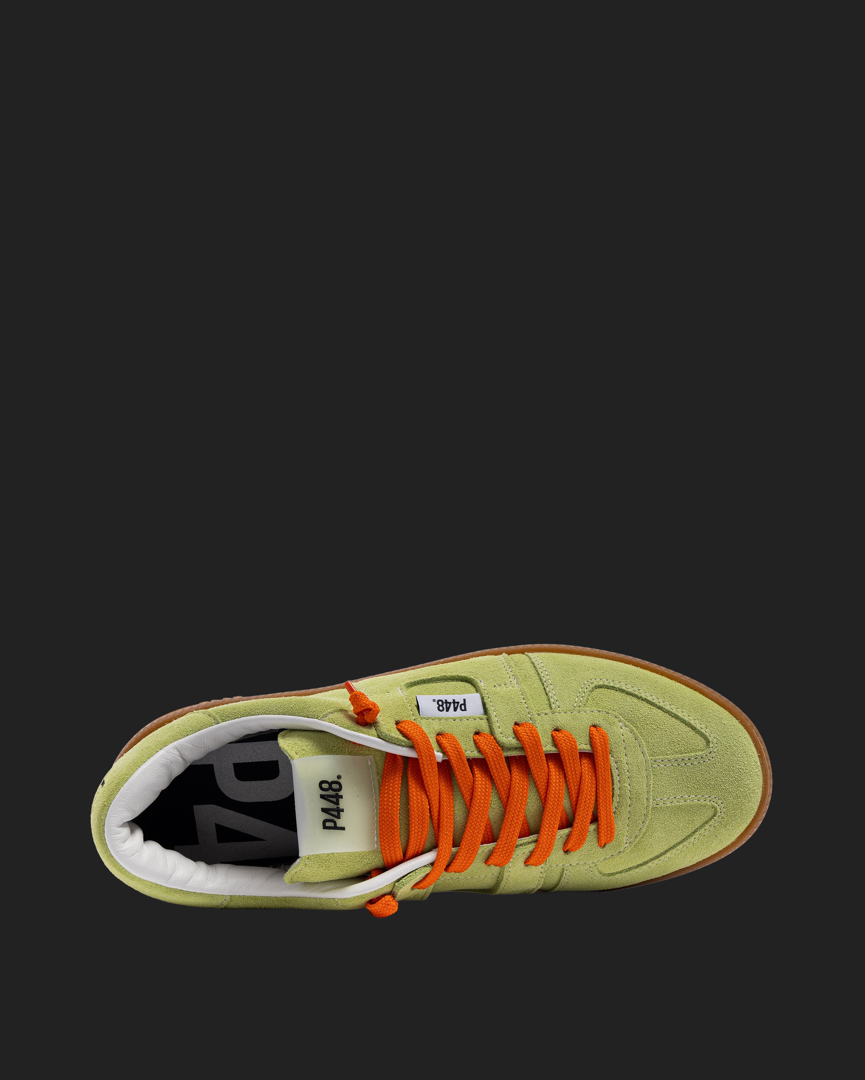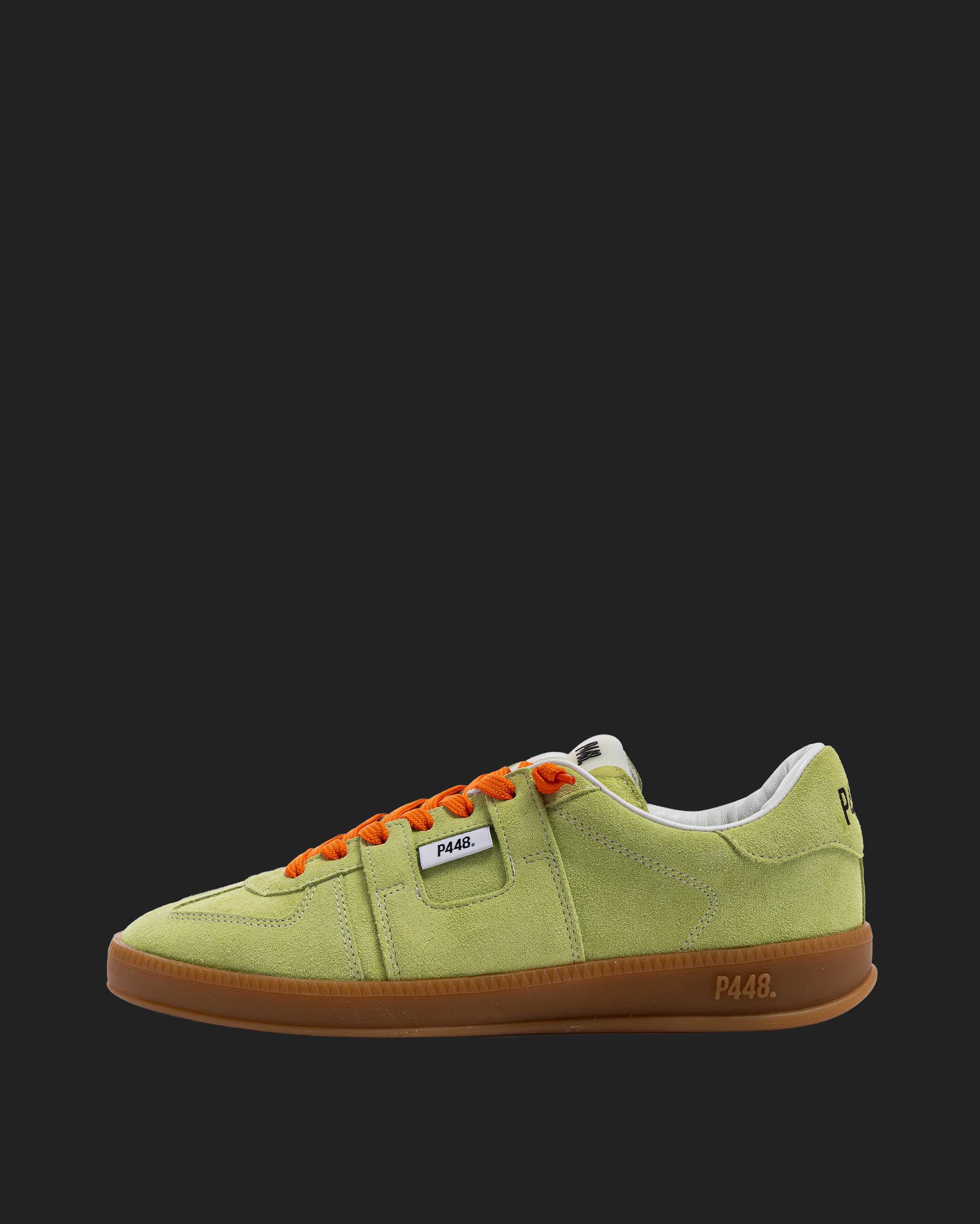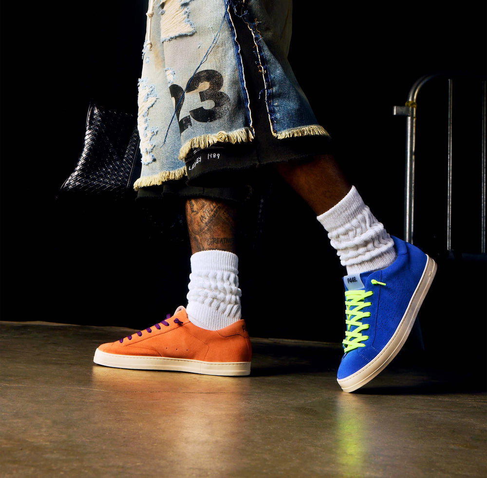 Both feature matching suede tongues, trims, toes, and heel accents. Light blue laces on one and orange laces on the other, along with our signature P448 rubber soles finished with black treads, tie it all together.