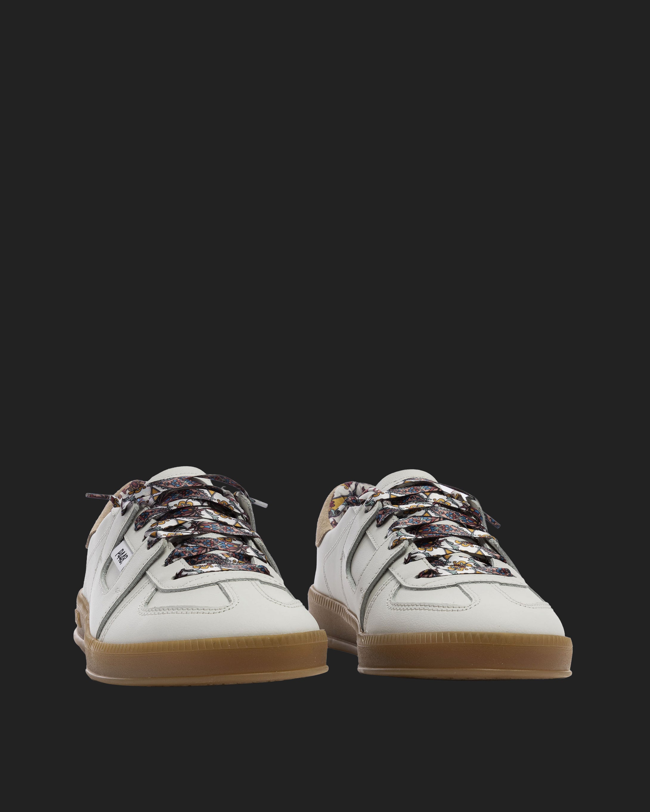 The Monza Birch features all-over white leather complemented by a beige suede heel tab. Satin floral print laces and our signature P448 amber gum soles finish off the look.