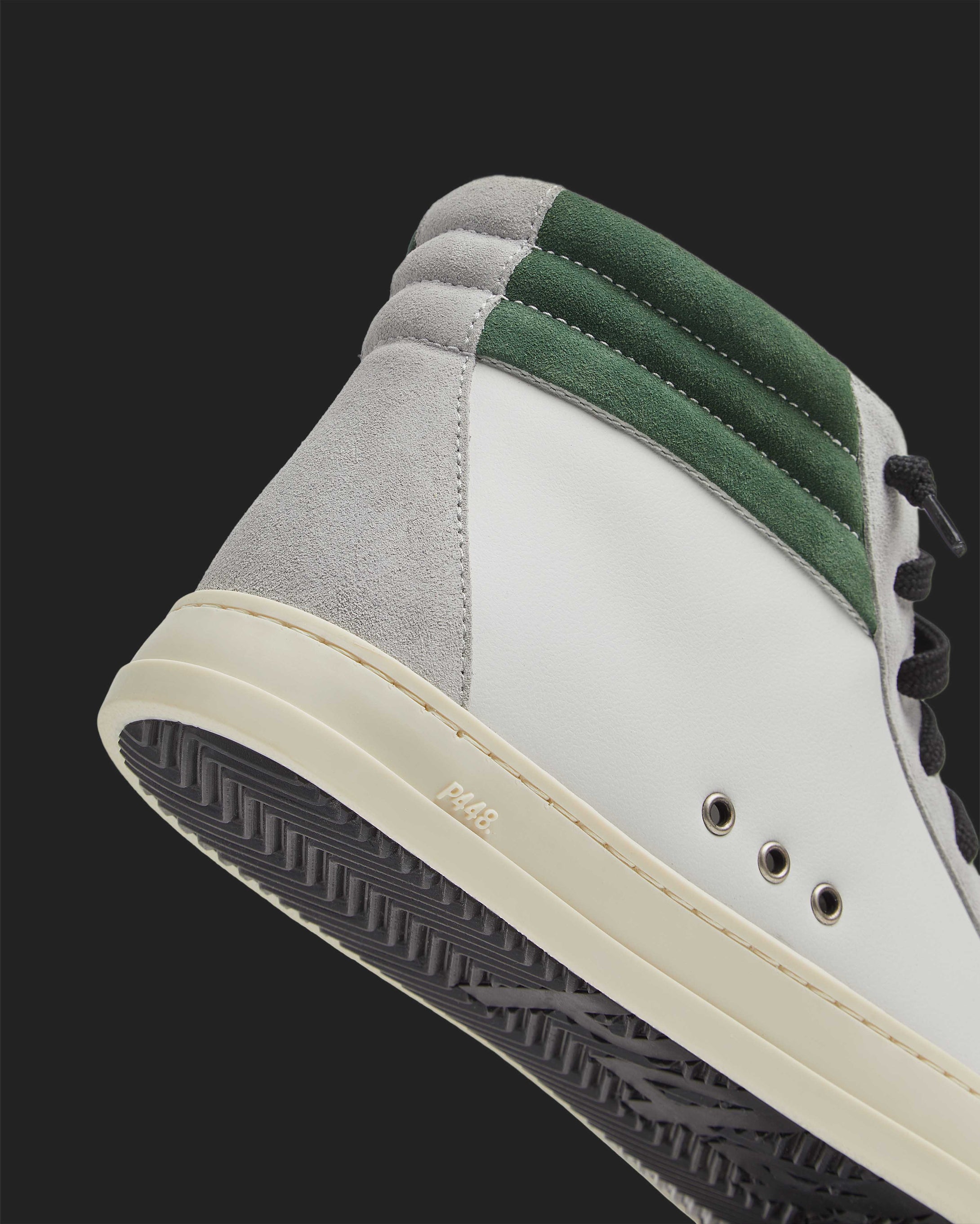 The Skate Vale features all-over white leather, complemented by a green suede tongue with light grey suede trims and heel. Black laces and matching black treads finish off the look. Plus, the interior side zipper makes it easy to slide them on and off.