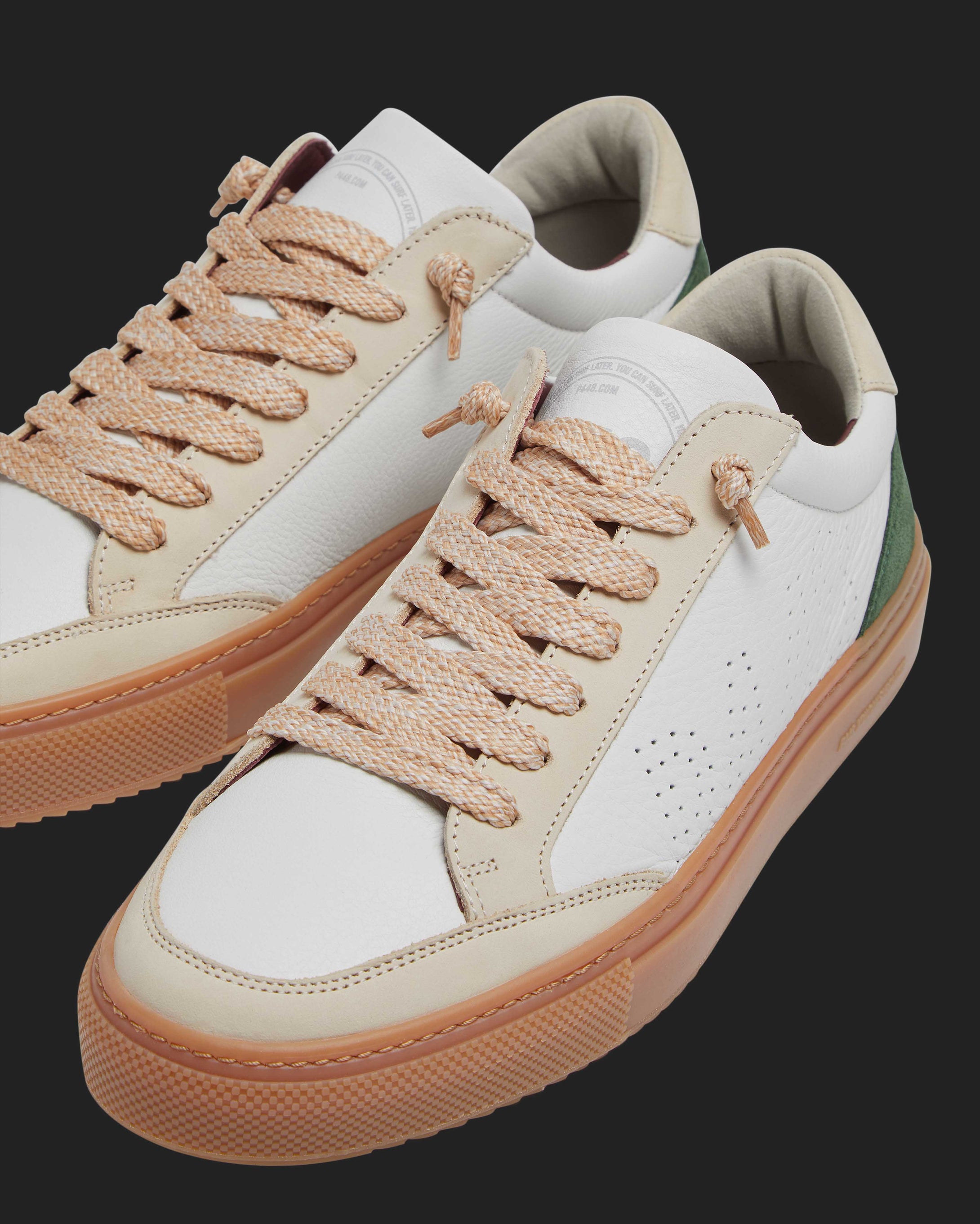The Soho Palm is wrapped in white leather and complemented by a cream nubuck leather tongue, heel tab and trim with a green suede heel accent. White and camel laces and our signature P448 amber gum soles finish off the look.