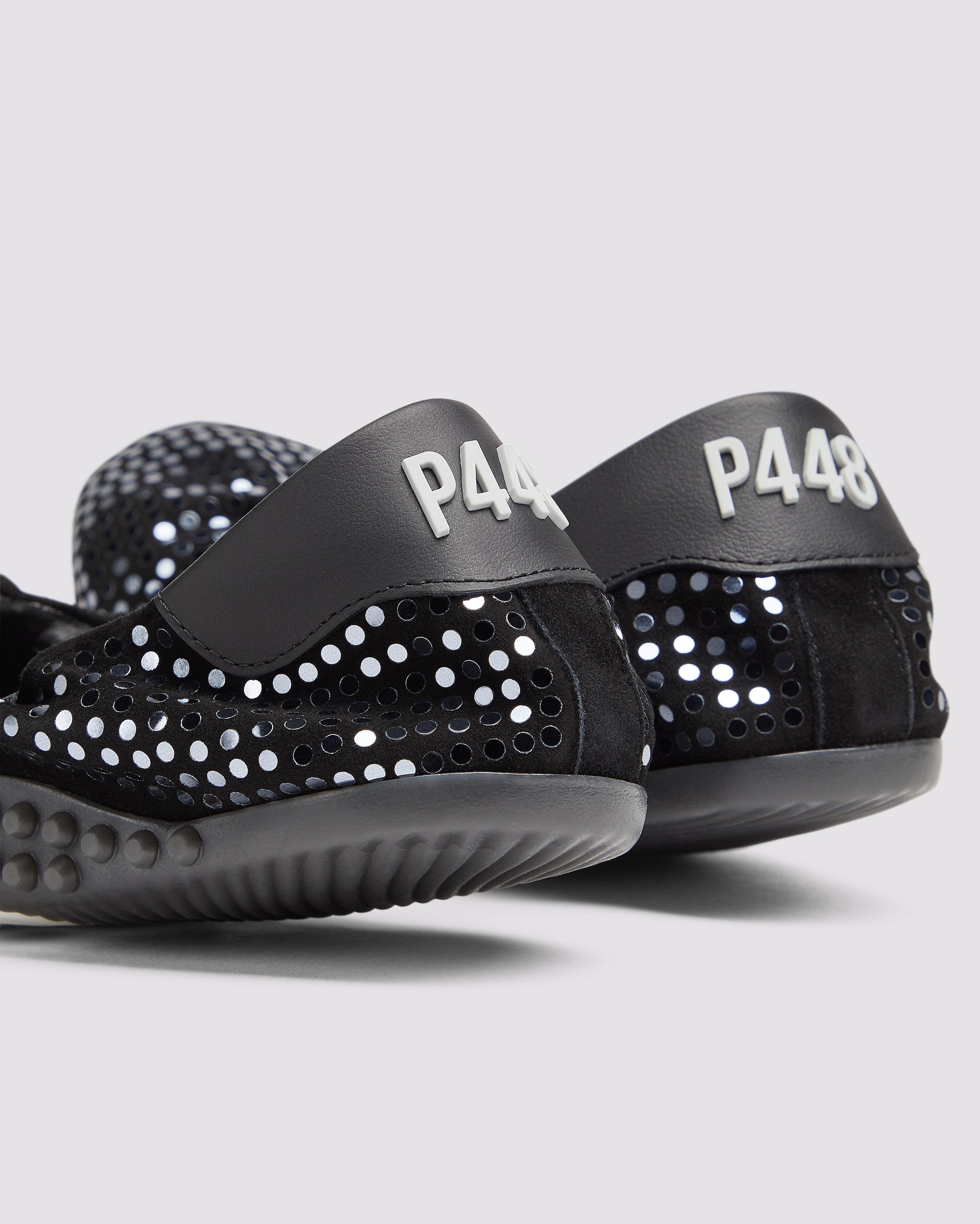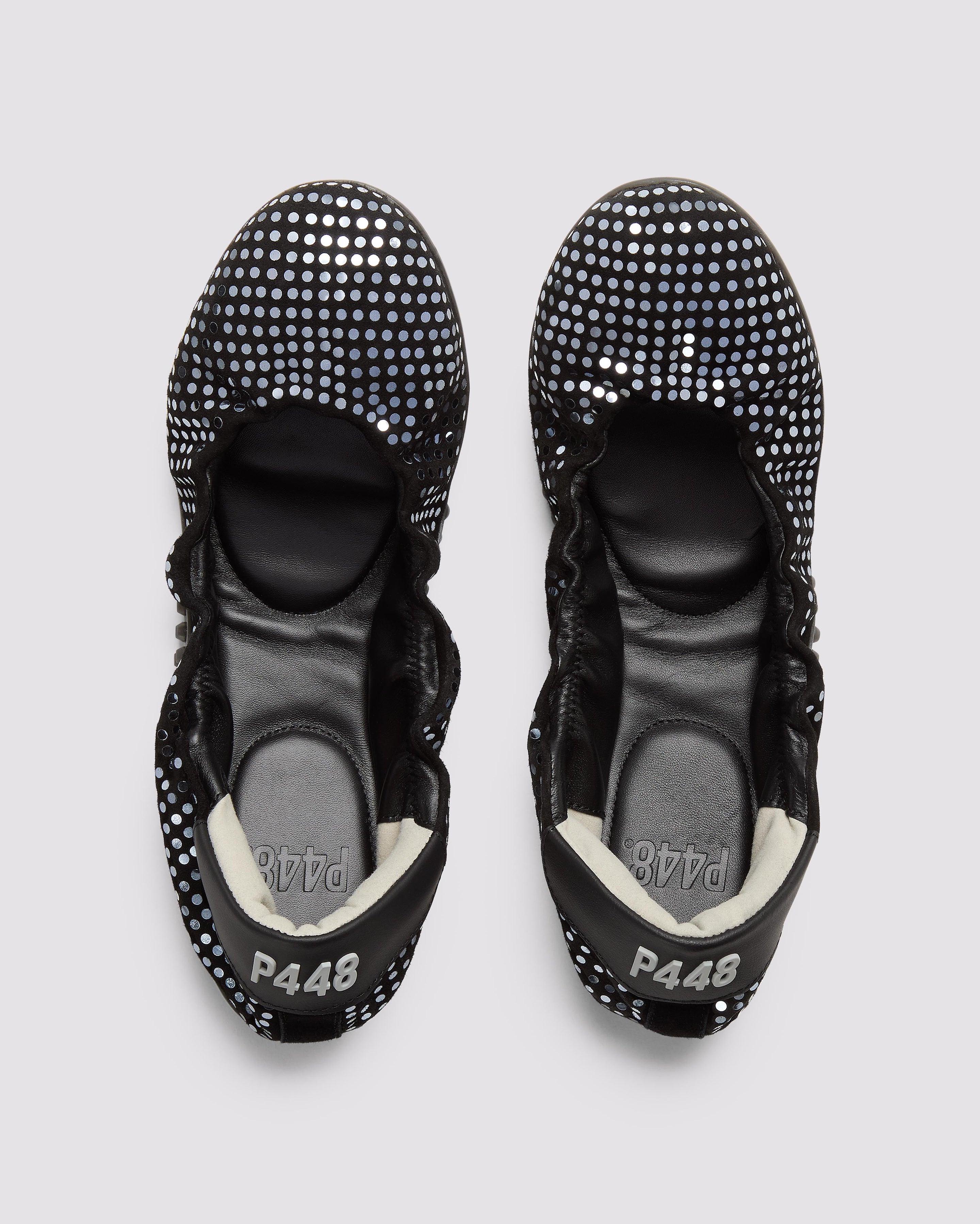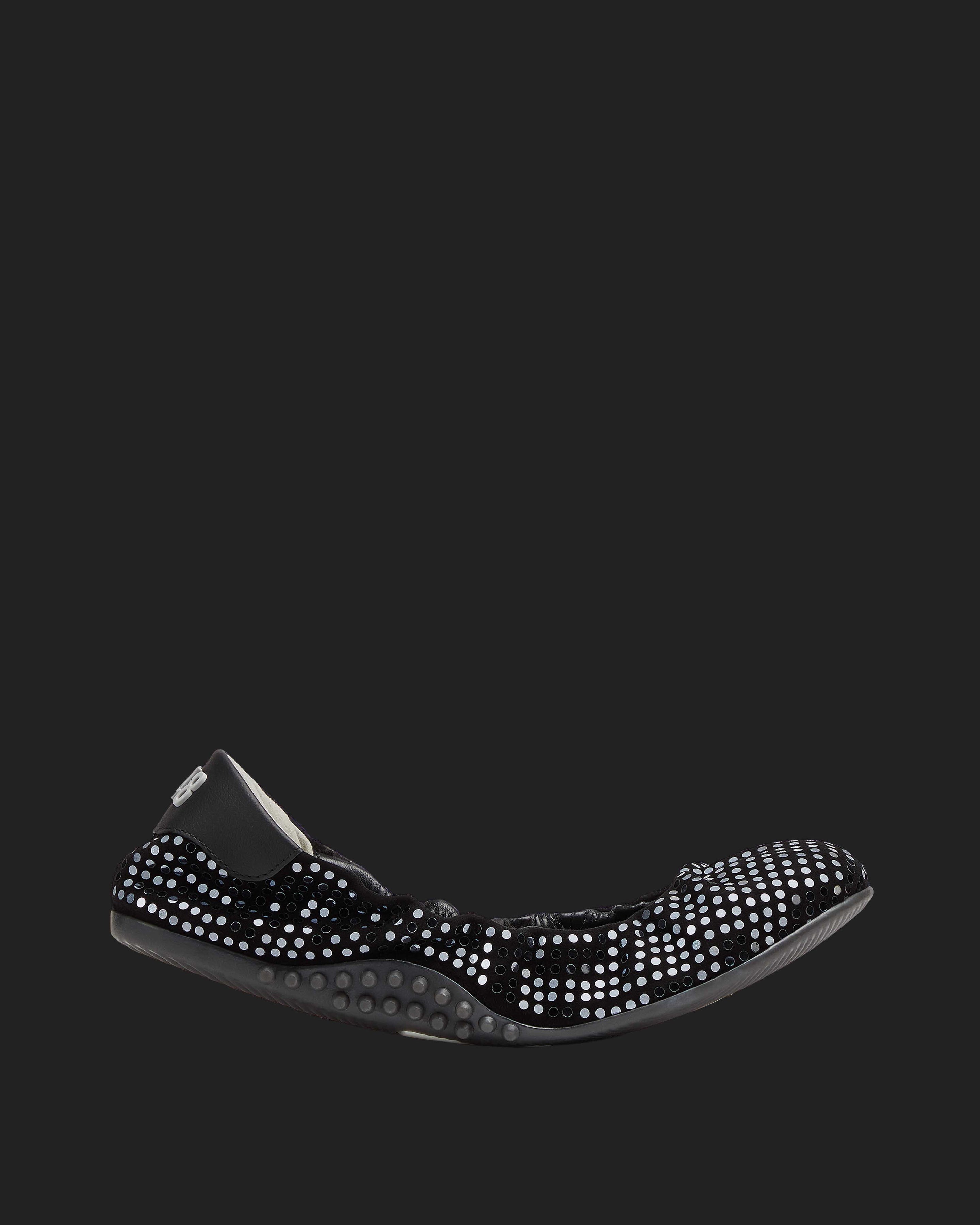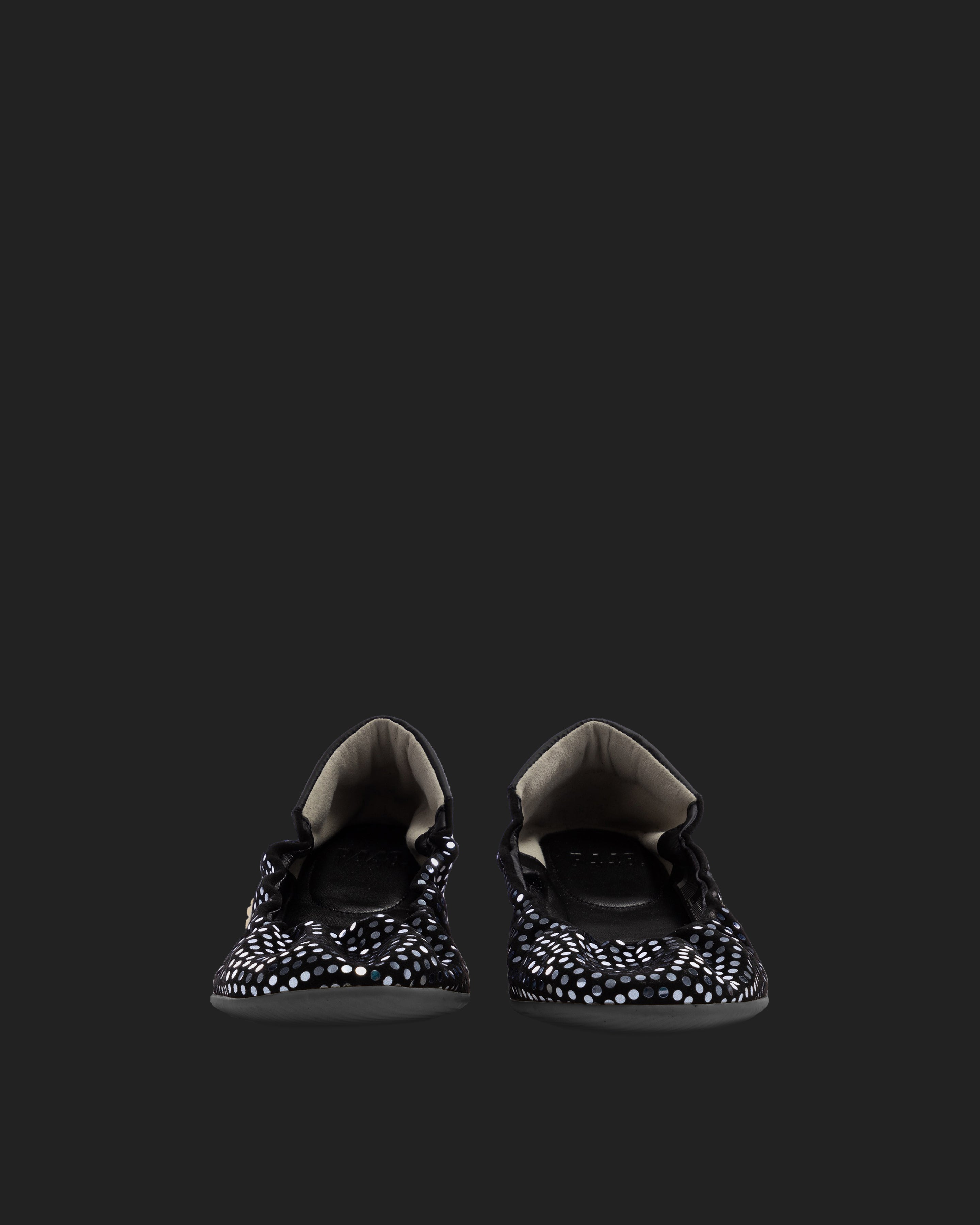 The Stella Black/Silver is the studded flat that always makes a statement. It features an all-over black suede design embellished with silver paillettes and a black leather heel tab. Our P448 raised black rubber soles finish off the look.