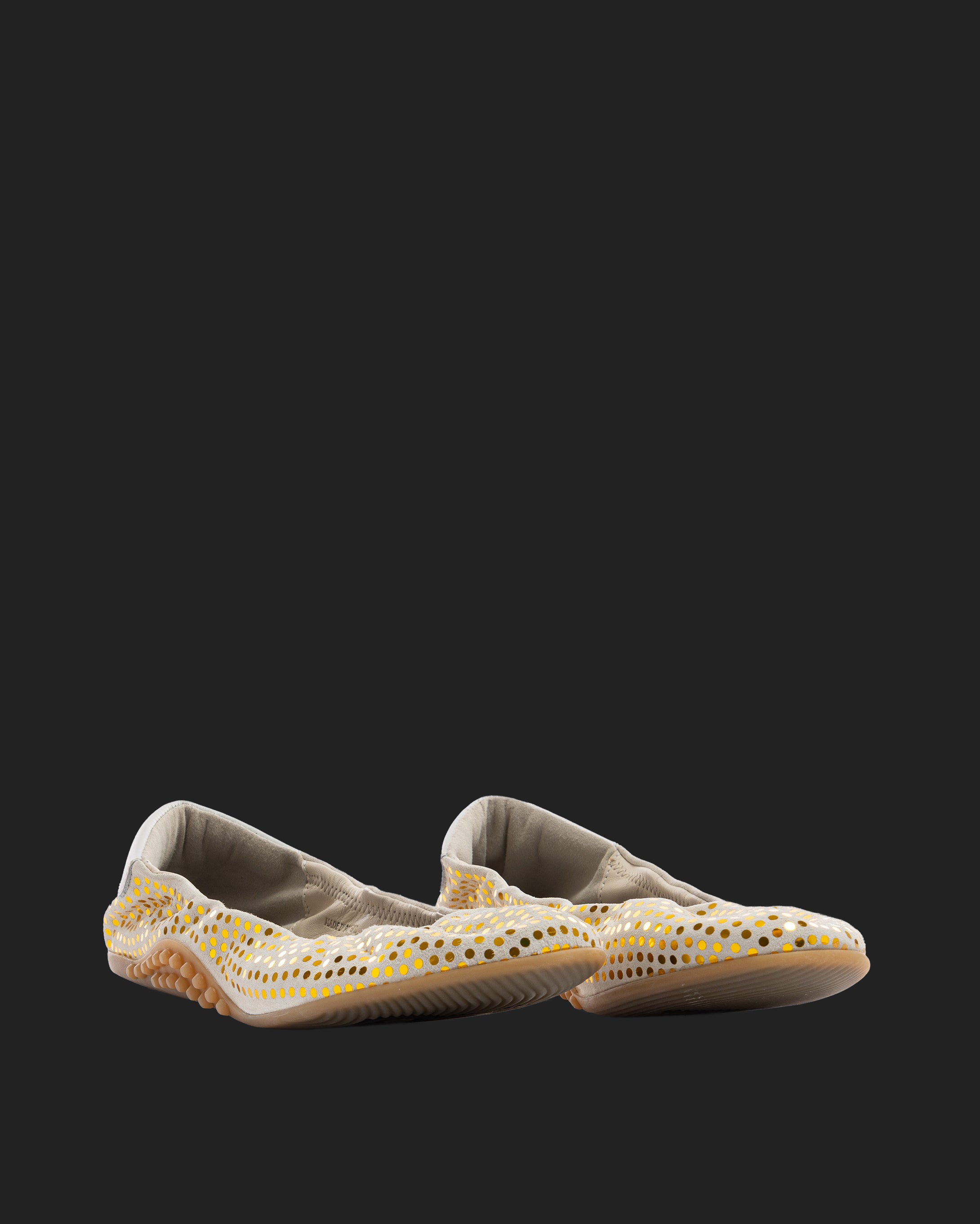 The Stella White/Gold is the studded flat that always makes a statement. It features an all-over cream suede design embellished with gold paillettes and a white leather heel tab. Our P448 raised brown rubber soles finish off the look.
