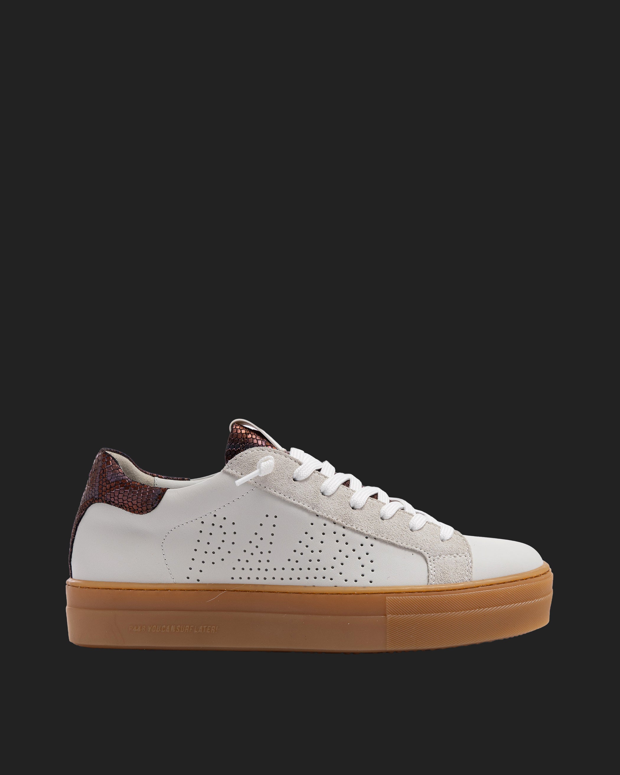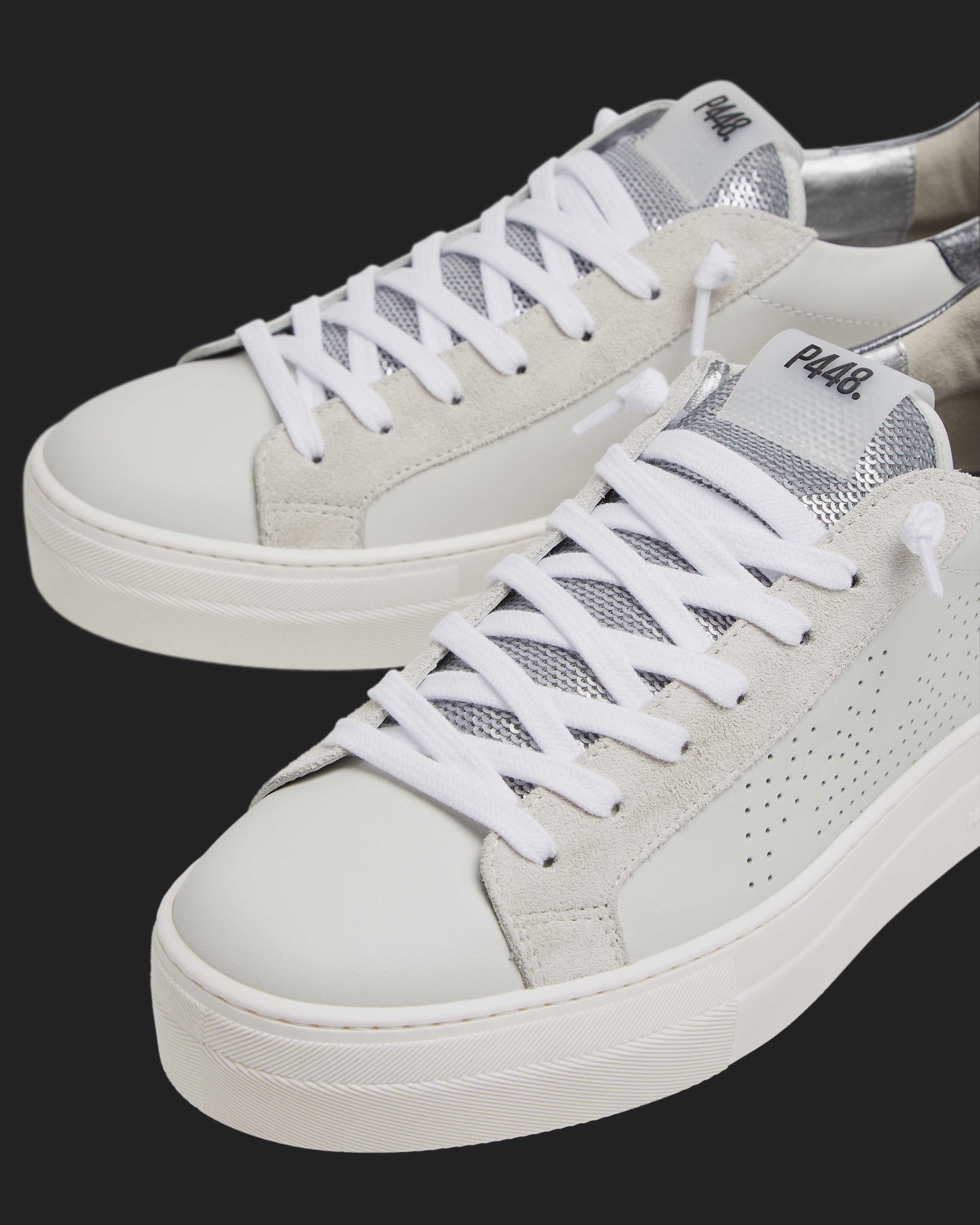 The Thea Pearl is wrapped in white leather and suede, accented by a grey metallic leather heel tab and tongue embellished with silver paillettes. White cotton laces and our signature P448 platform rubber soles finish off the look. This playful platform runs small, so be sure to size up if you’re in between.