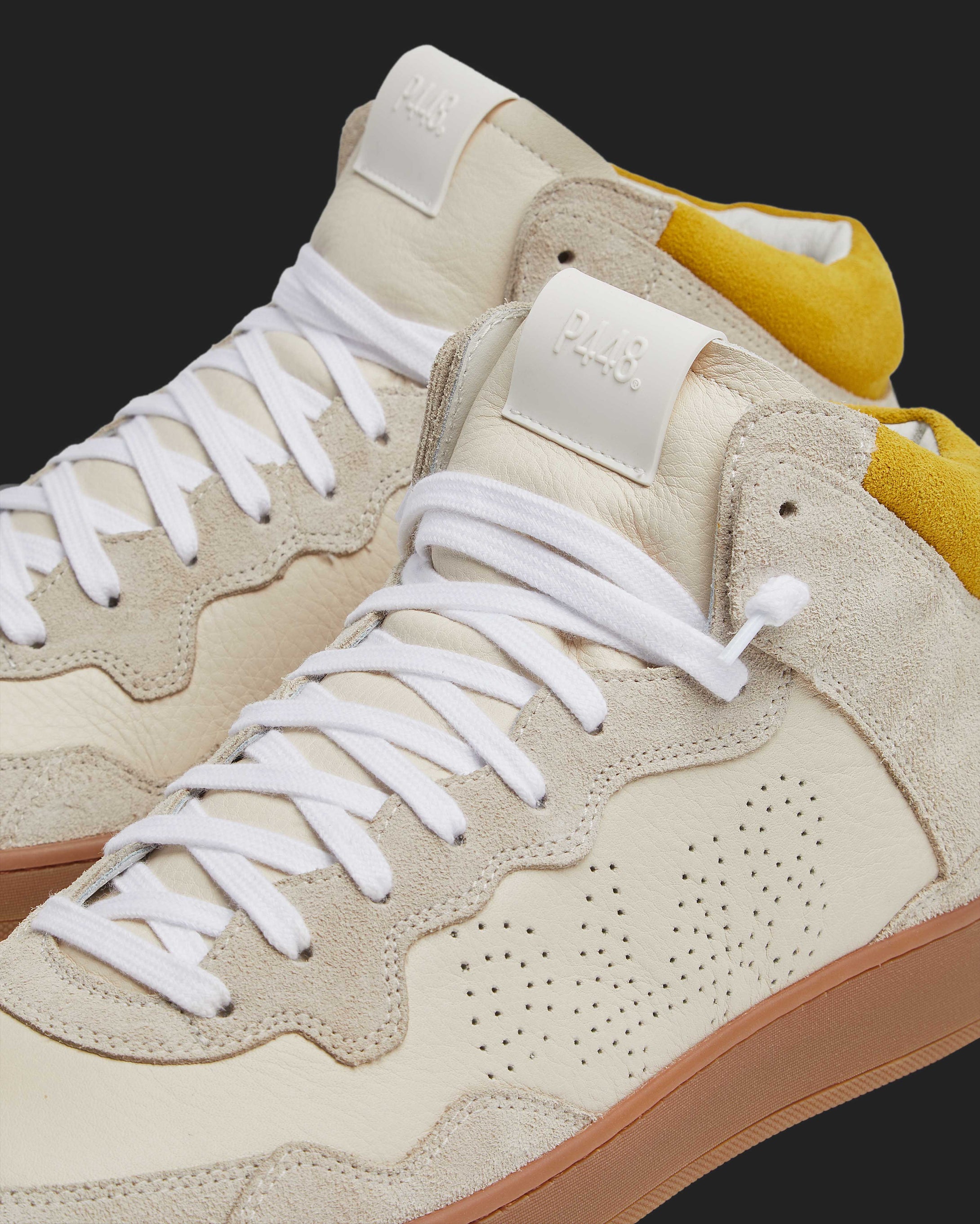 The Vert Mid Senlia is wrapped in cream leather with beige suede trims, all accented by a yellow suede heel shaft and white cotton laces. Our signature P448 amber gum soles are crafted with skaters in mind, featuring a herringbone tread and pivot point for extra grip and ultimate comfort.
