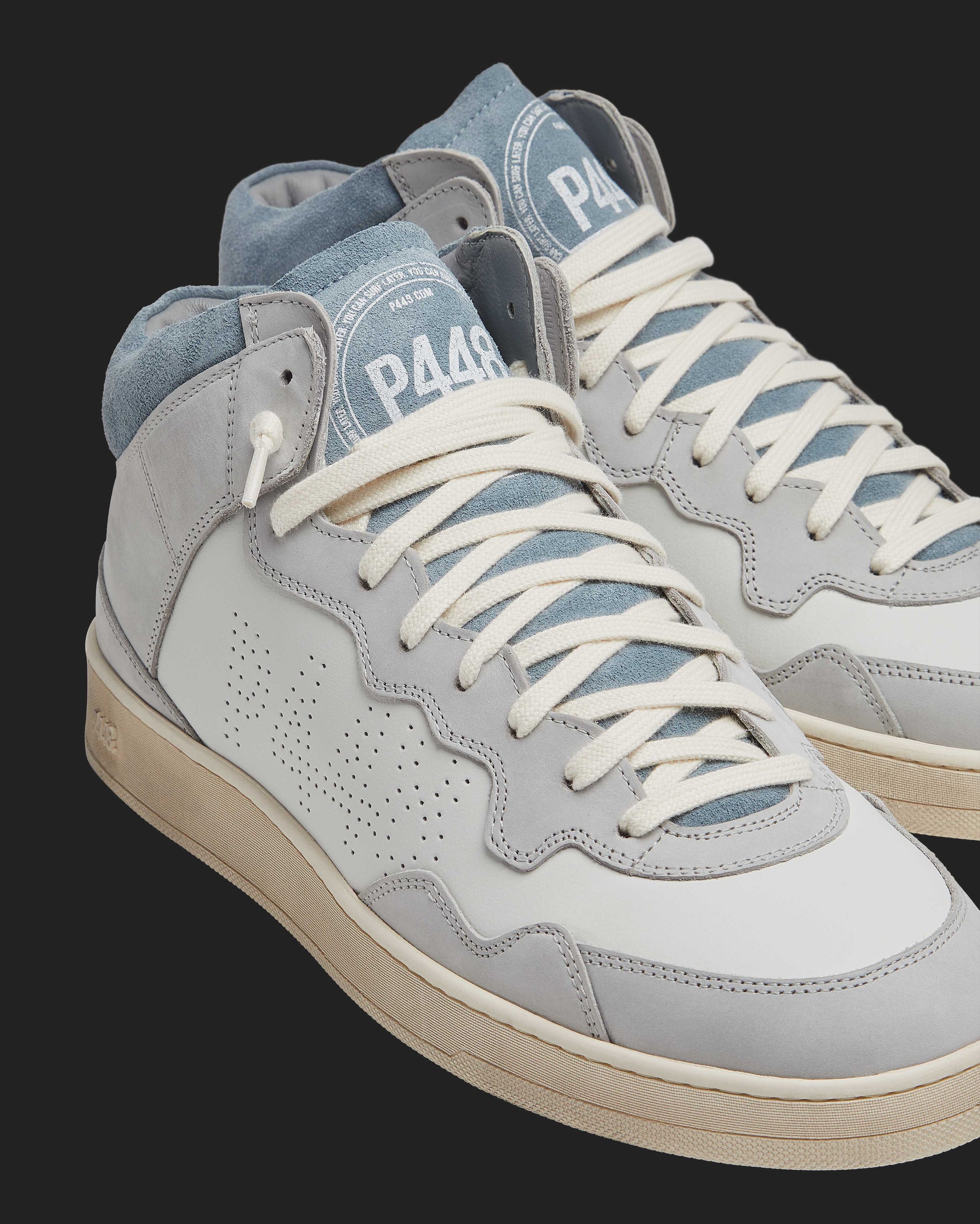 The Vert Mid Blone is wrapped in white leather with grey nubuck leather trims, all accented by a blue suede heel shaft and white cotton laces. Our signature P448 hand-distressed rubber soles are crafted with skaters in mind, featuring a herringbone tread and pivot point for extra grip and ultimate comfort.