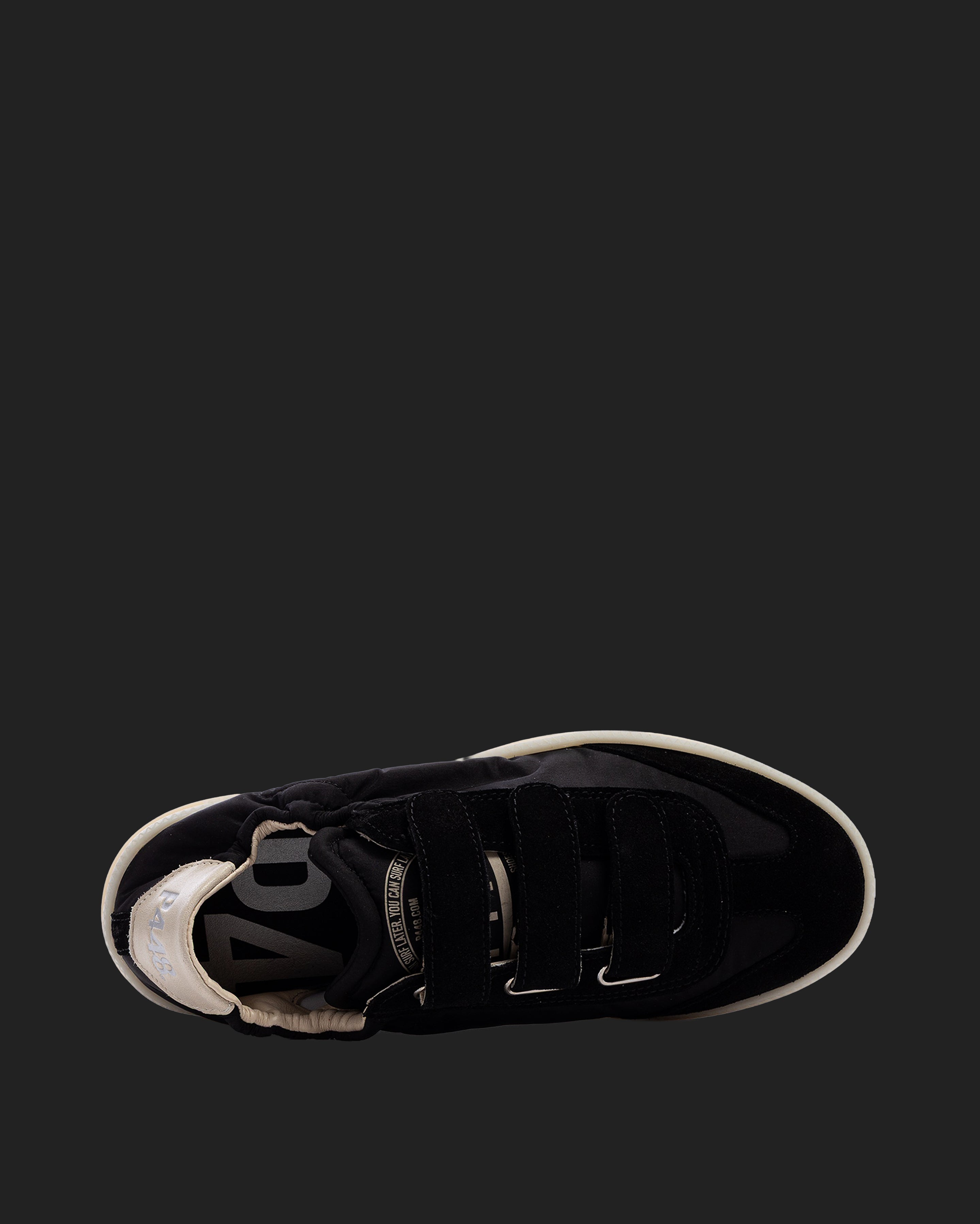 Slip into the Capri Nylon Black for a sleek look and lightweight feel. The deconstructed black nylon is complemented by black suede accents and hook and loop straps with a contrasting cream leather heel tab. The scrunched elastic heel is designed for easy-on, easy-off wear and the cream semi-transparent rubber tread grounds the look.