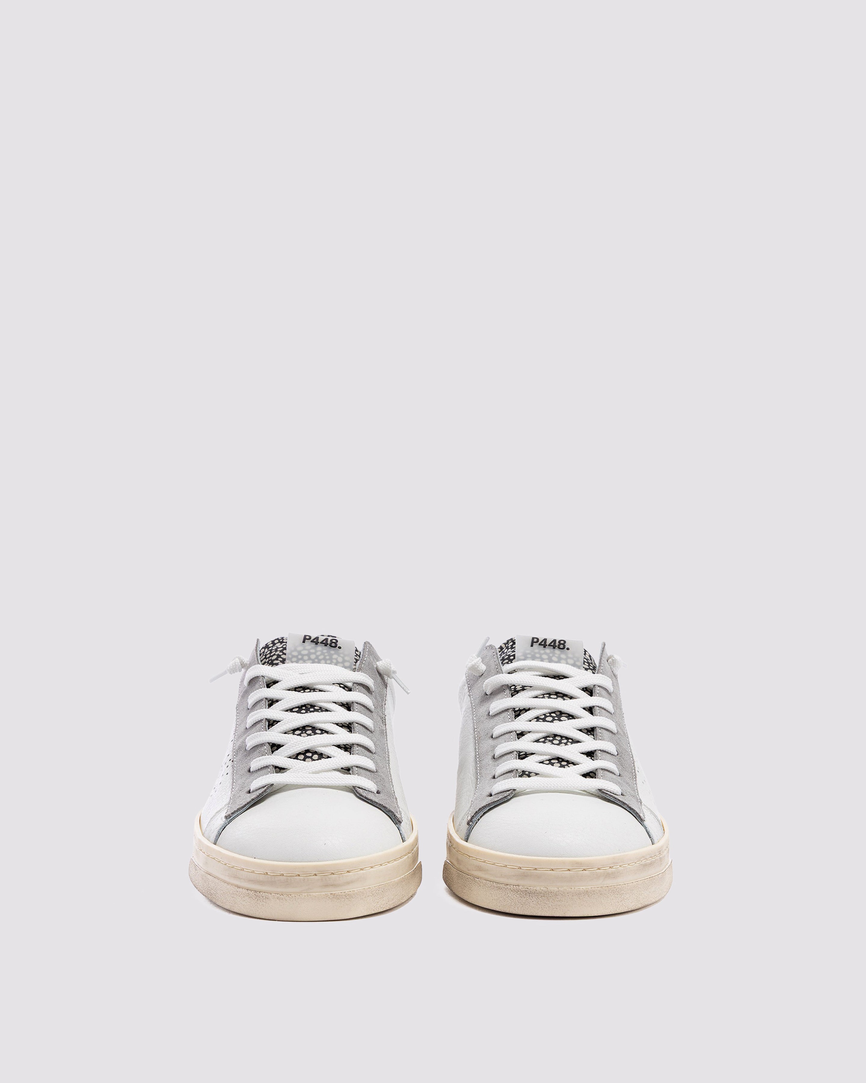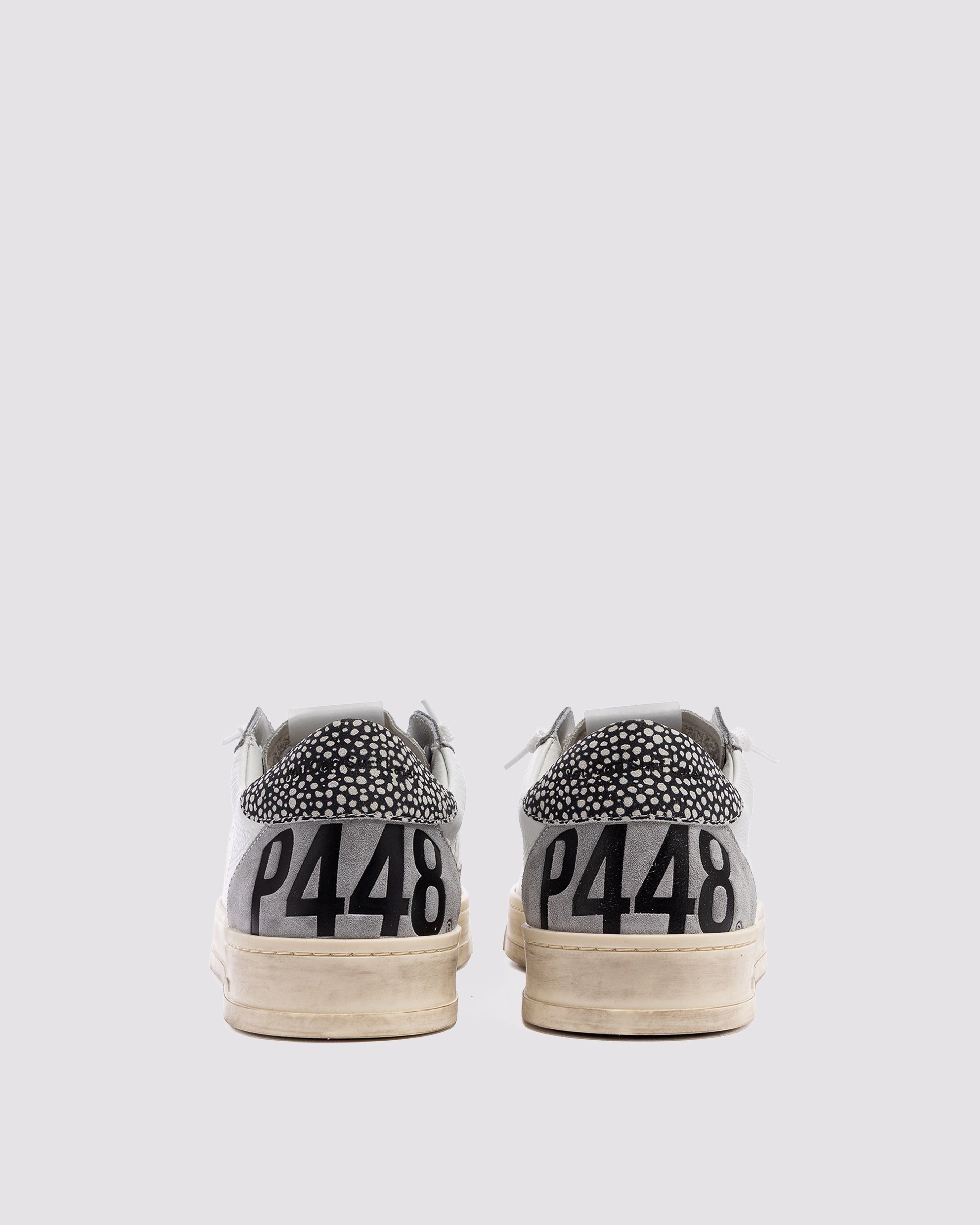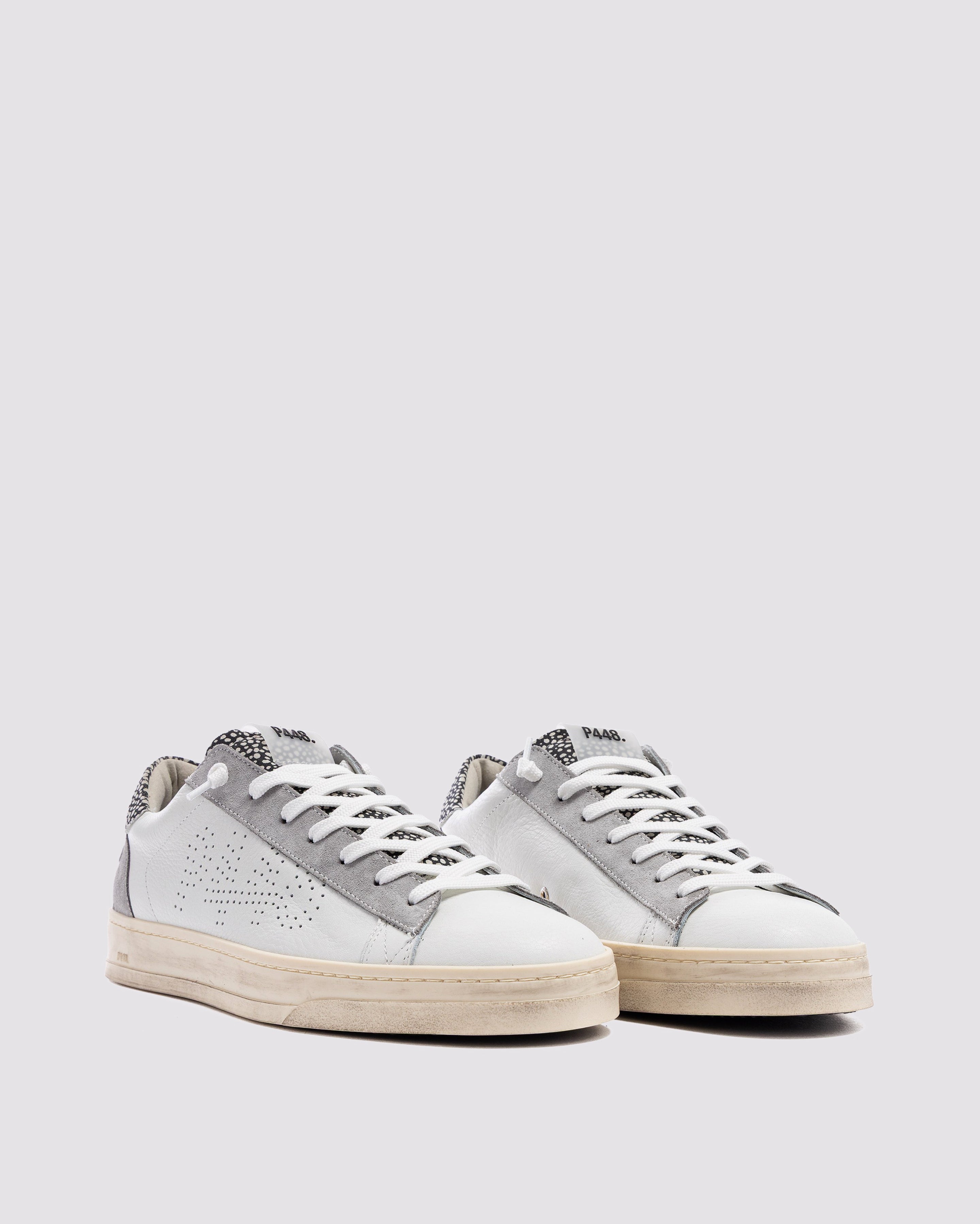 The Jack Spot White features all-over white leather and suede, complemented by grey suede and white-and-black speckled suede accents. White laces, our signature P448 hand-distressed rubber sole and black tread ground the look. Swap in the extra pair of dark grey laces to tie it all together.