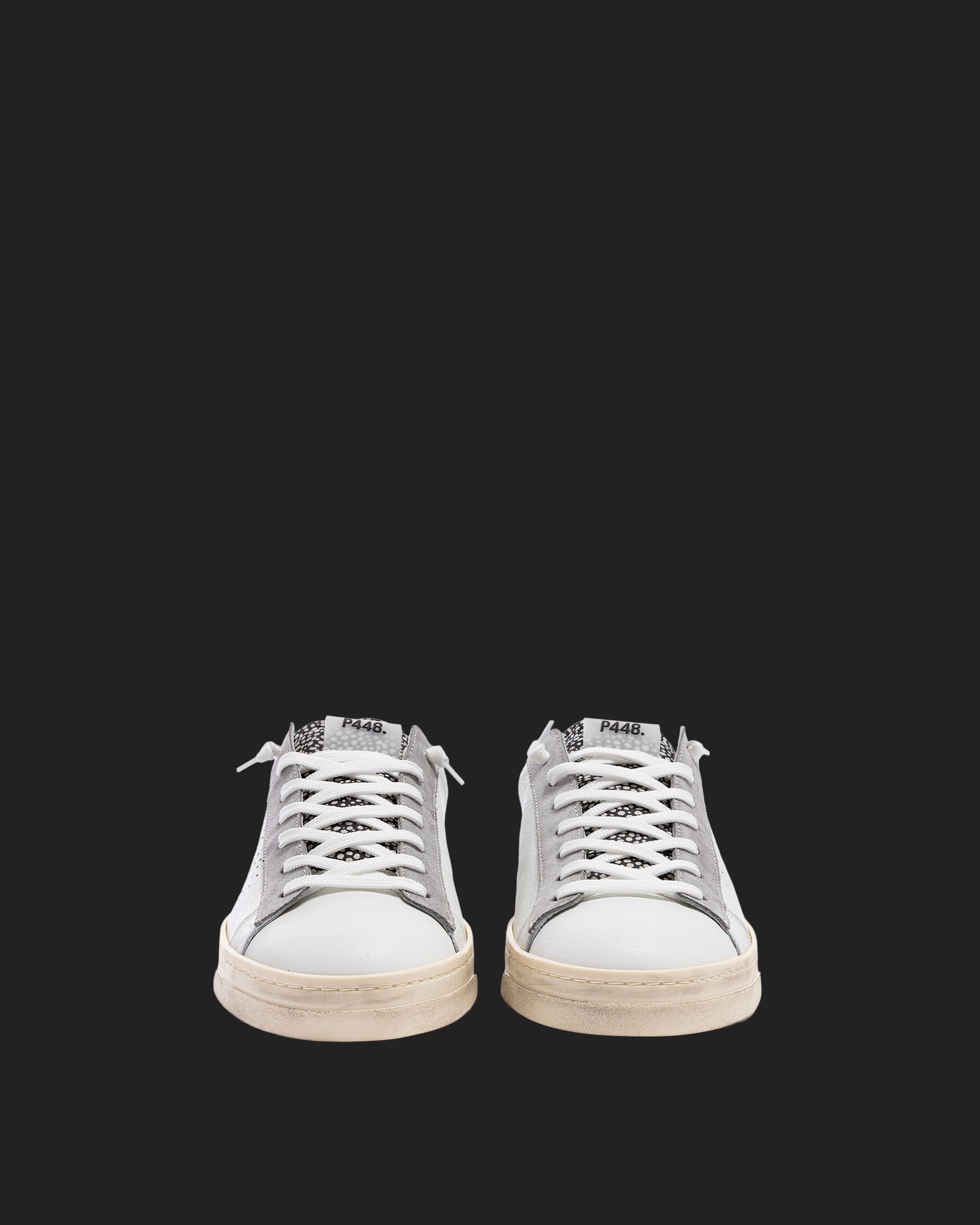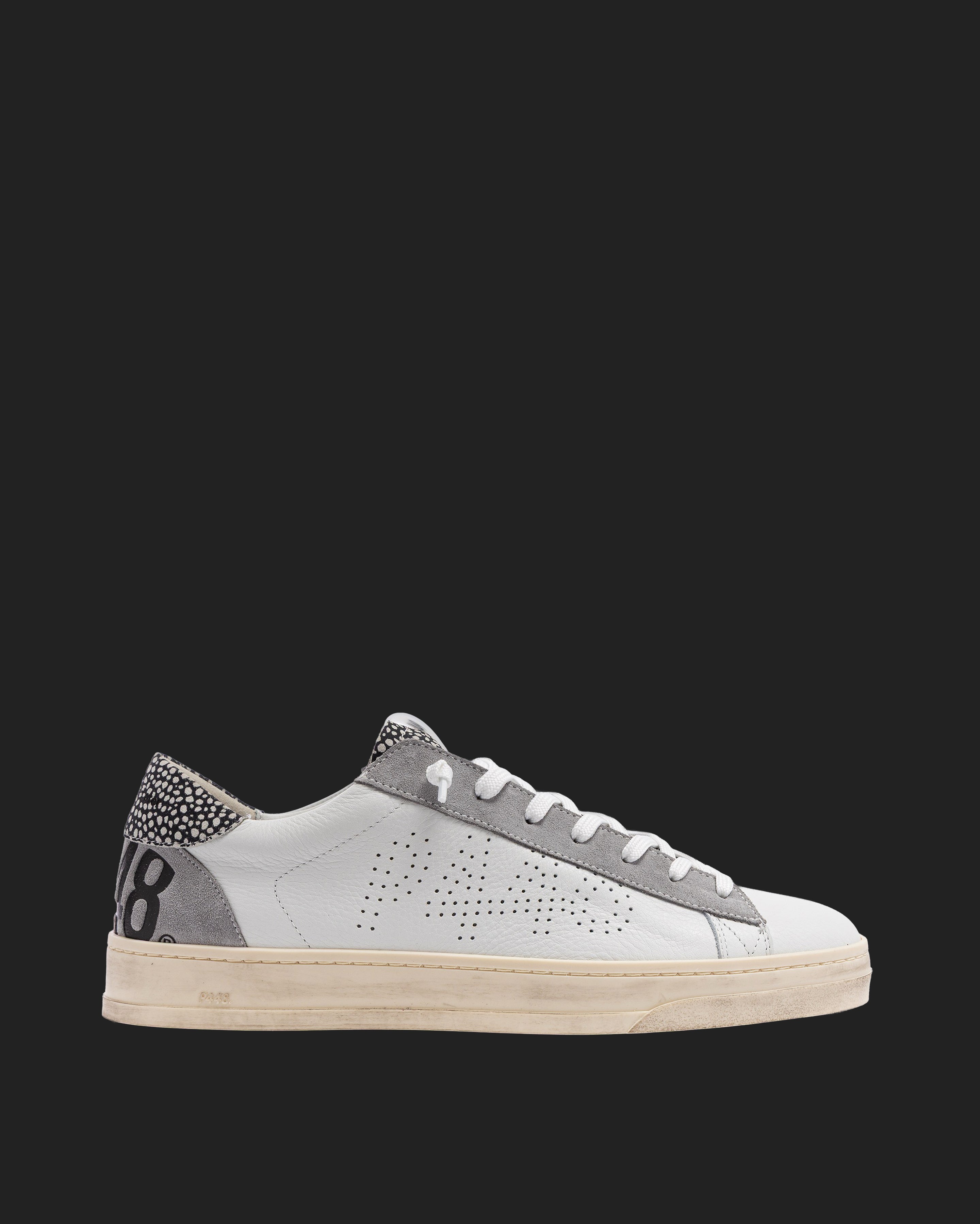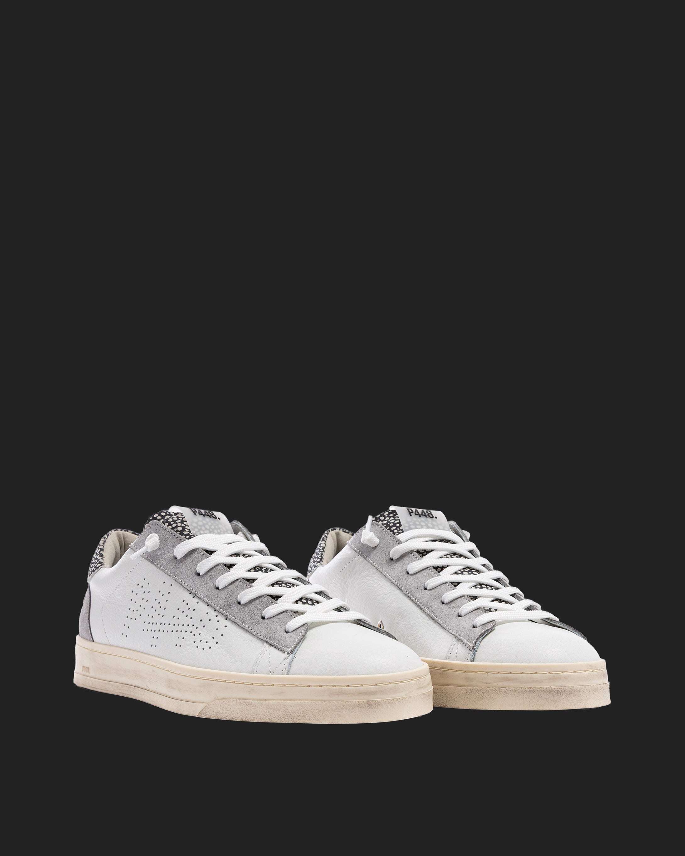 The Jack Spot White features all-over white leather and suede, complemented by grey suede and white-and-black speckled suede accents. White laces, our signature P448 hand-distressed rubber sole and black tread ground the look. Swap in the extra pair of dark grey laces to tie it all together.