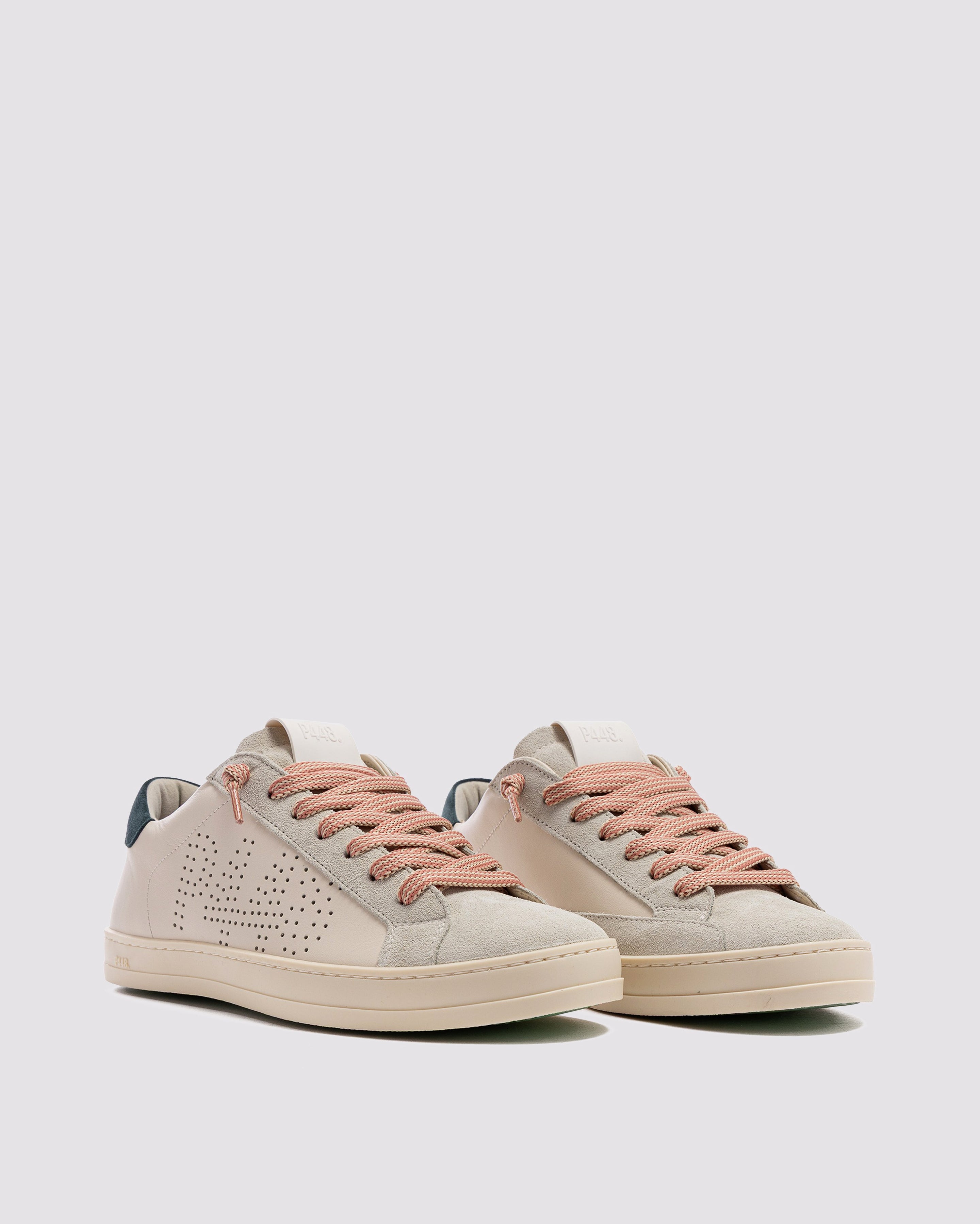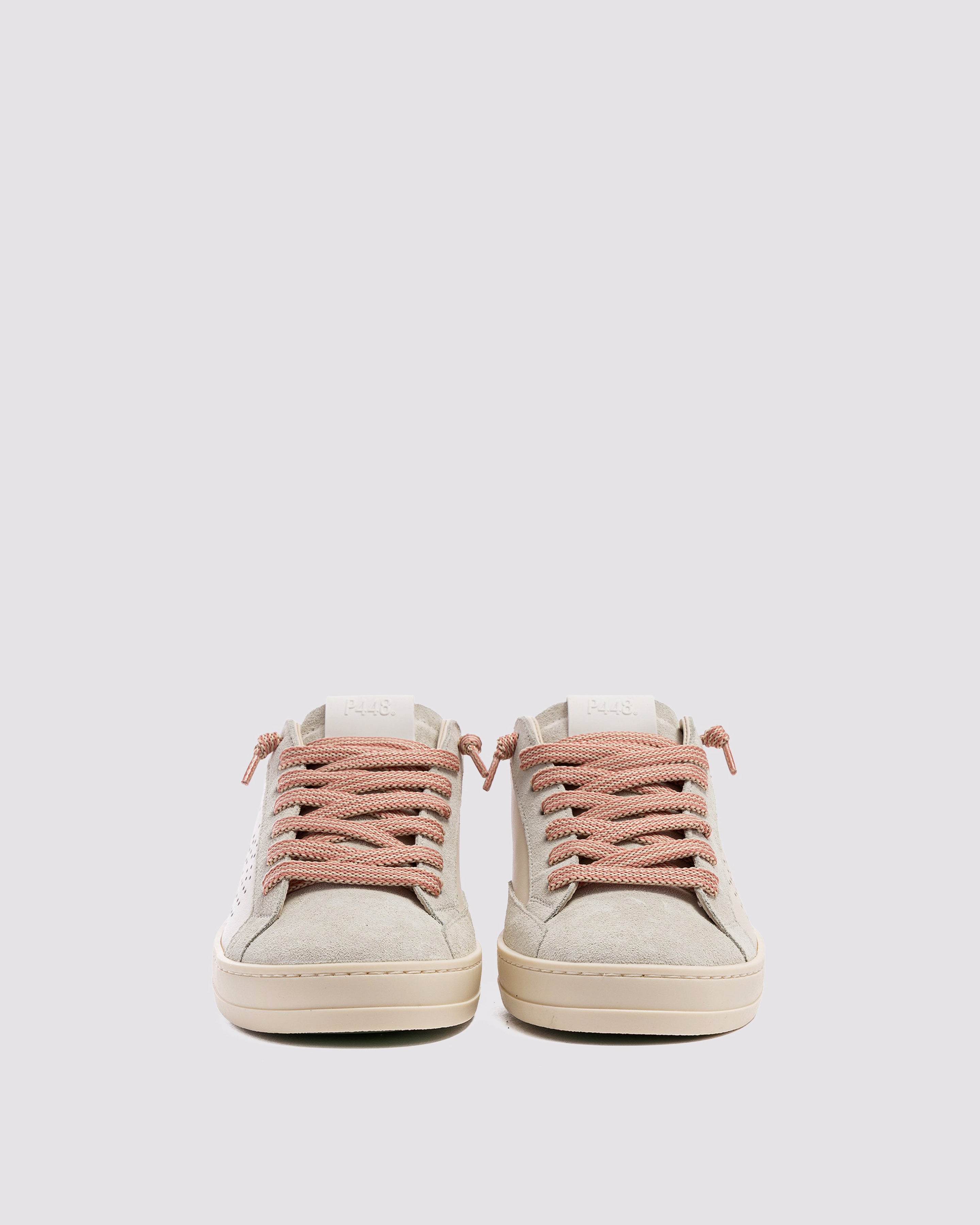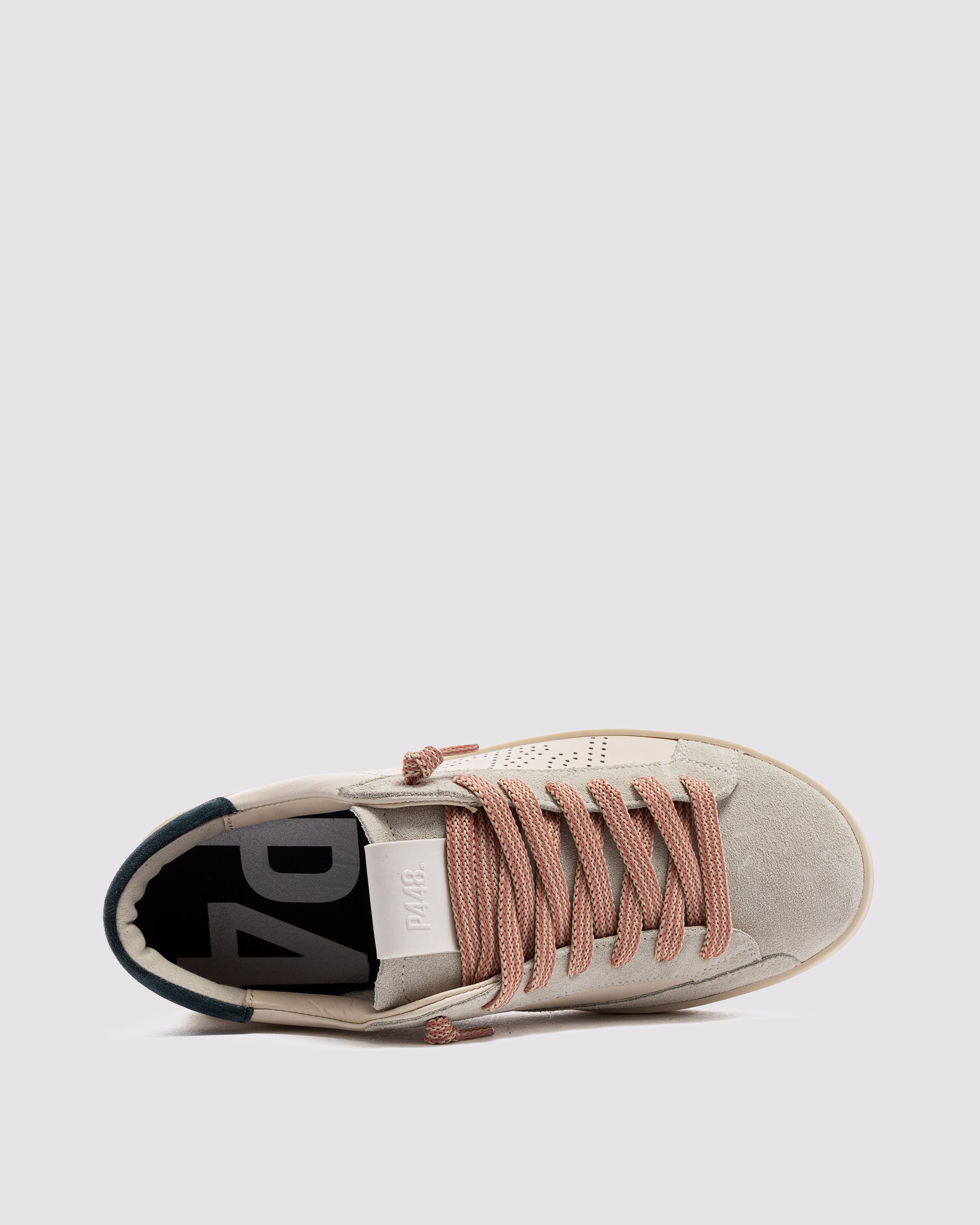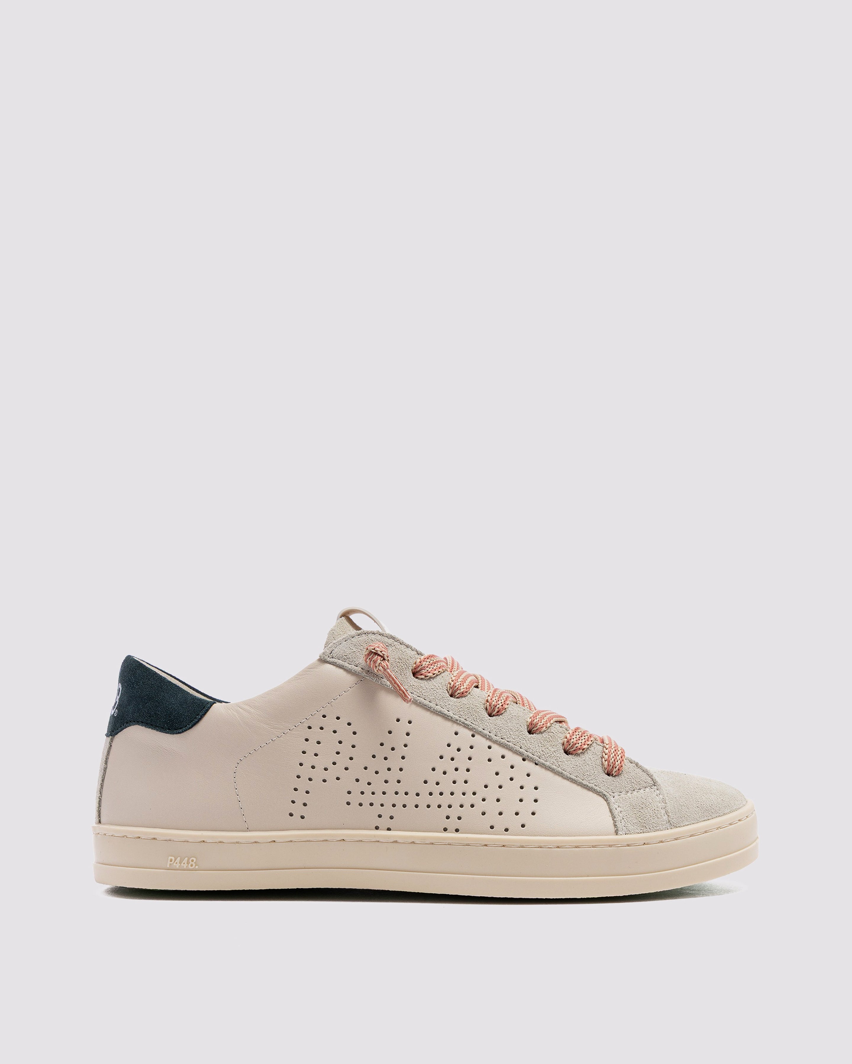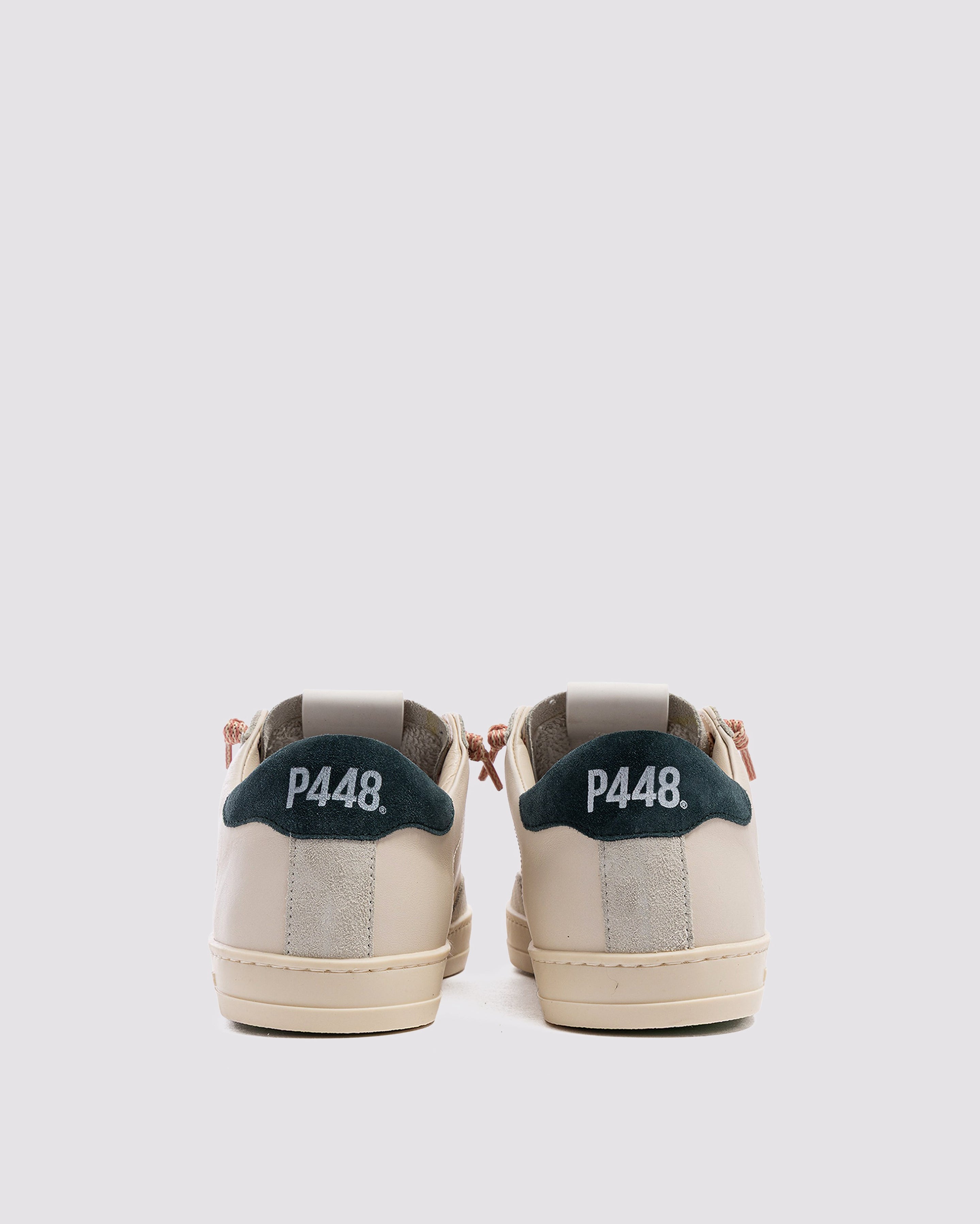 The John Cream Rose is wrapped in cream leather and suede accented by a green suede heel tab and complementary pink and beige laces. Our signature P448 rubber sole and transparent cream tread ground the look. Swap in the extra pair of beige laces to keep it simple.