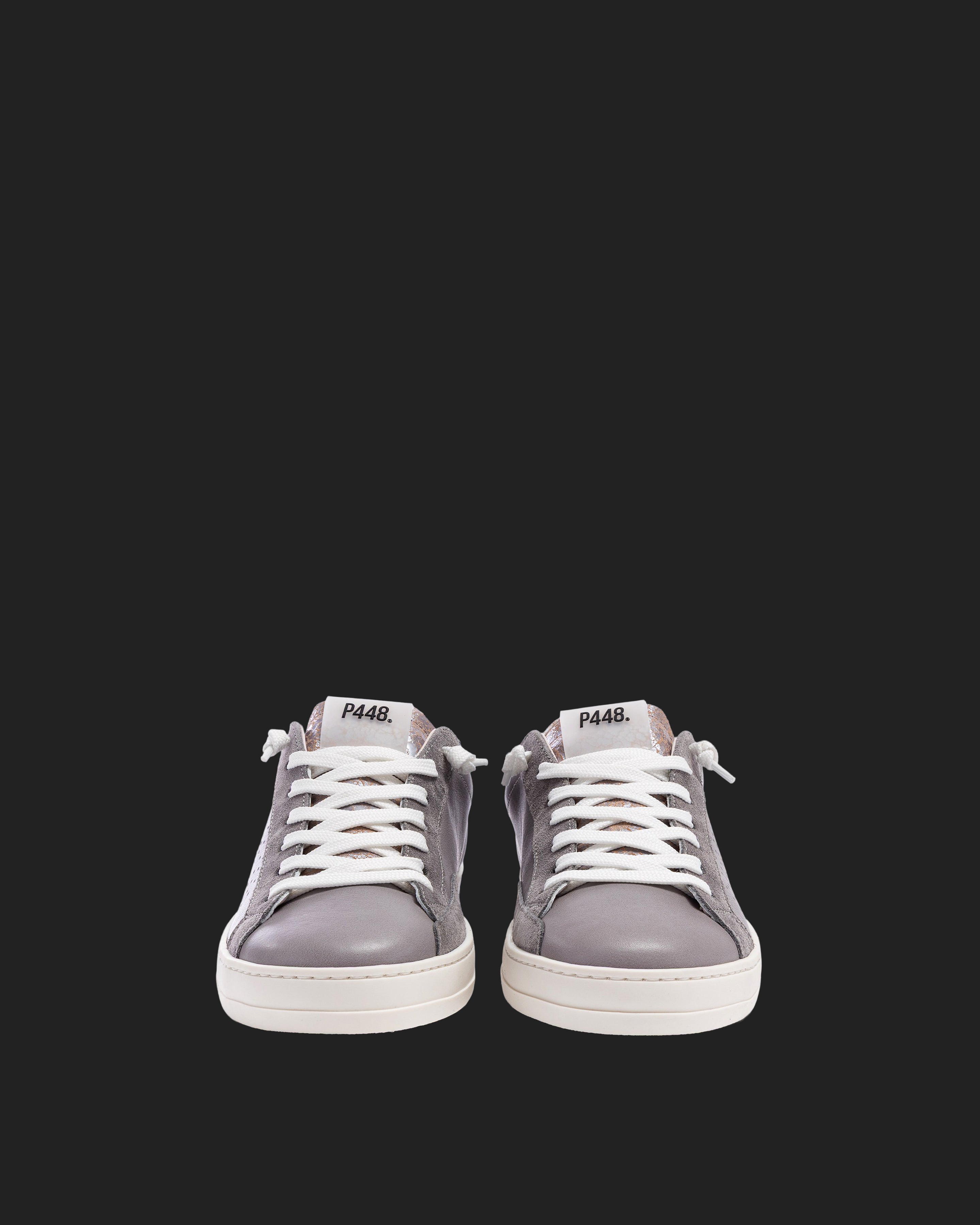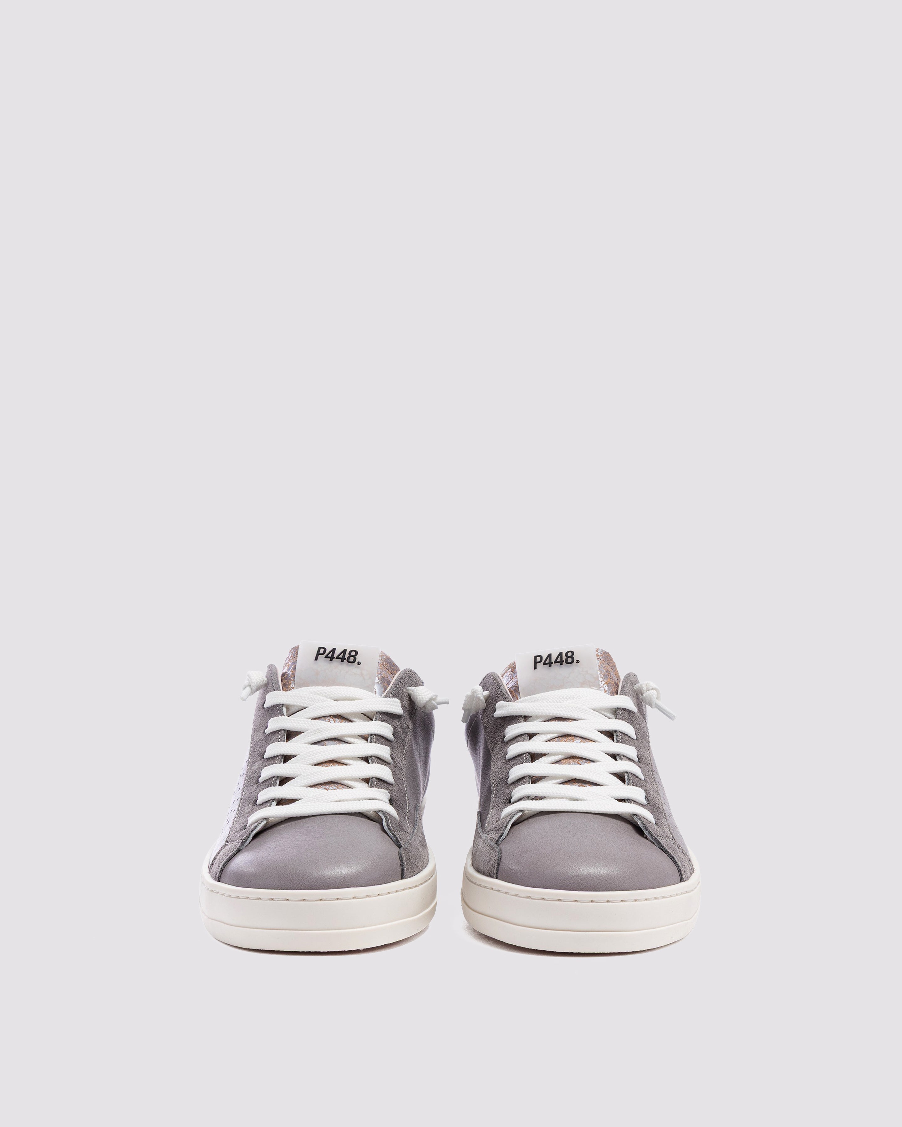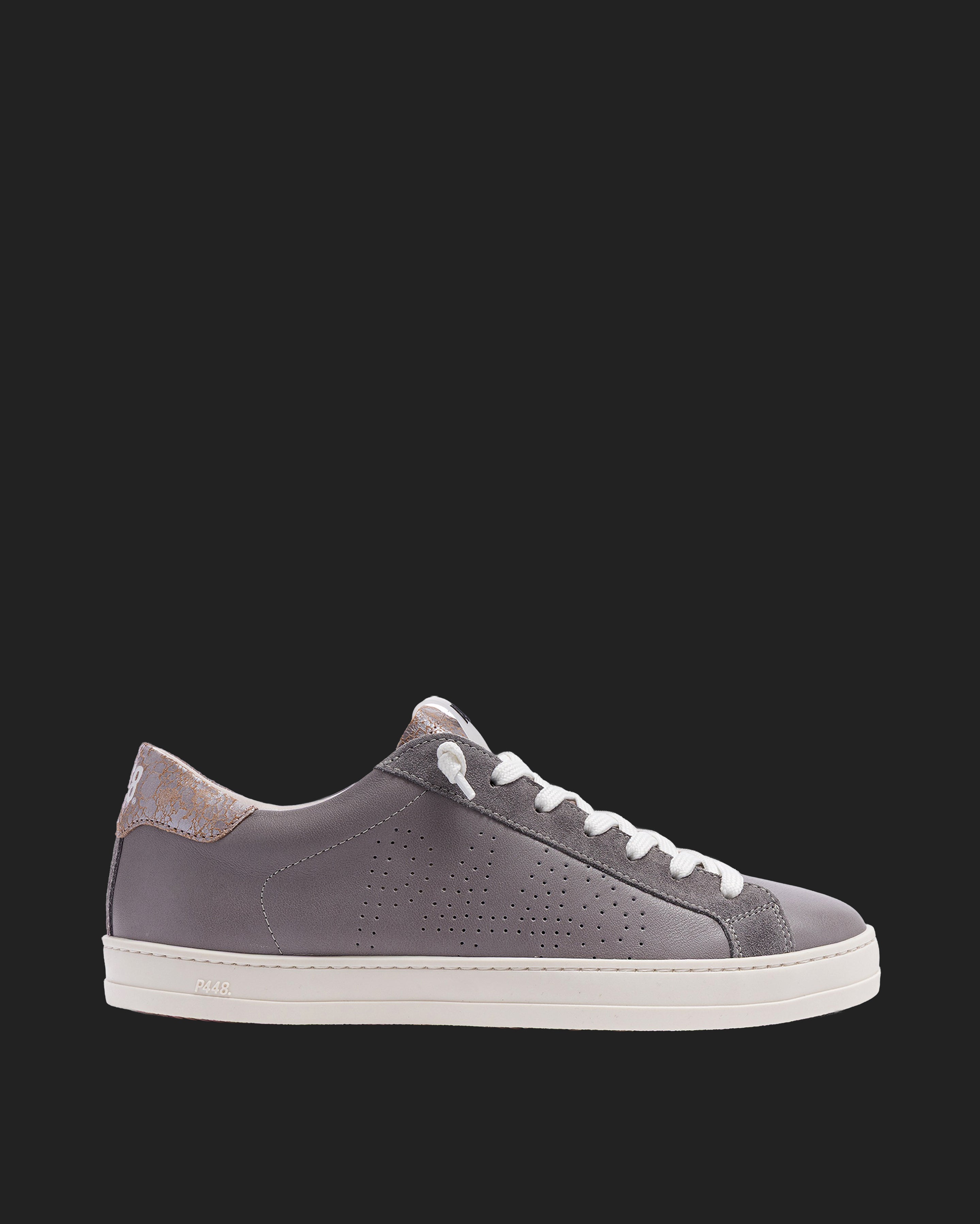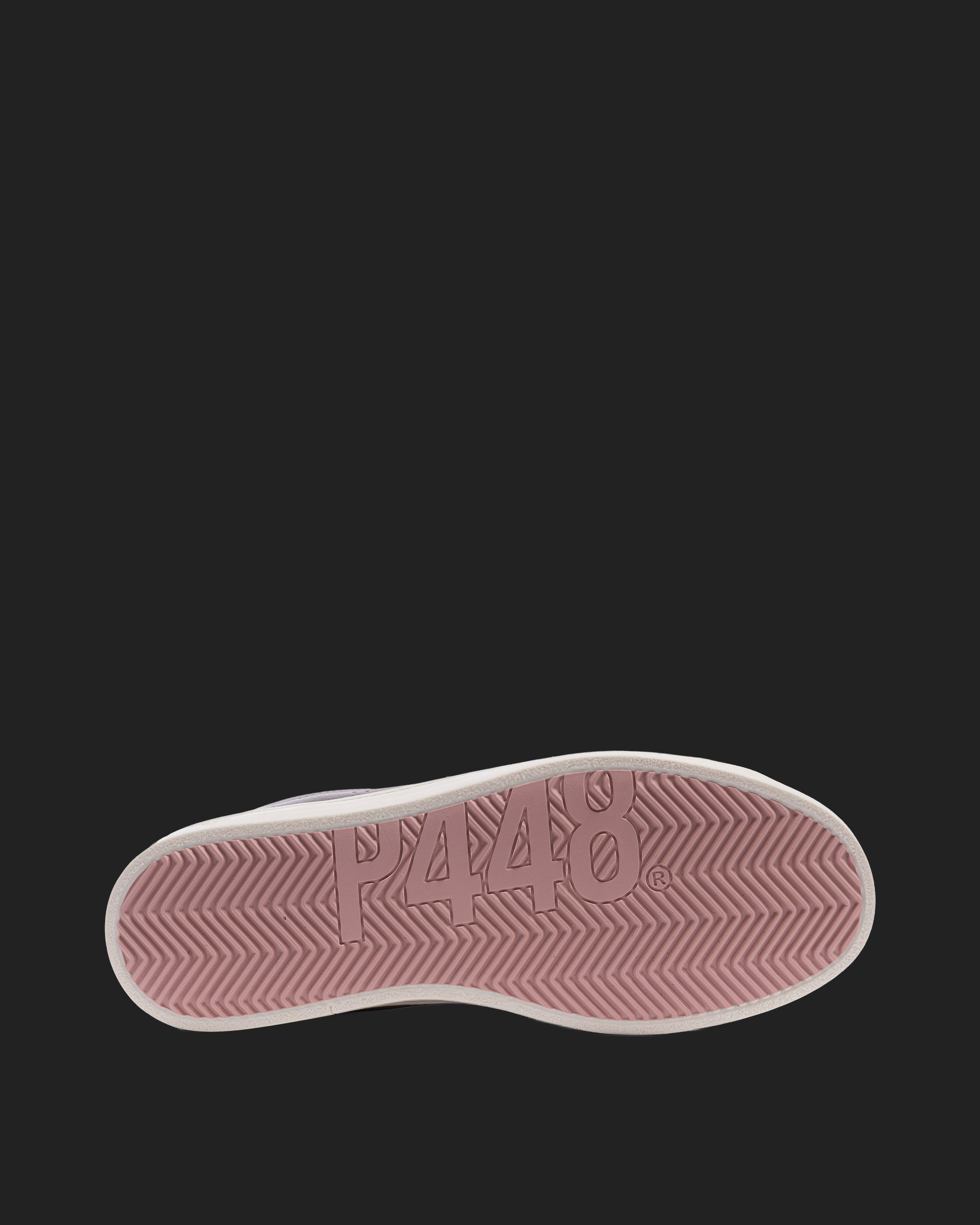 The John Silk is wrapped in grey leather and suede accented by a lilac leather toe and a red crackled leather tongue and heel tab accent. White laces, our signature P448 rubber sole and pink tread finish off the look. Swap in the extra pair of pink laces to tie it all together.