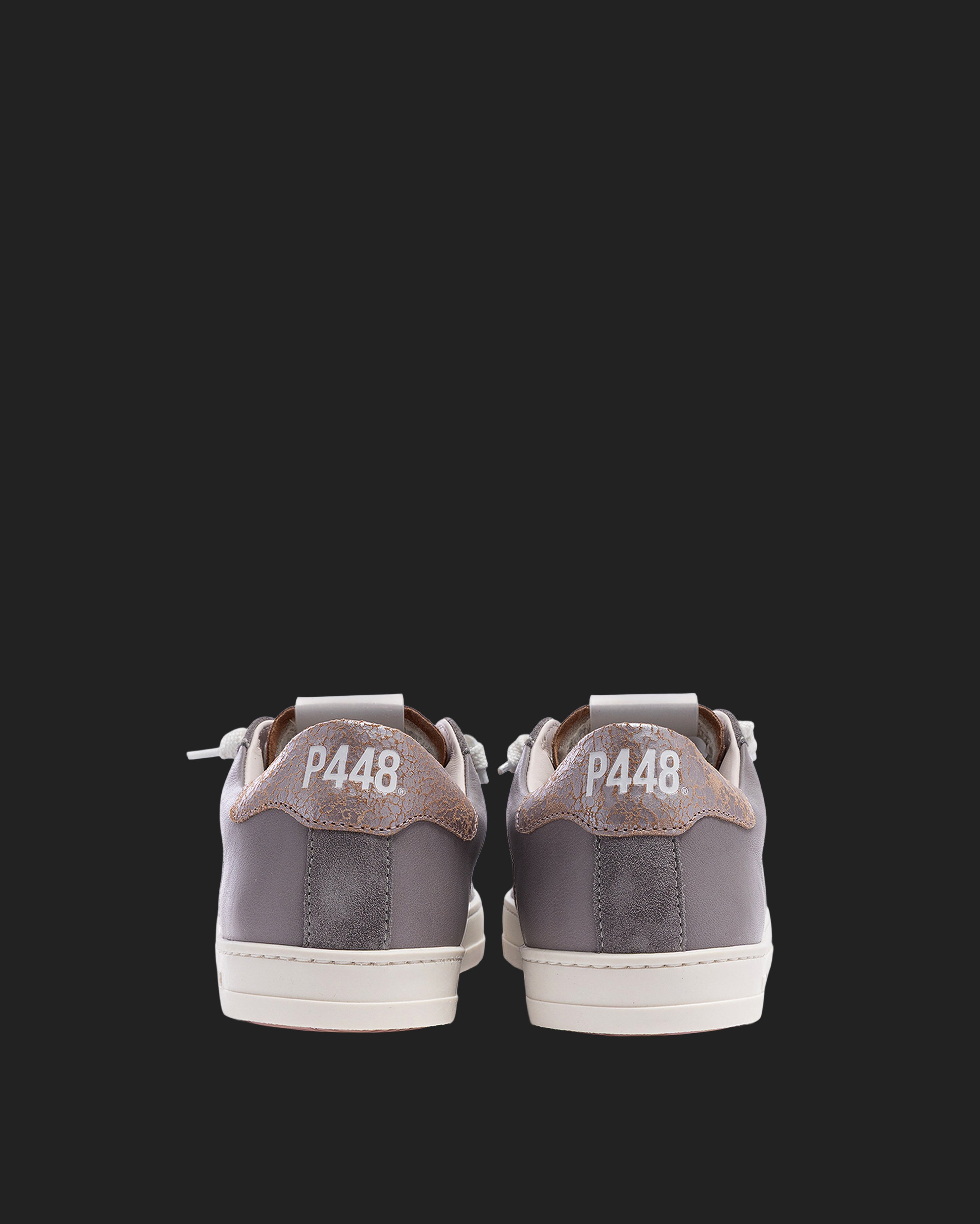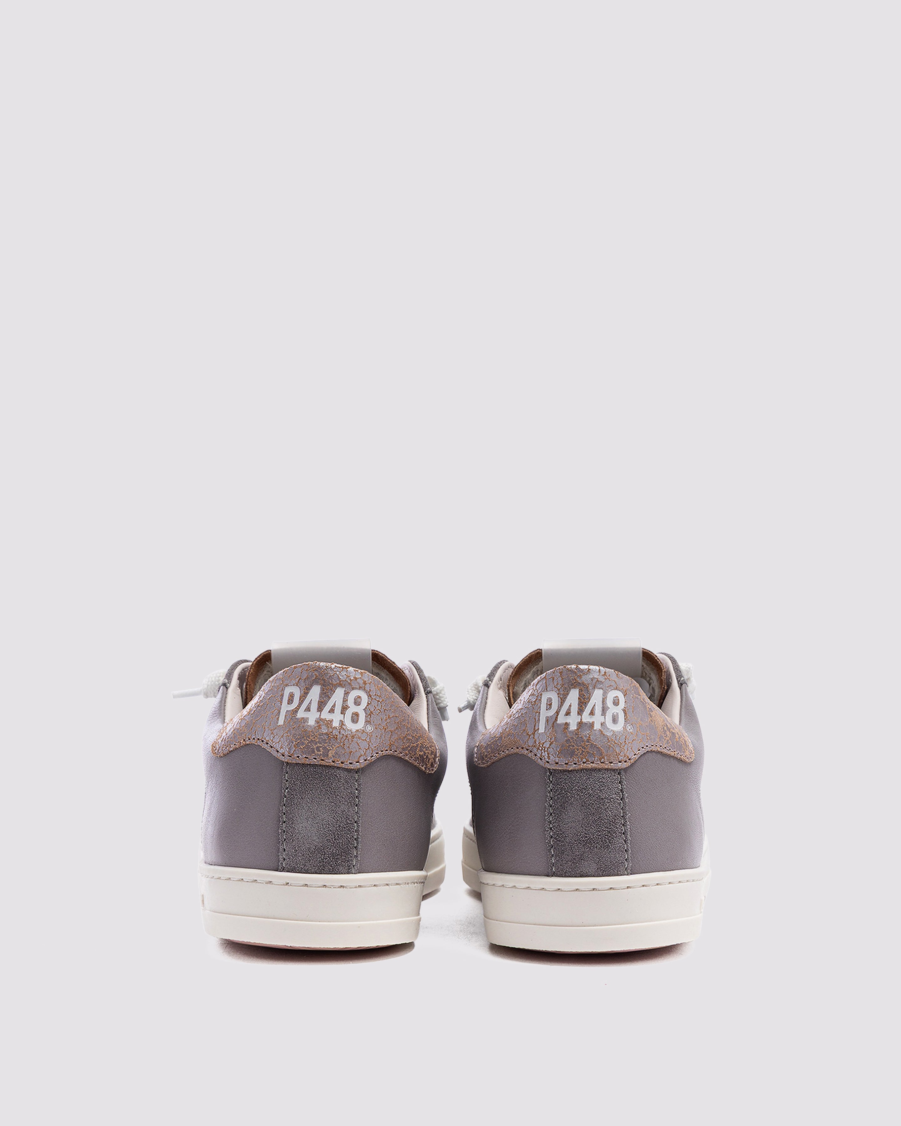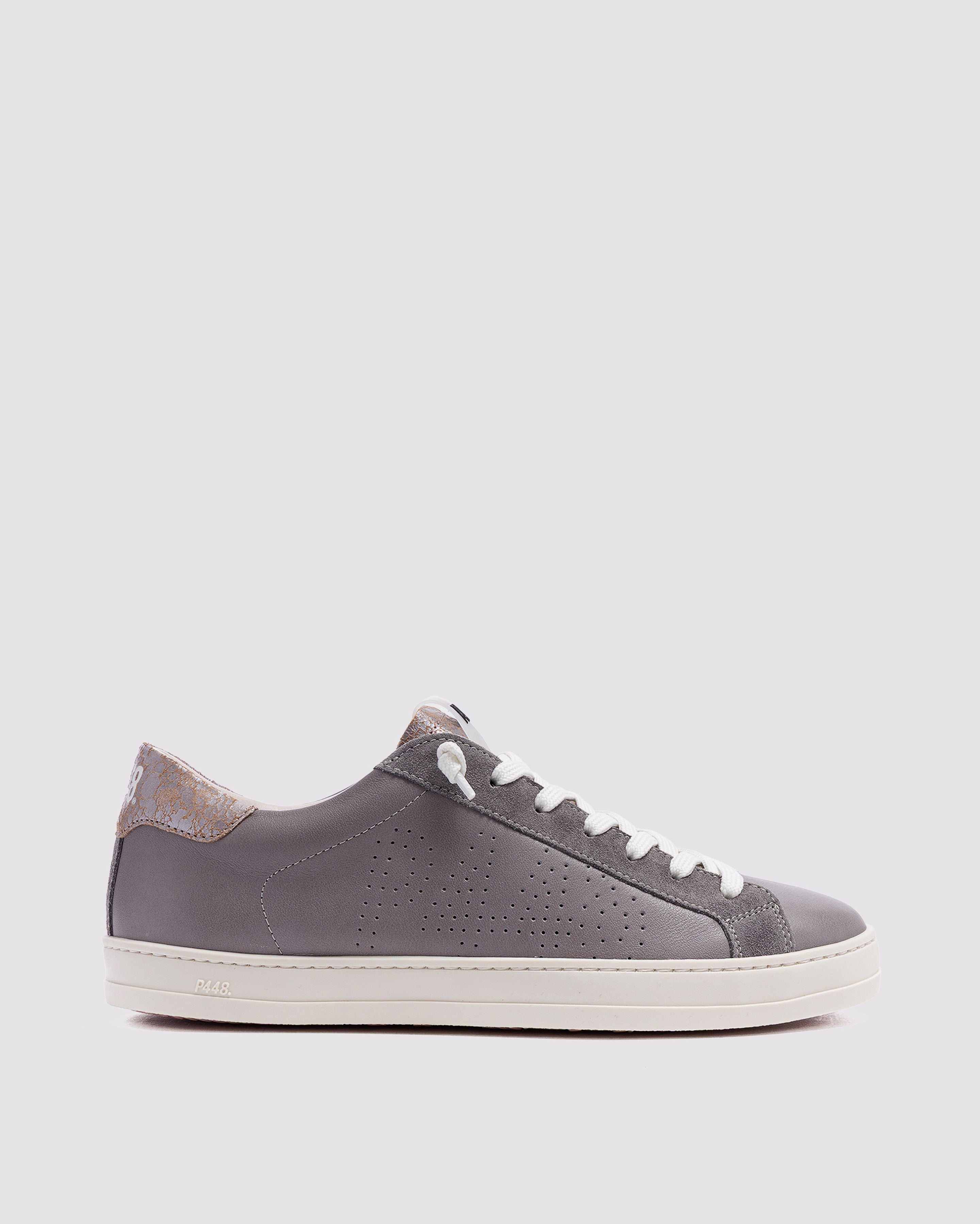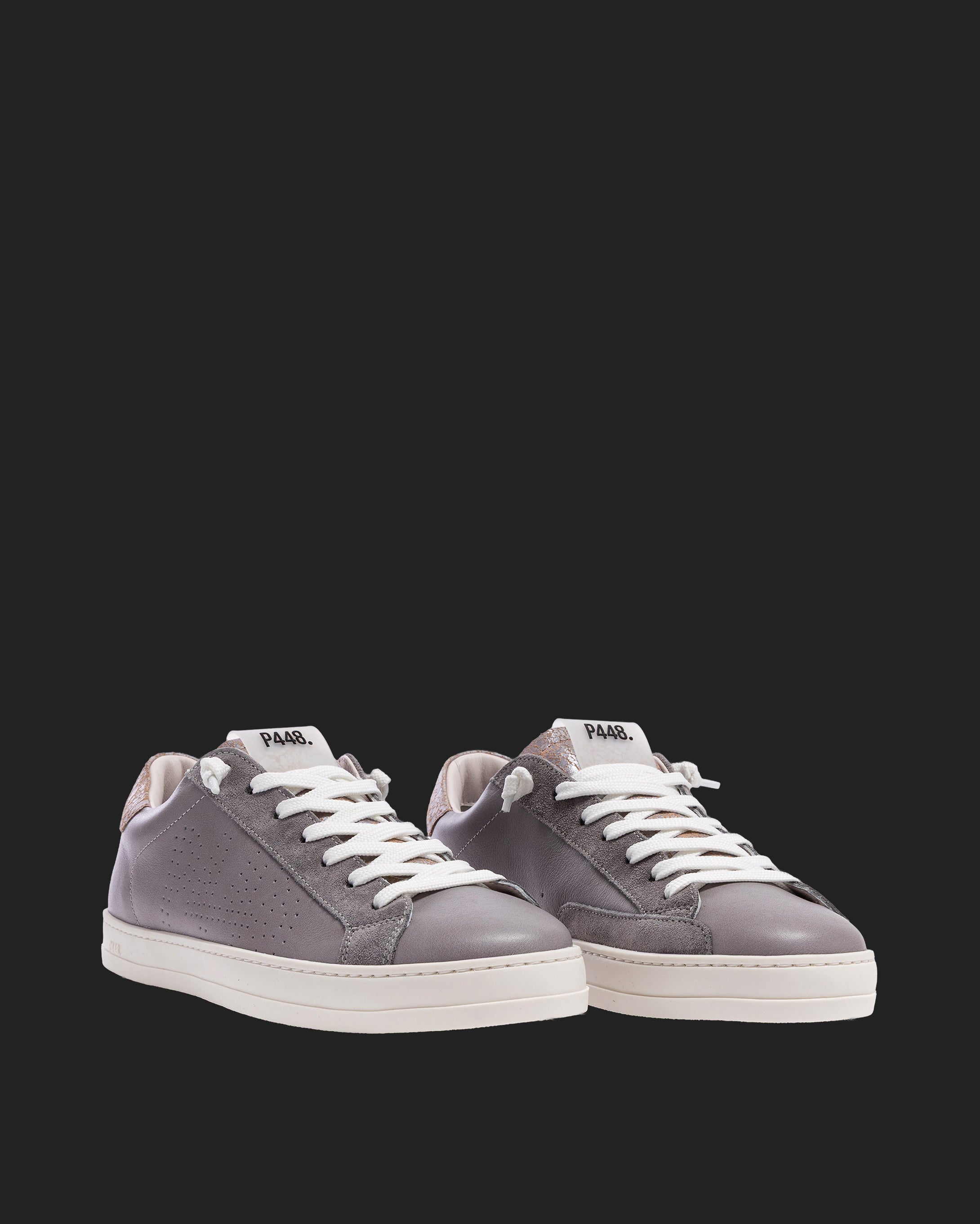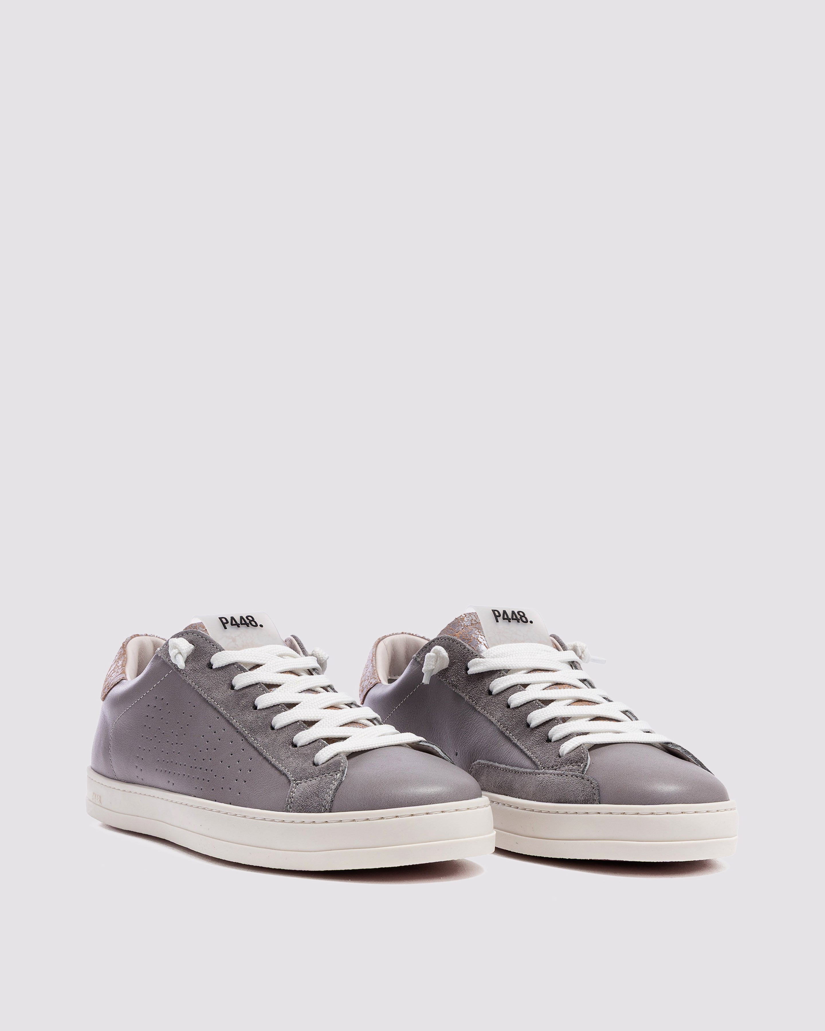 The John Silk is wrapped in grey leather and suede accented by a lilac leather toe and a red crackled leather tongue and heel tab accent. White laces, our signature P448 rubber sole and pink tread finish off the look. Swap in the extra pair of pink laces to tie it all together.