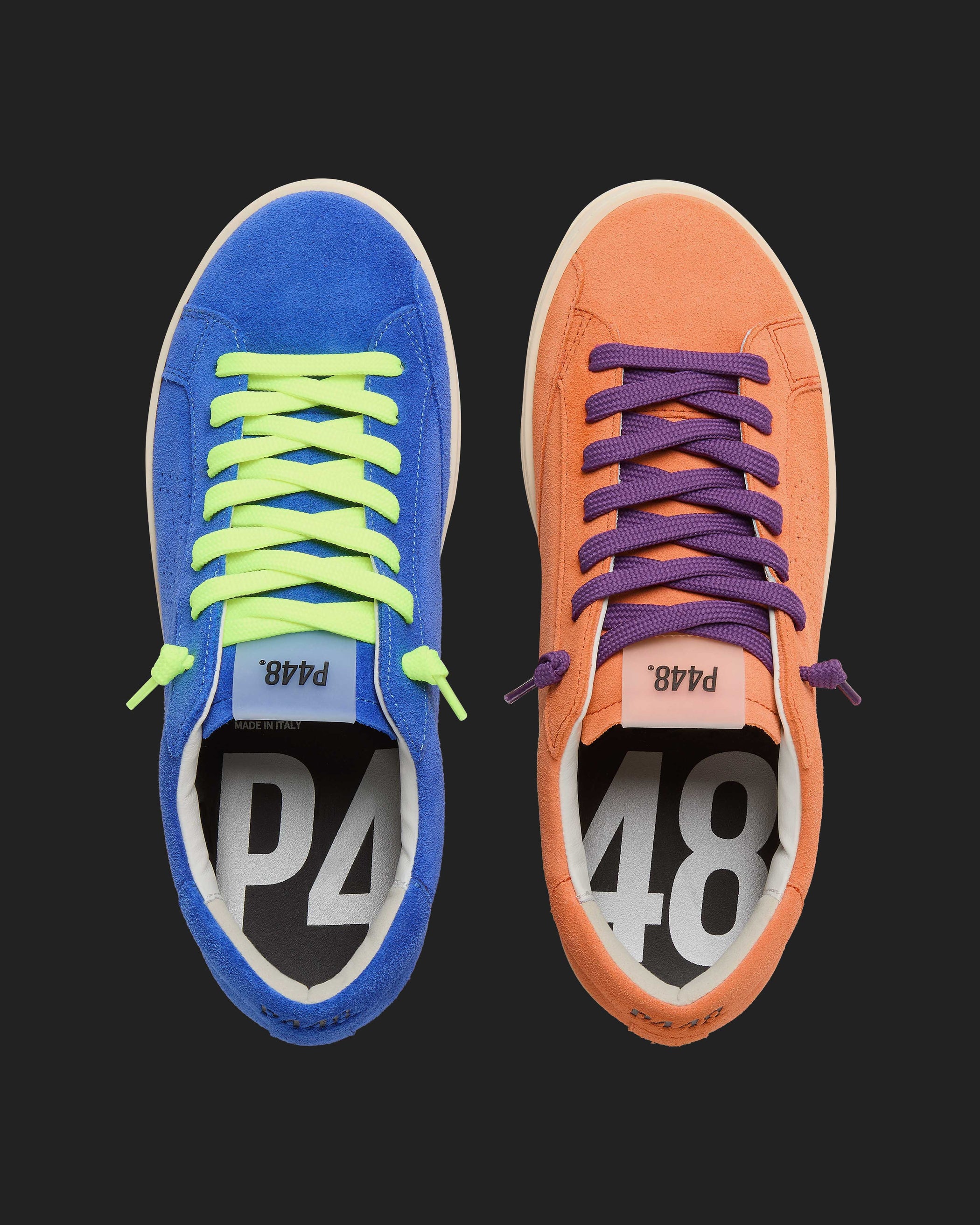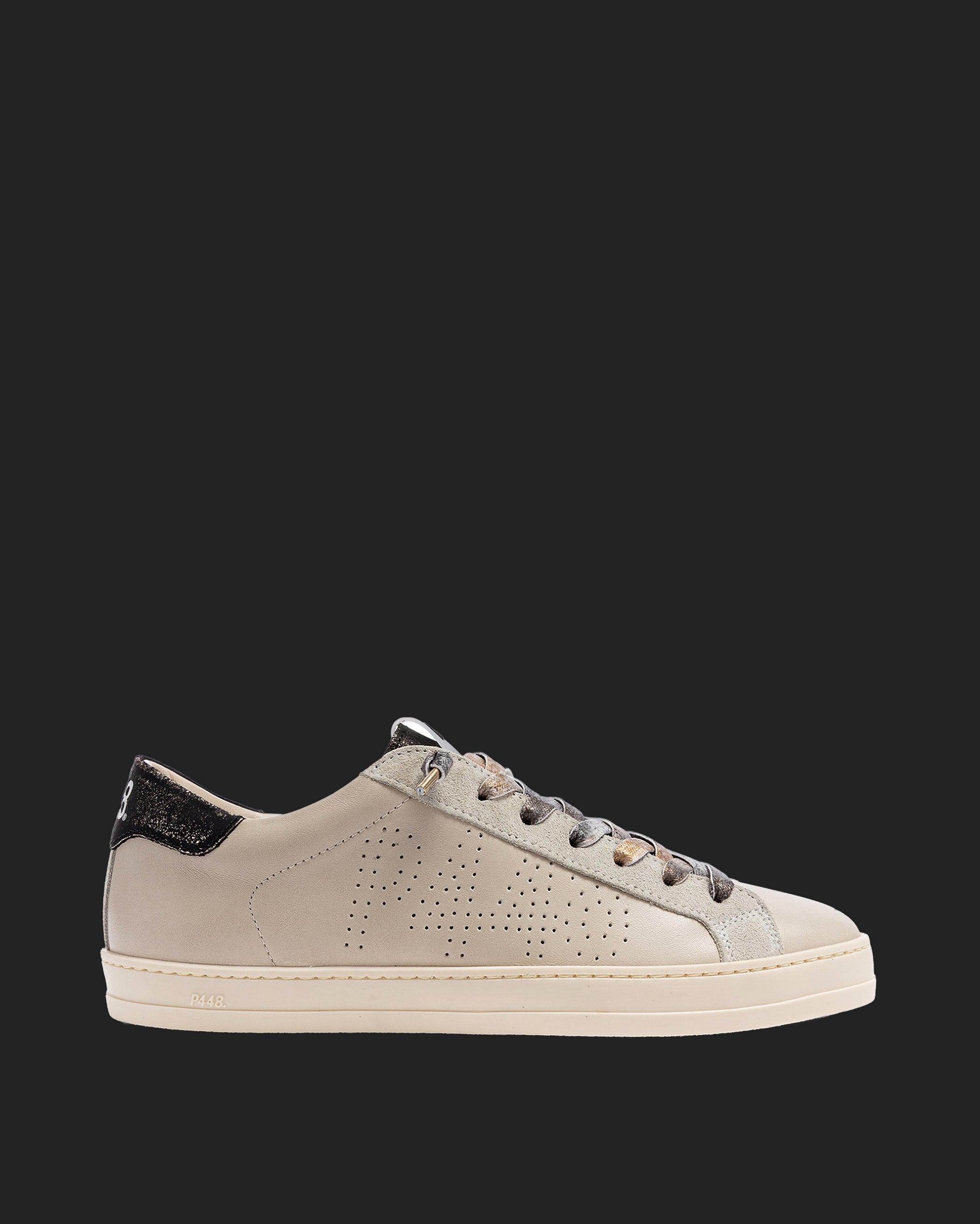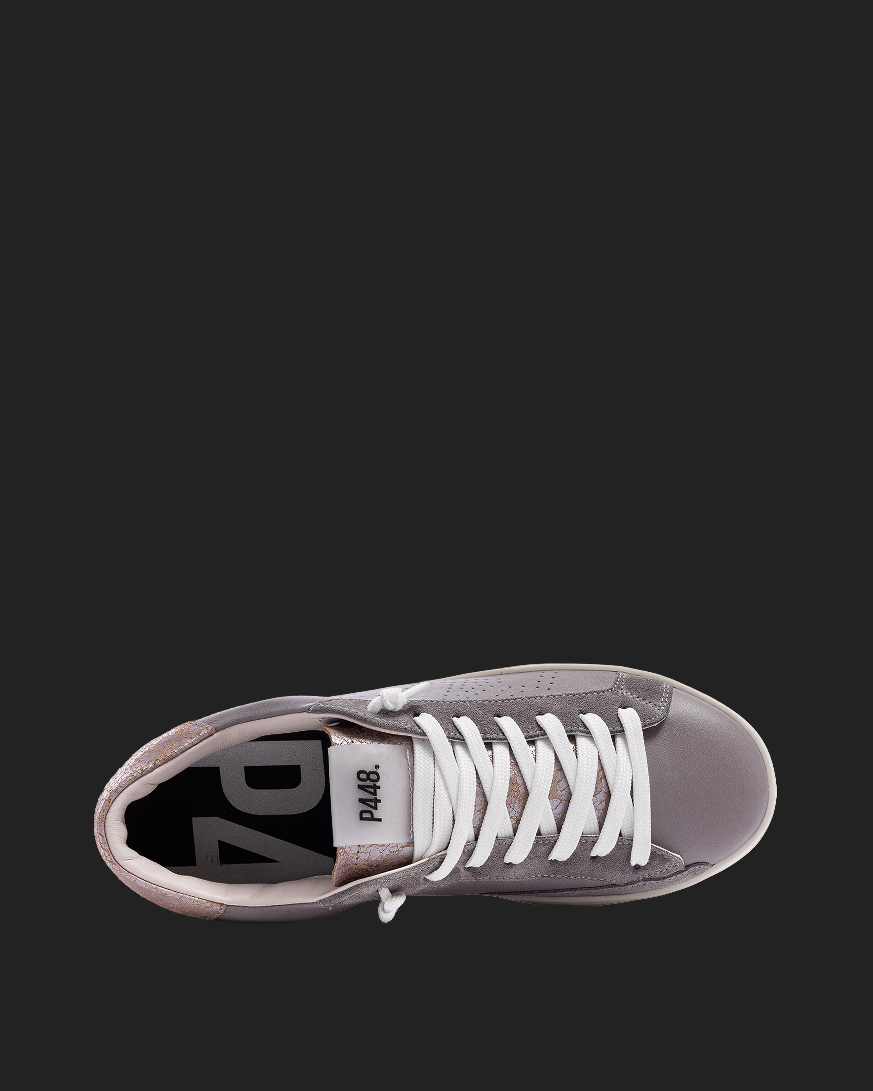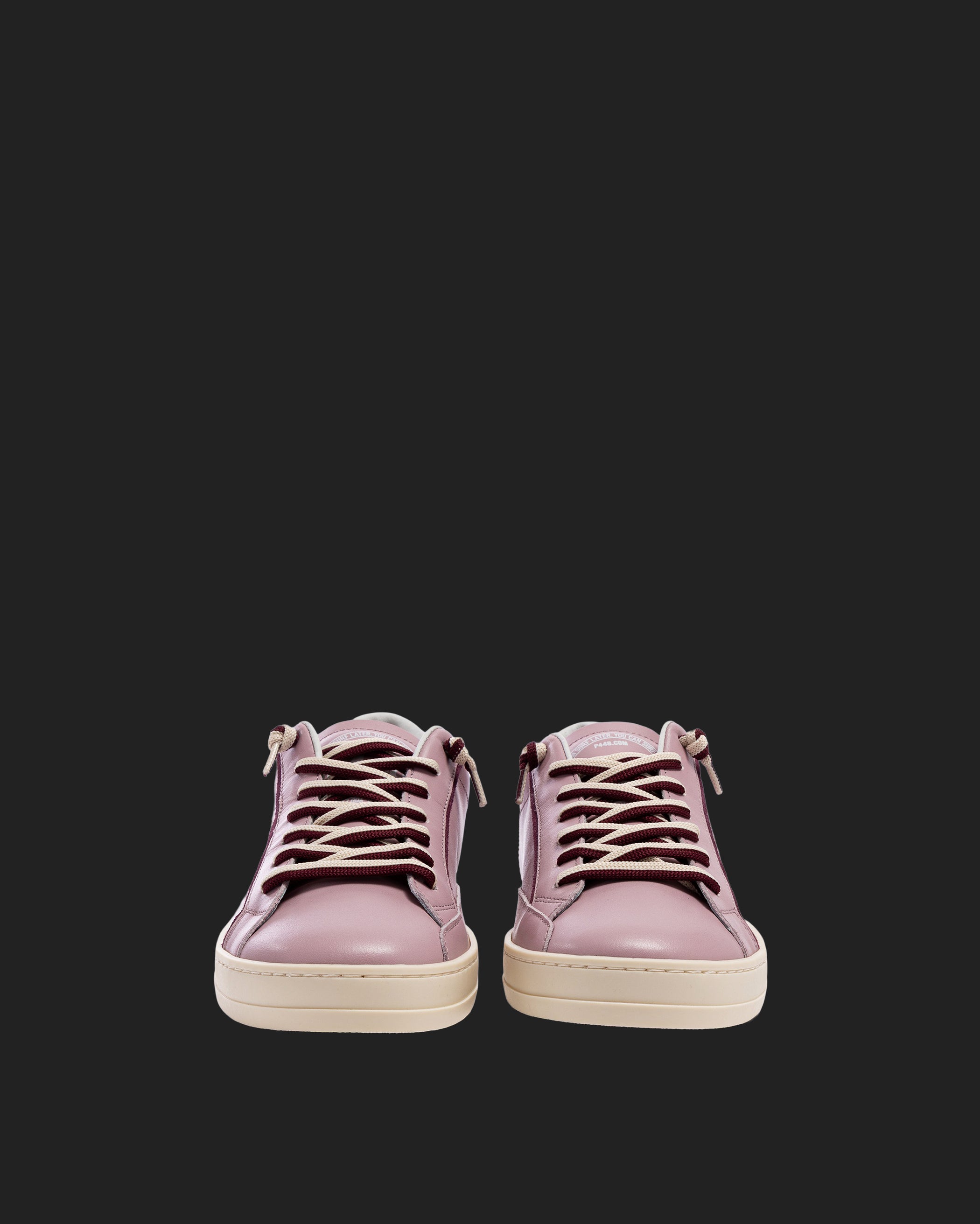 The John Silk is wrapped in grey leather and suede accented by a lilac leather toe and a red crackled leather tongue and heel tab accent. White laces, our signature P448 rubber sole and pink tread finish off the look. Swap in the extra pair of pink laces to tie it all together.