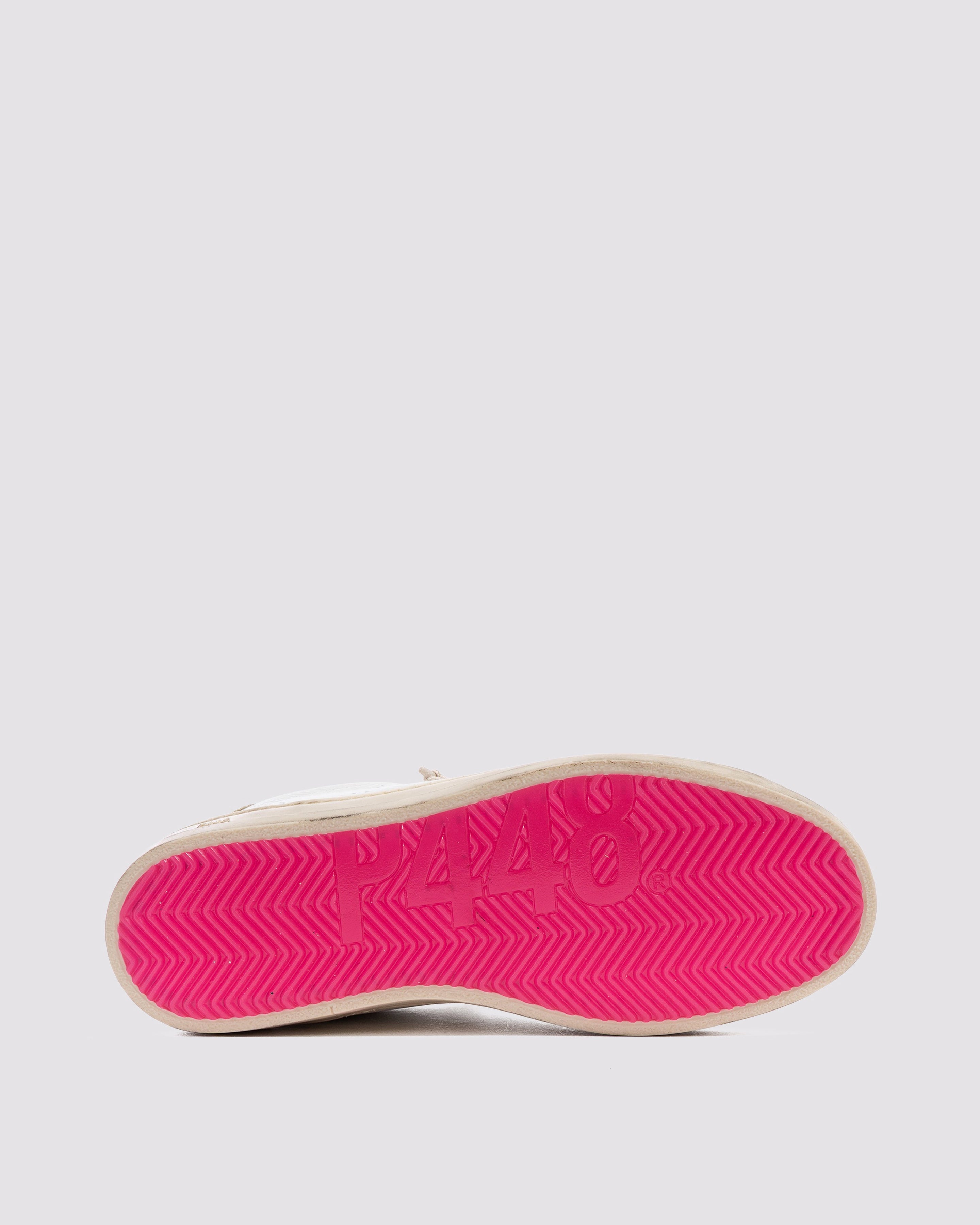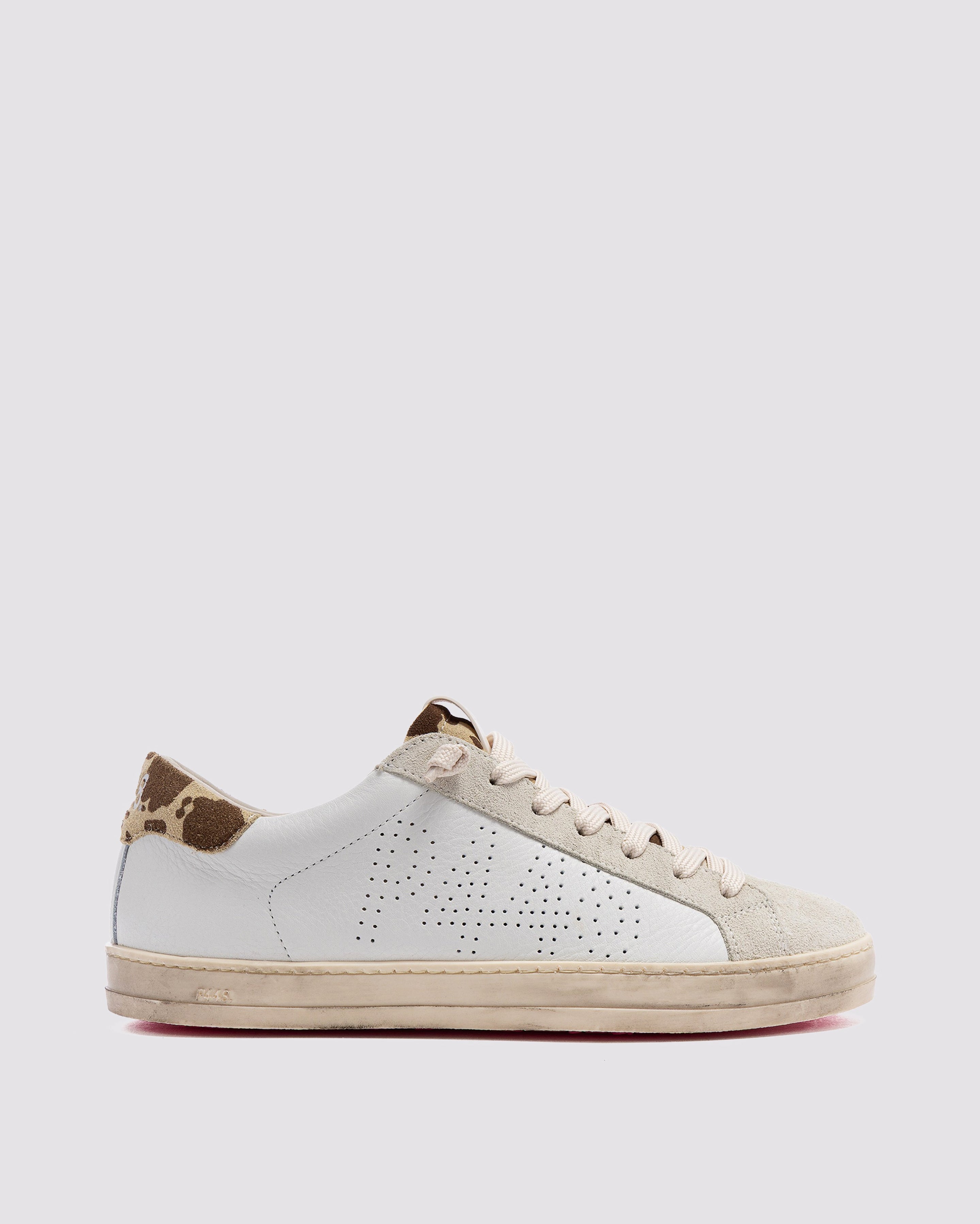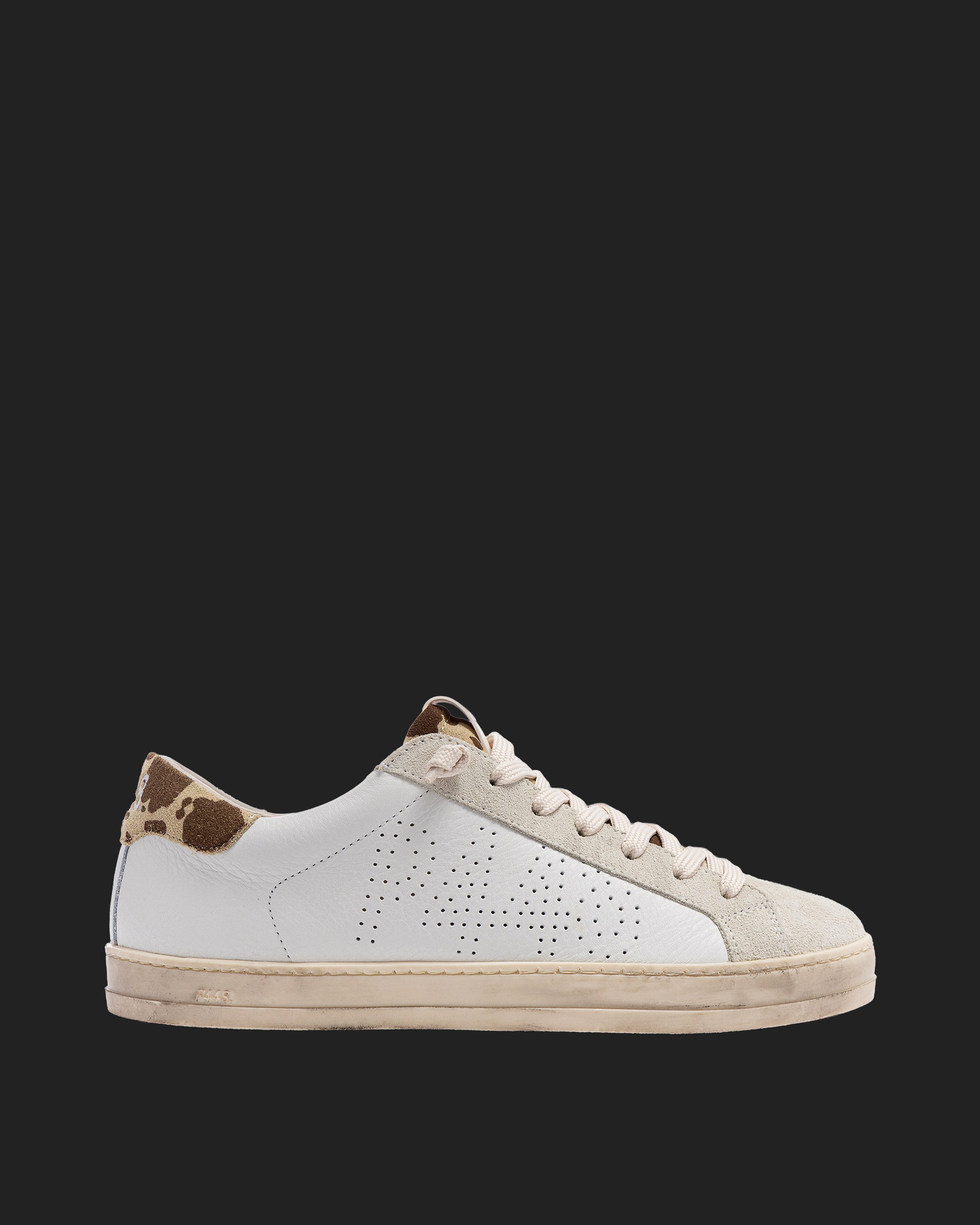 The John Cow White is wrapped in white leather and suede with cow-printed beige leather tongue and heel tab accents. Cream laces, our signature P448 hand-distressed rubber sole and pink treads finish off the look. Swap in the extra pair of pink laces to make a statement.