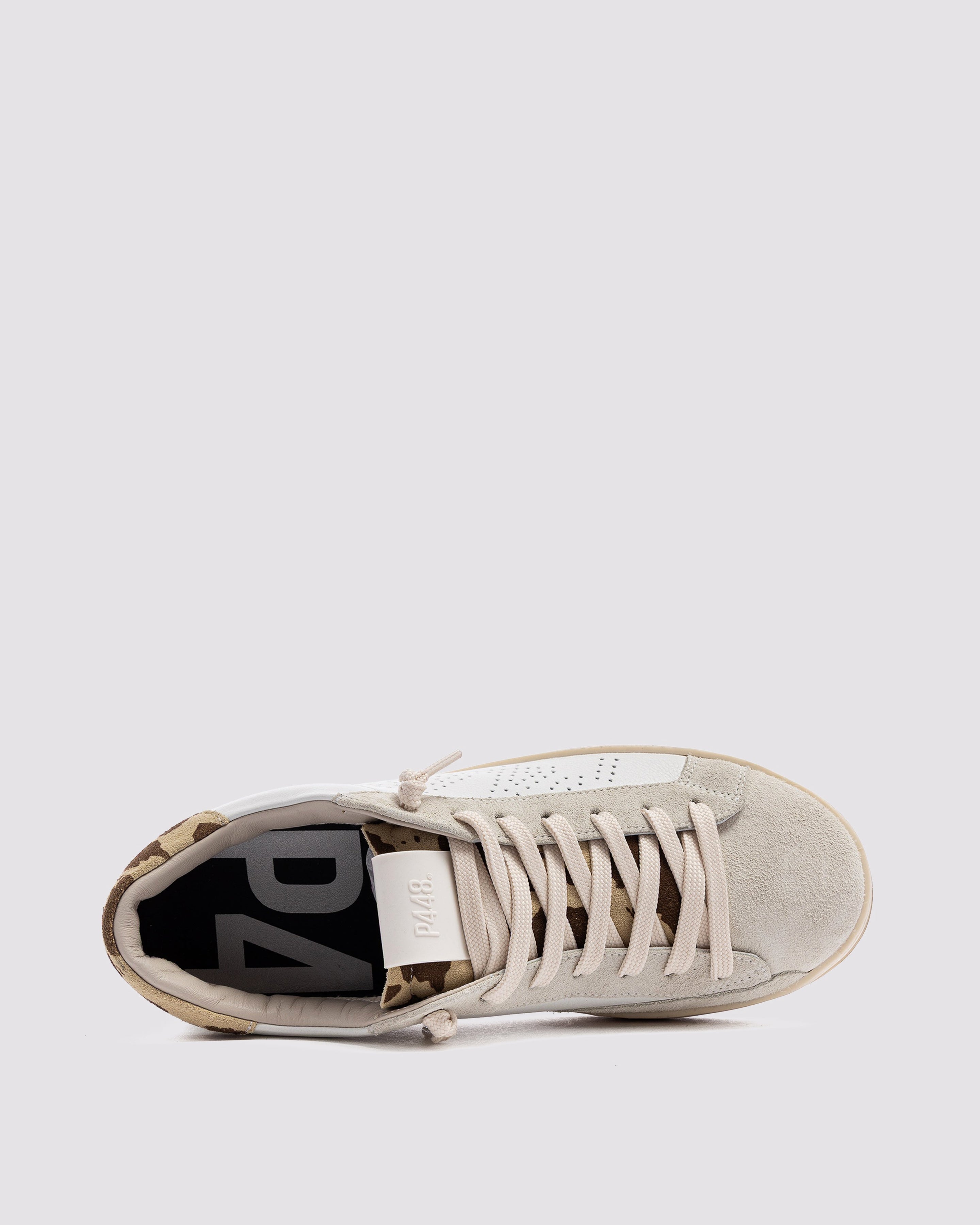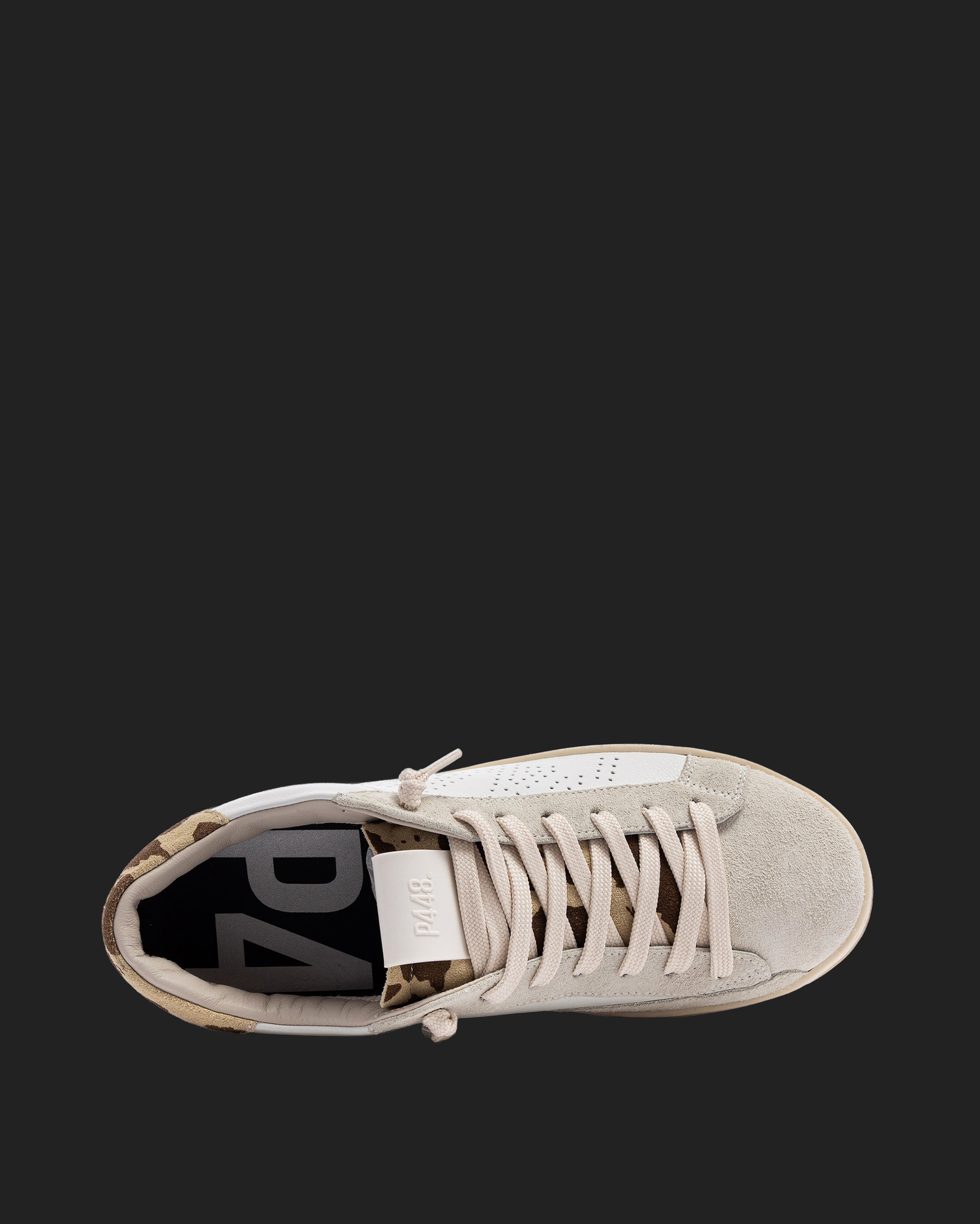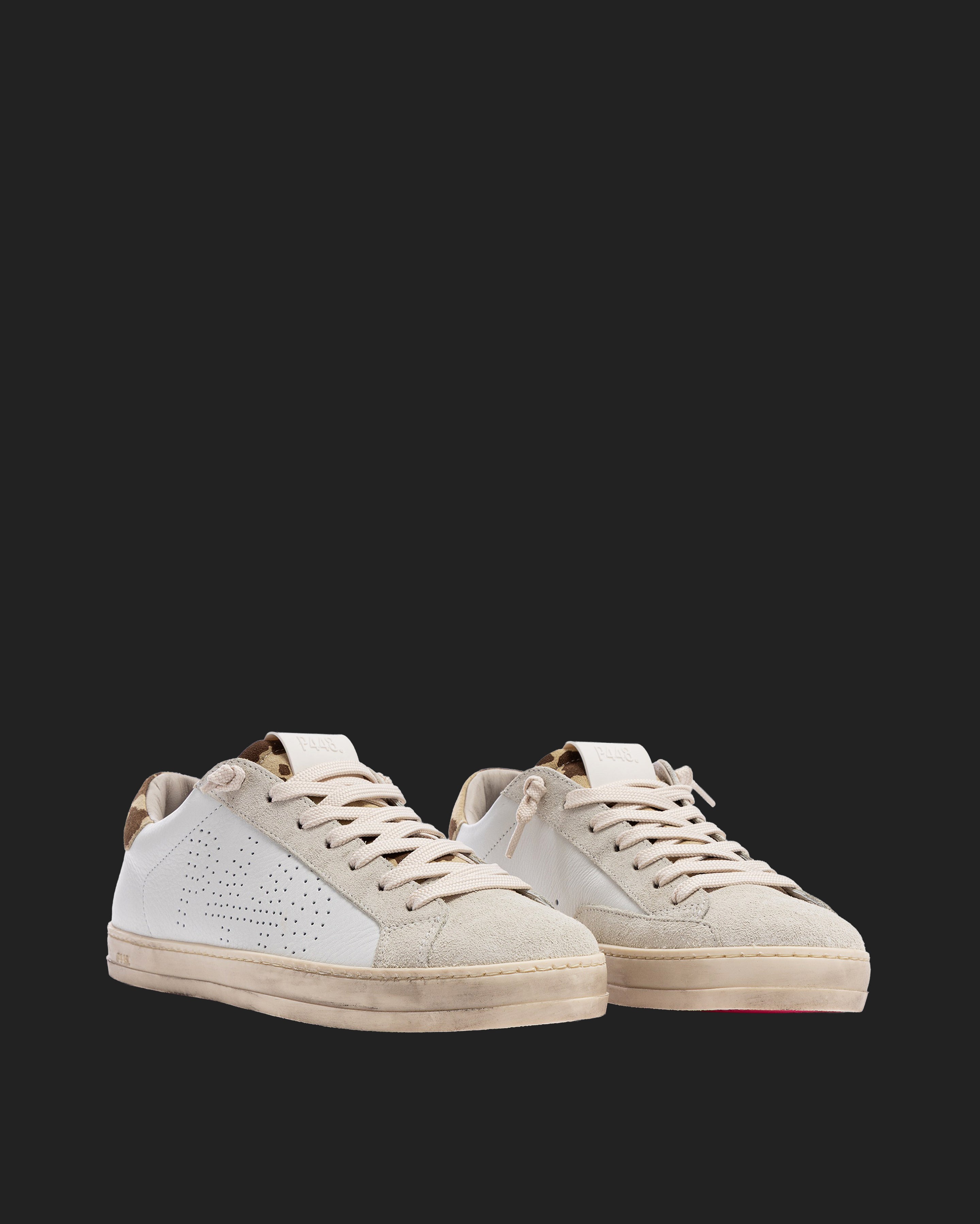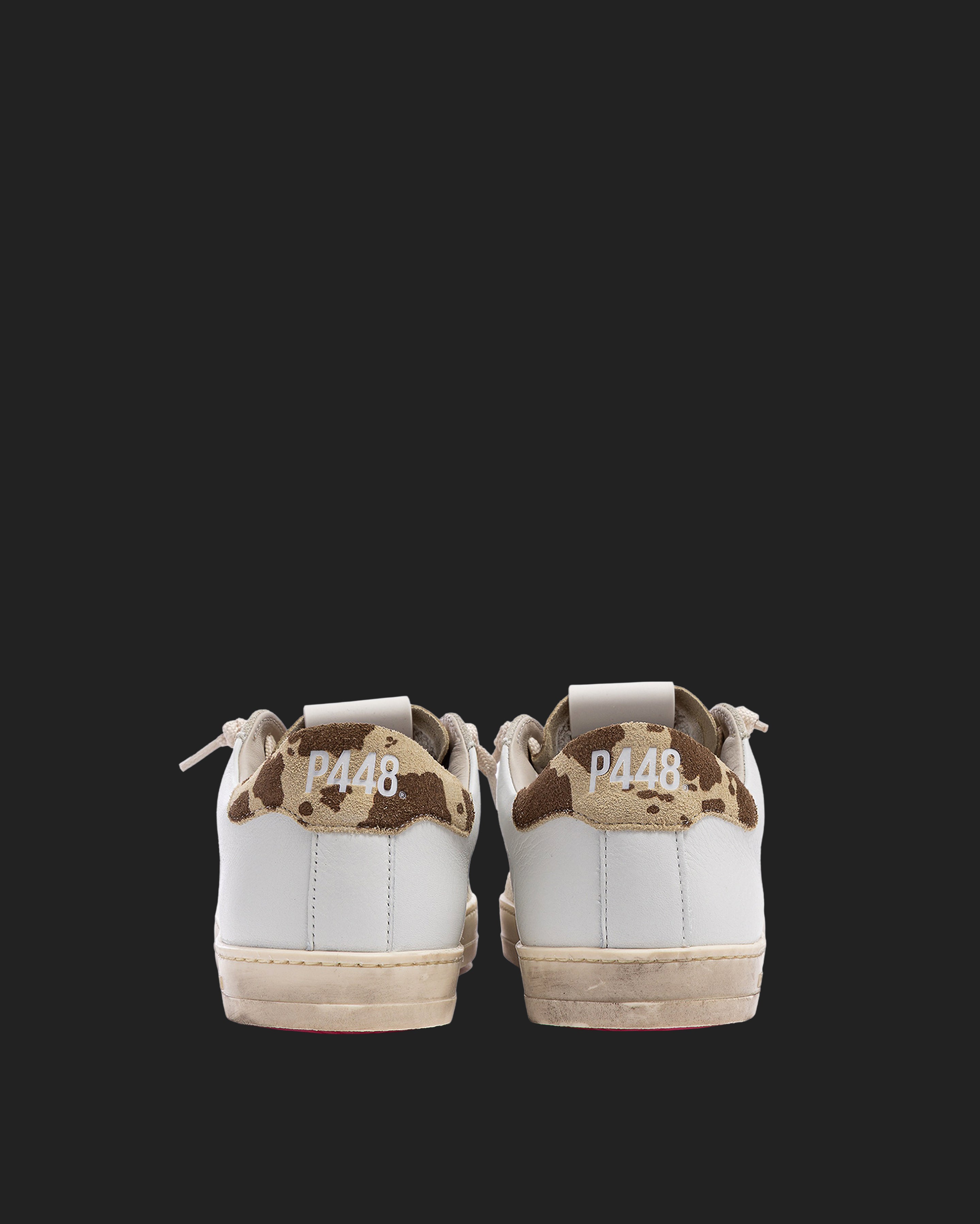 The John Cow White is wrapped in white leather and suede with cow-printed beige leather tongue and heel tab accents. Cream laces, our signature P448 hand-distressed rubber sole and pink treads finish off the look. Swap in the extra pair of pink laces to make a statement.
