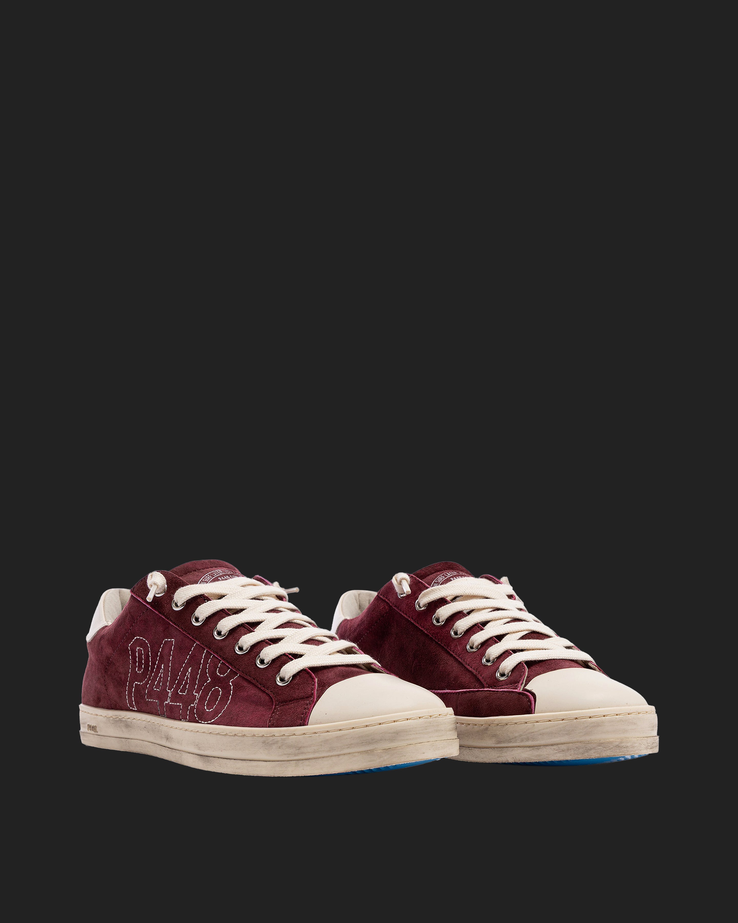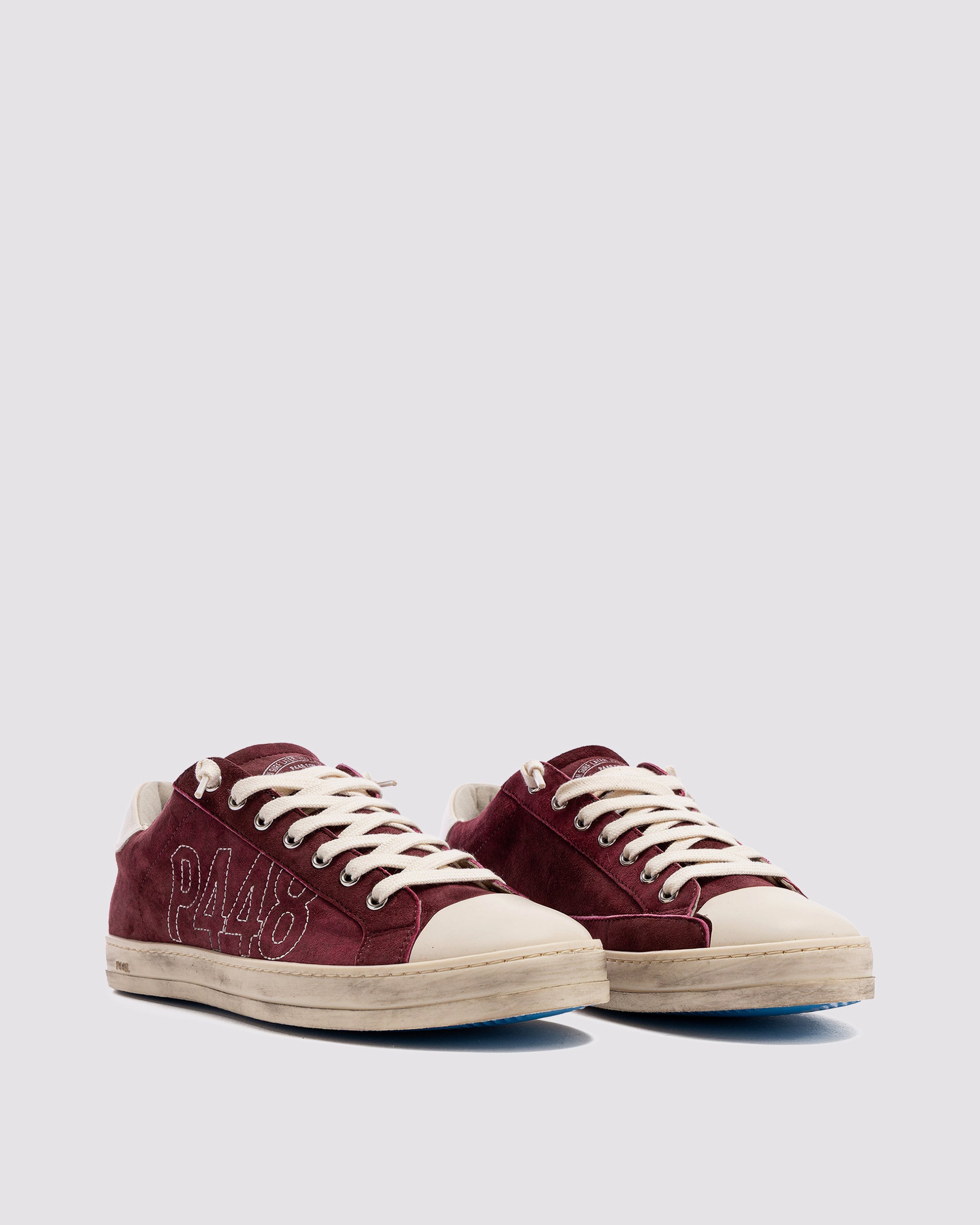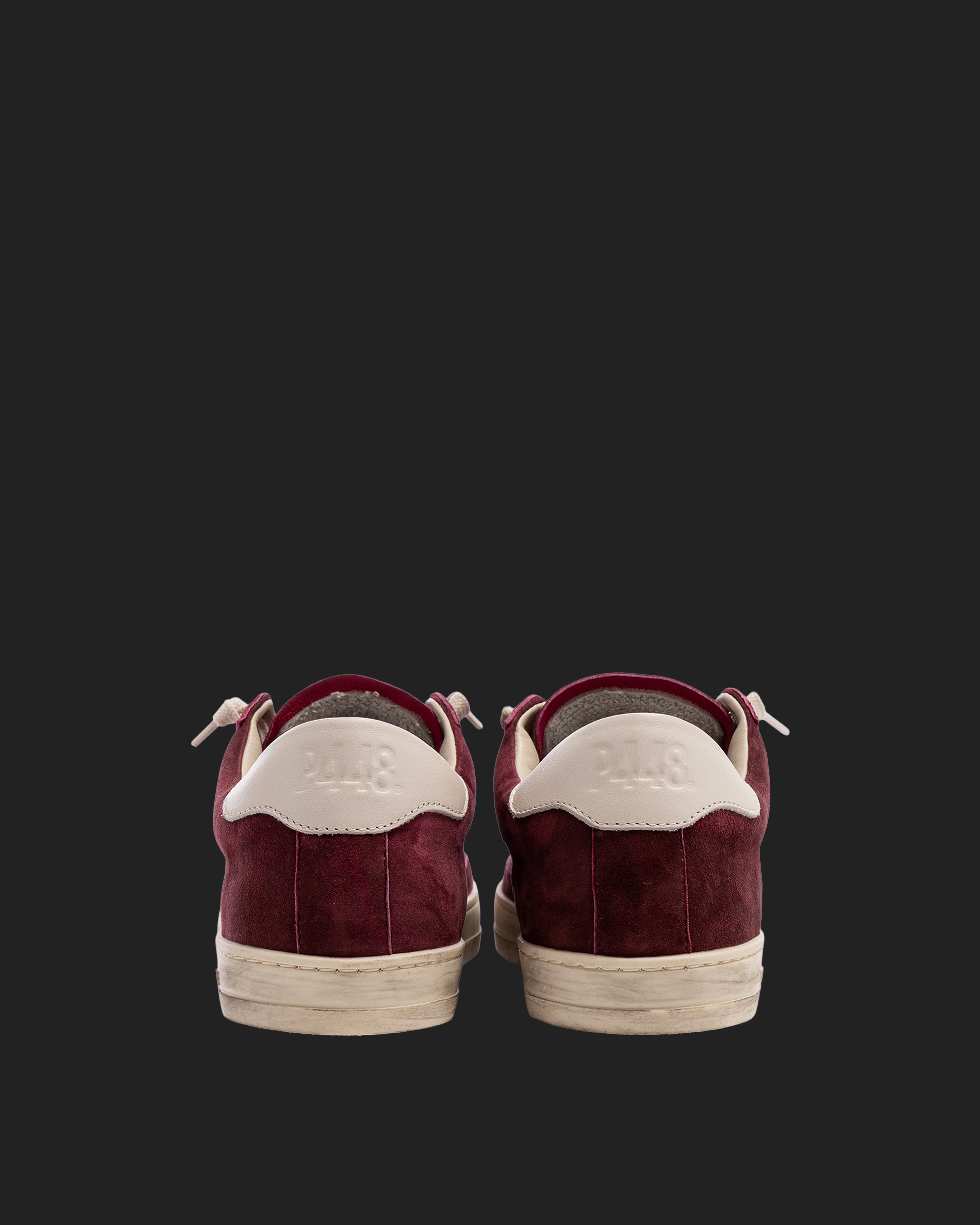 The John Stitch Wine is wrapped in red suede with a grey leather heel tab and a rubber toe cap. Off-white cotton laces, our signature P448 hand-distressed rubber sole and light blue tread ground the look. Swap in the extra pair of red laces for a monochromatic moment.