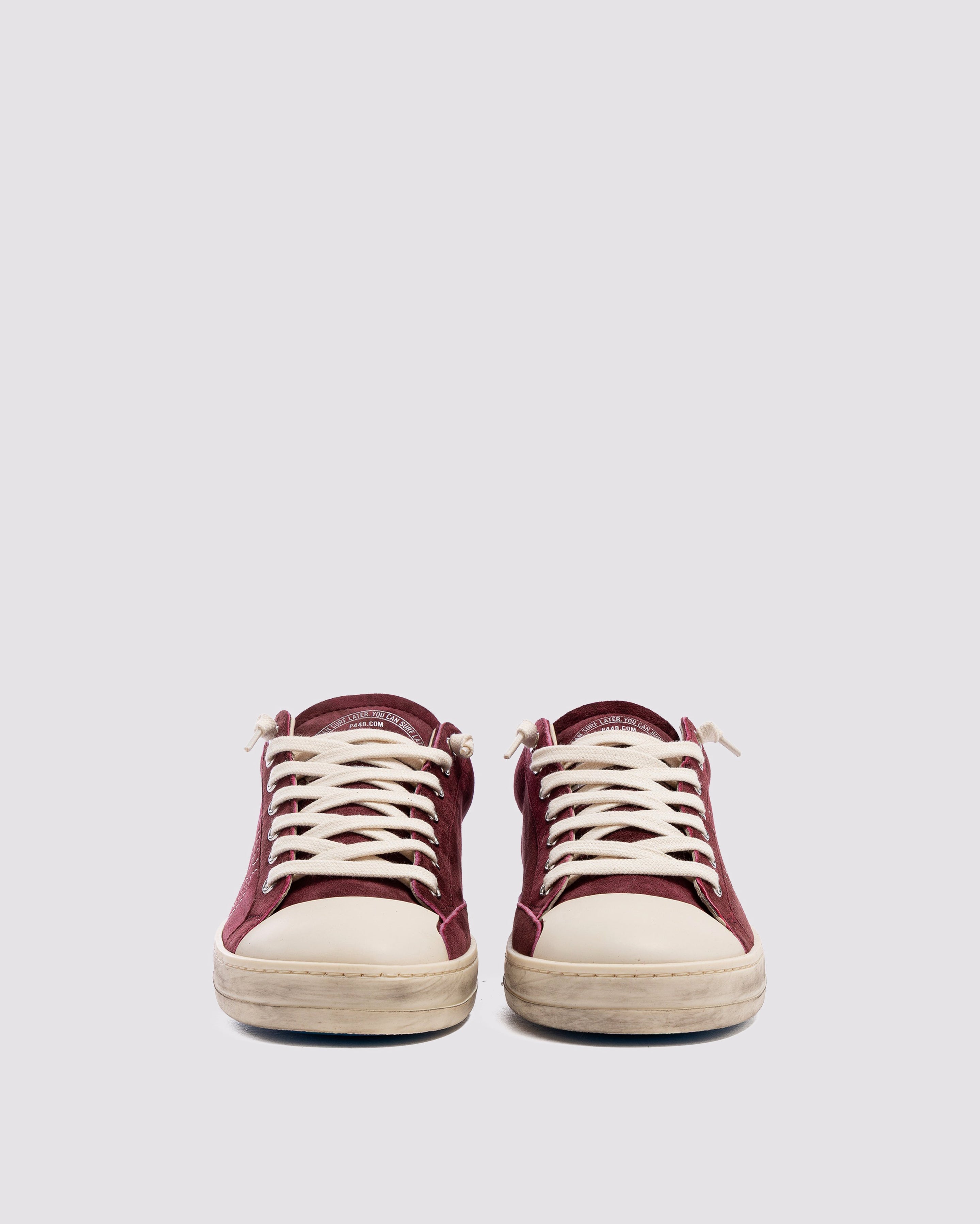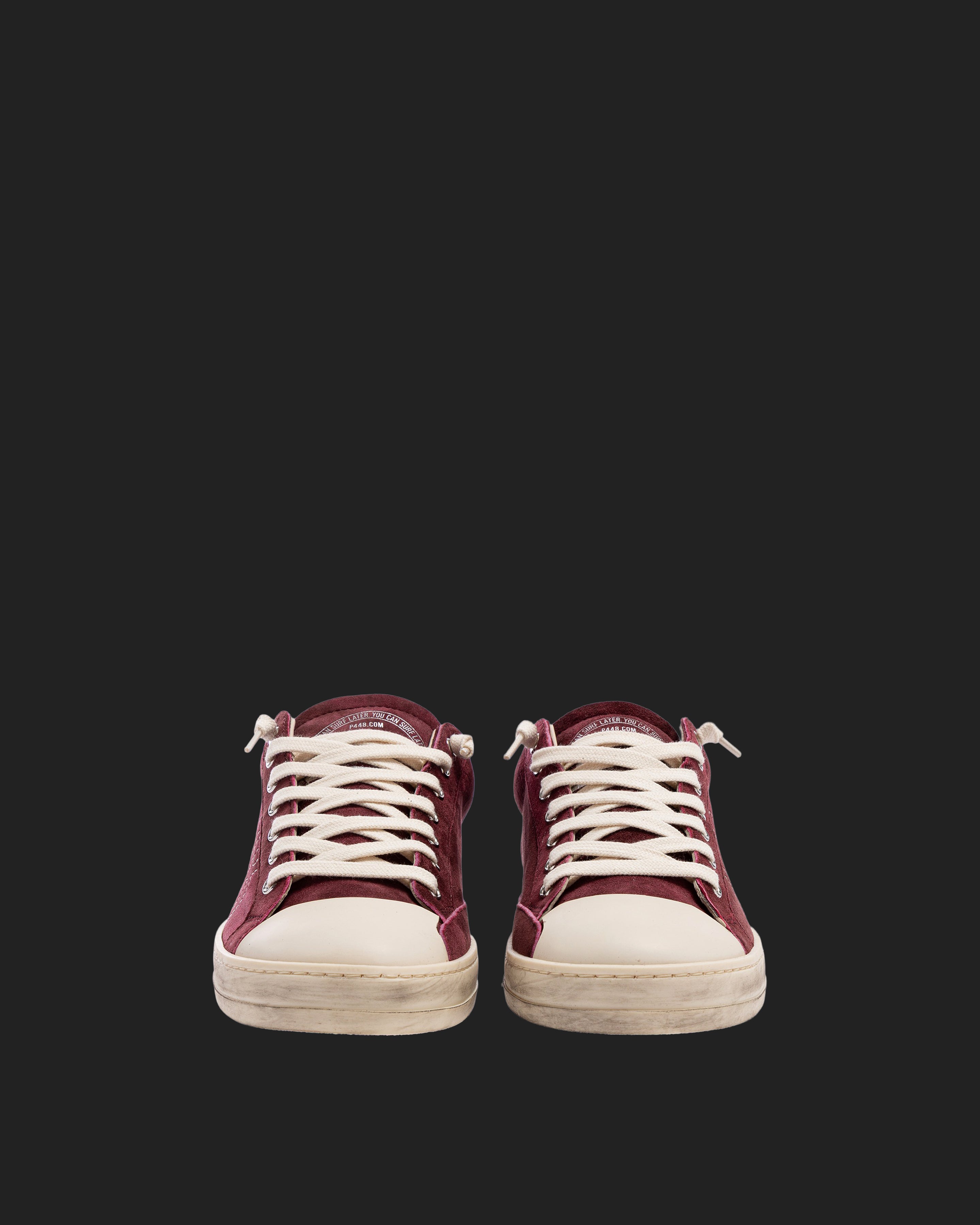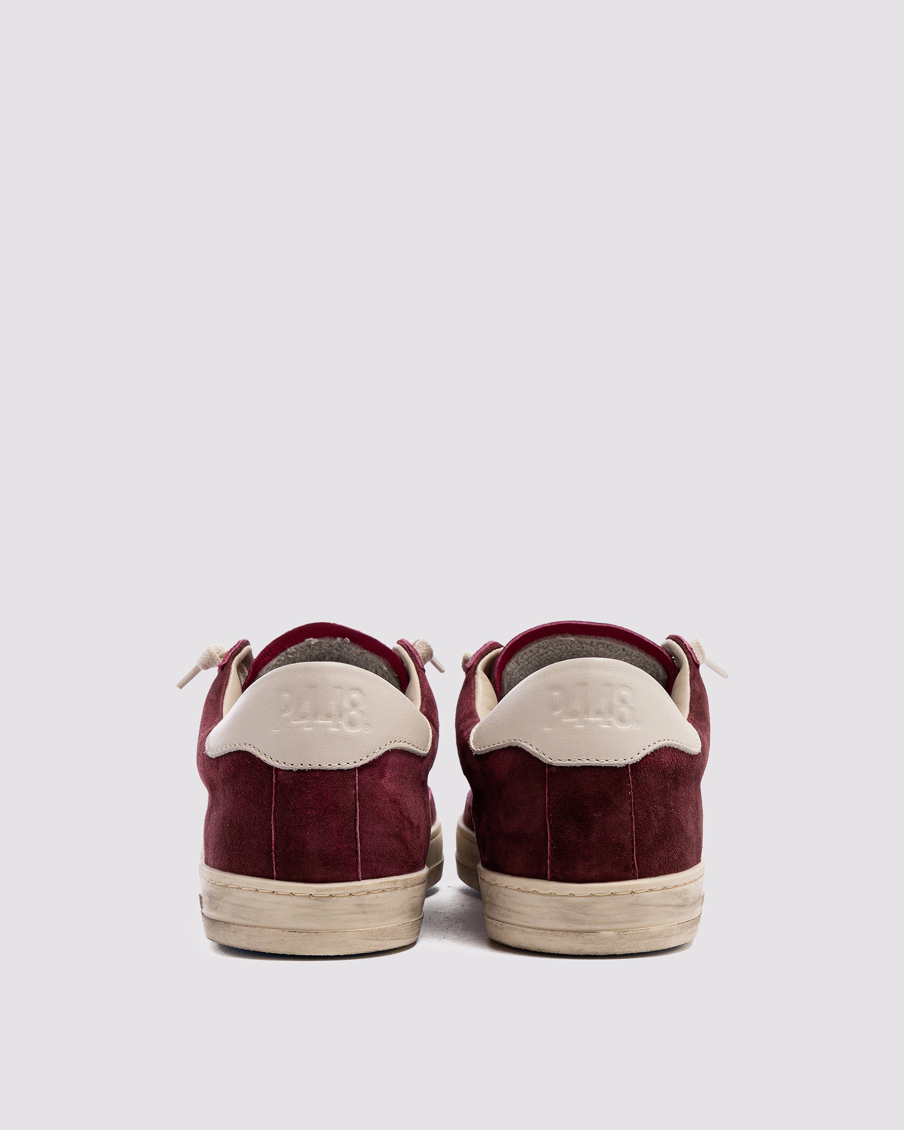 The John Stitch Wine is wrapped in red suede with a grey leather heel tab and a rubber toe cap. Off-white cotton laces, our signature P448 hand-distressed rubber sole and light blue tread ground the look. Swap in the extra pair of red laces for a monochromatic moment.