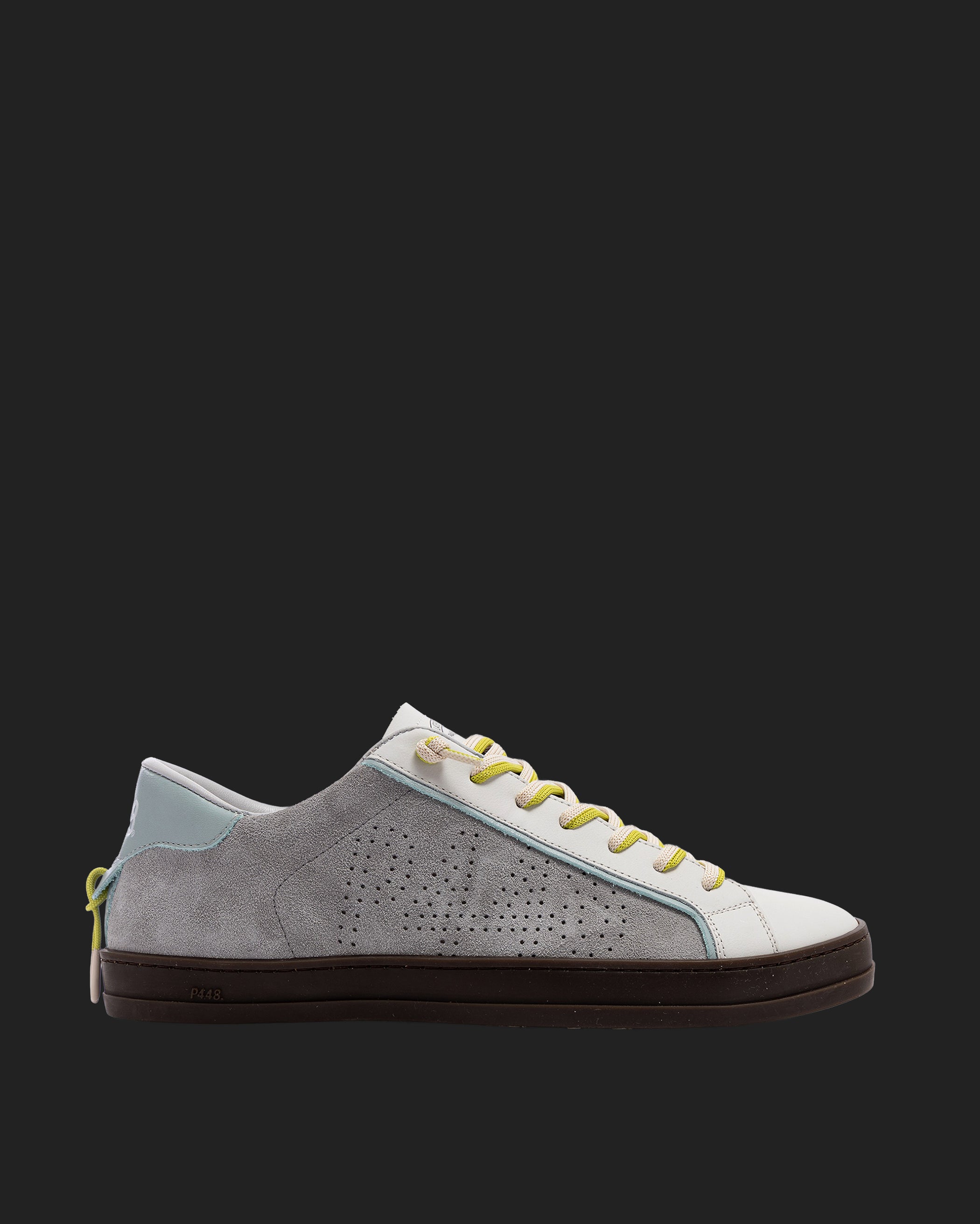 The John White Forrest is wrapped in white leather and grey suede, accented by a green suede heel tab, matching off-white and green laces, finished with a green lace charm. Our signature P448 rubber sole grounds the look. Swap in the extra pair of white laces to tie it all together.