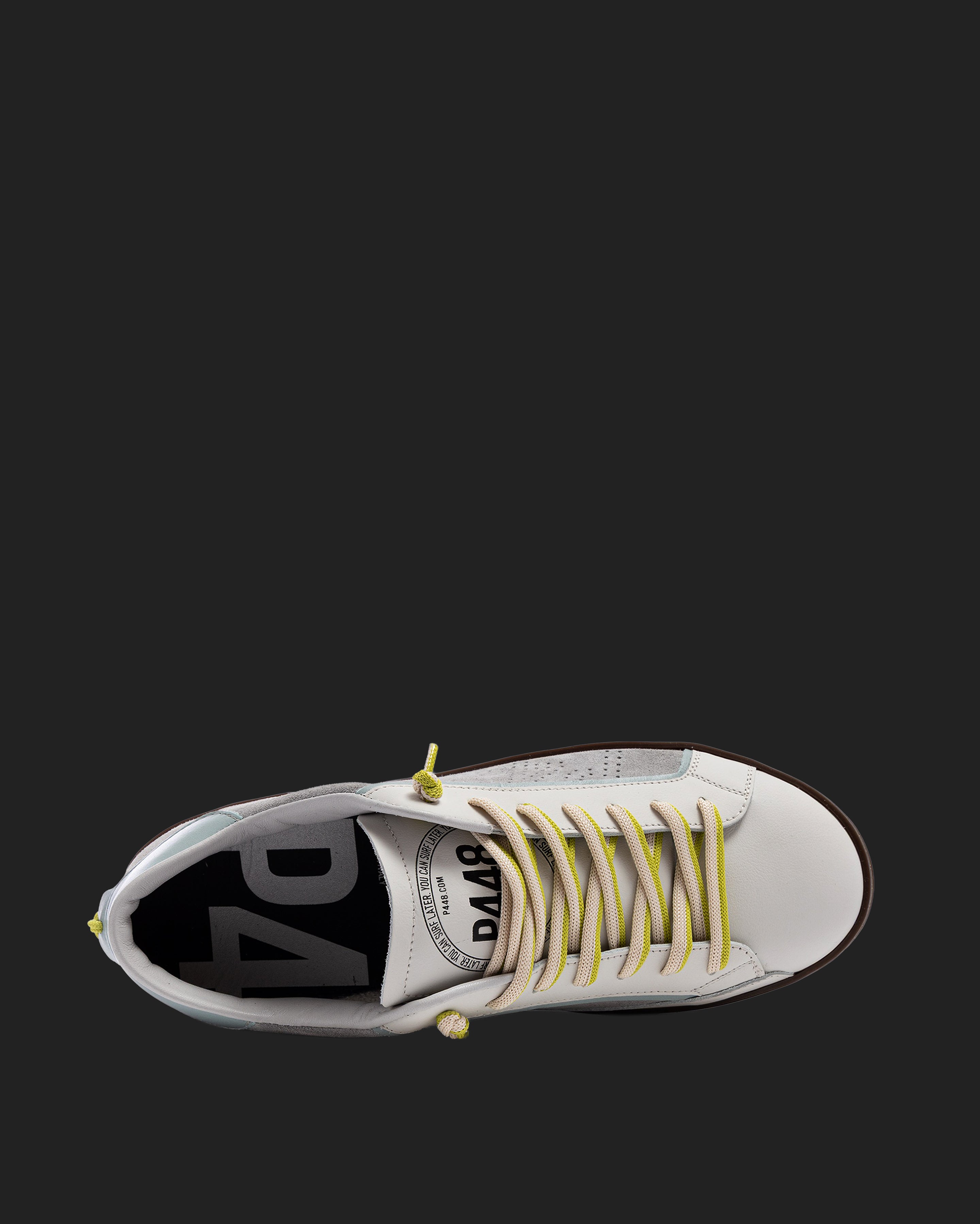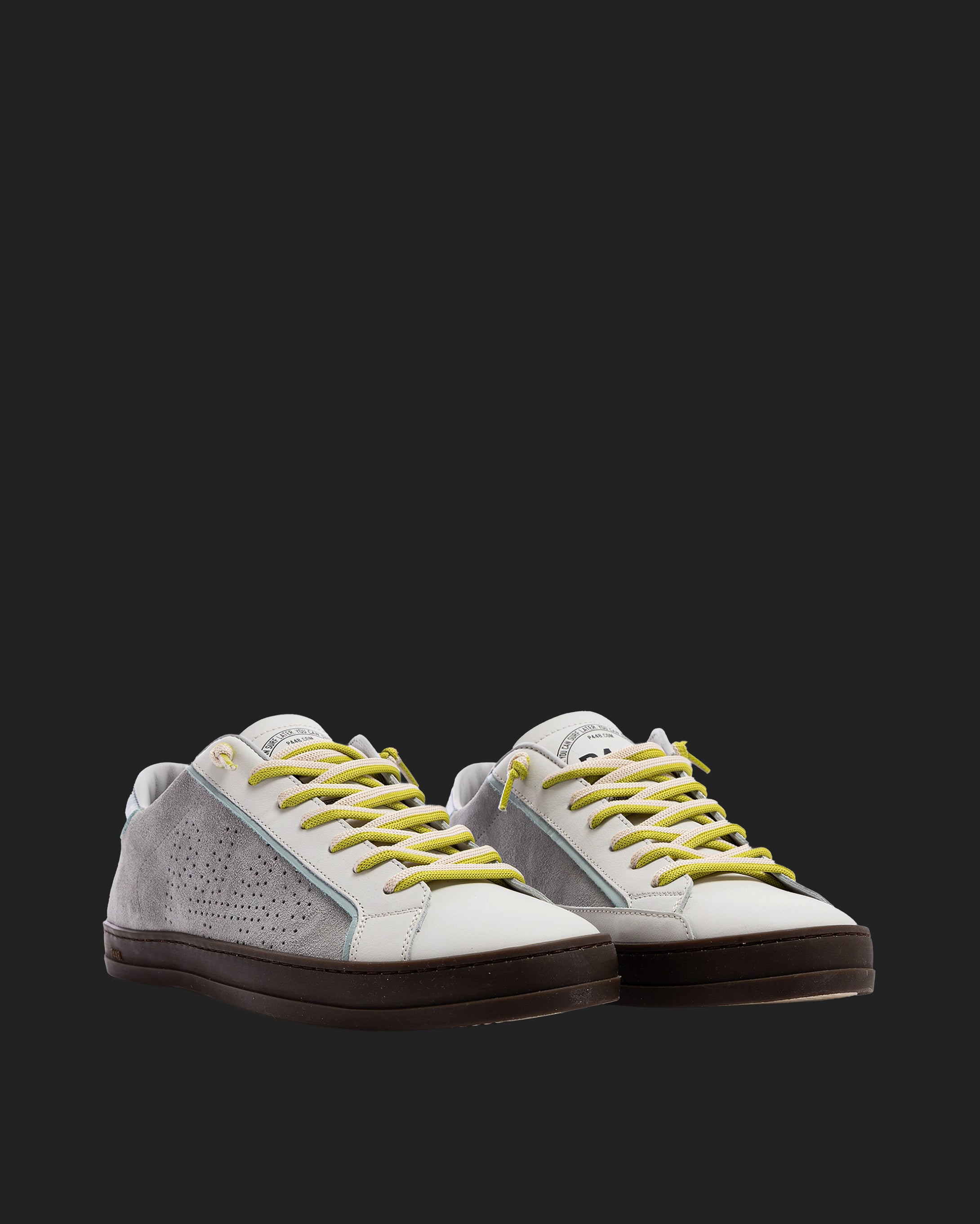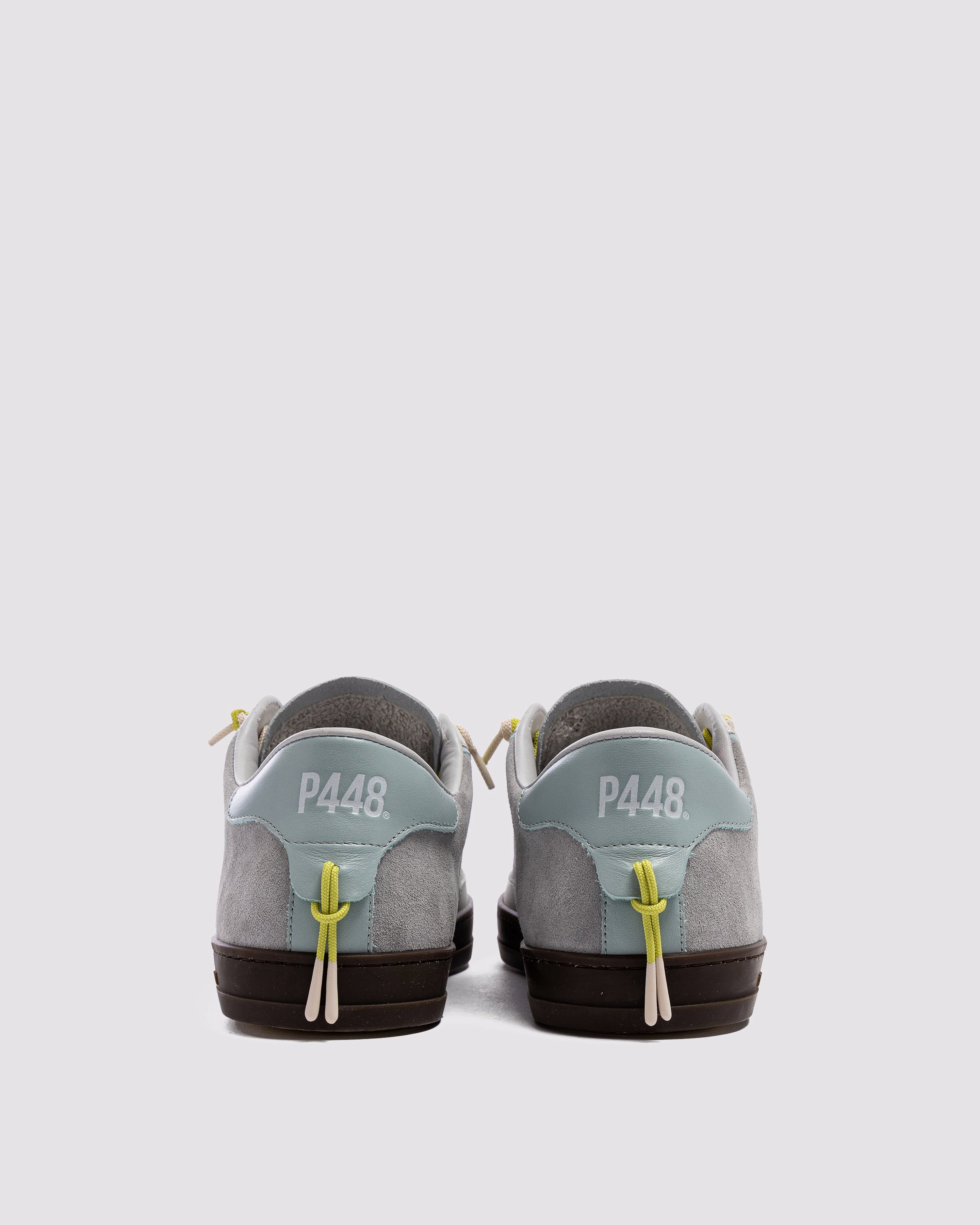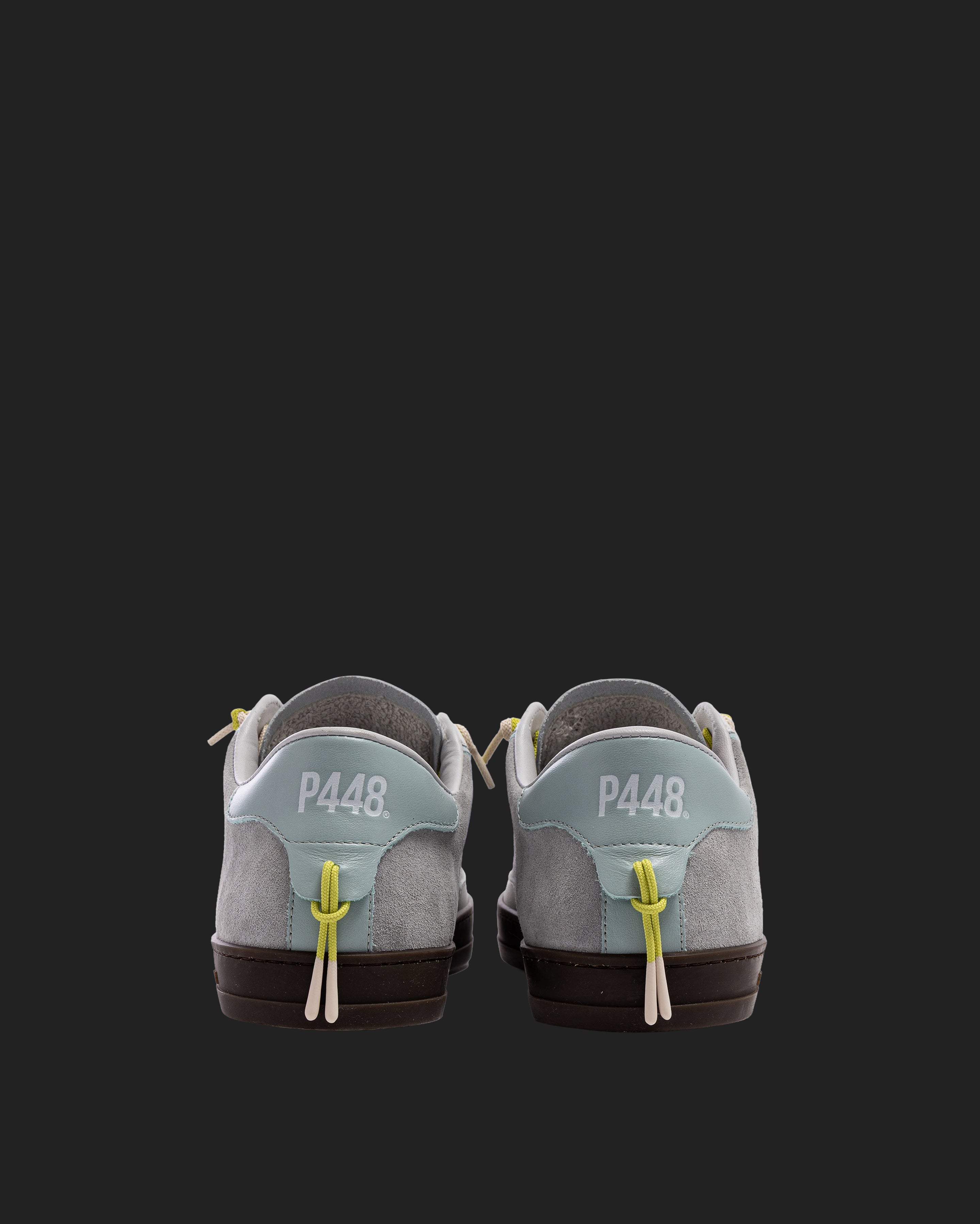 The John Lemon Sky is wrapped in grey suede and white leather, complemented by a light blue leather heel tab, cream and yellow laces and a yellow lace charm. Our signature P448 black rubber sole and cream tread finish off the look. Swap in the extra pair of white laces to keep it simple.