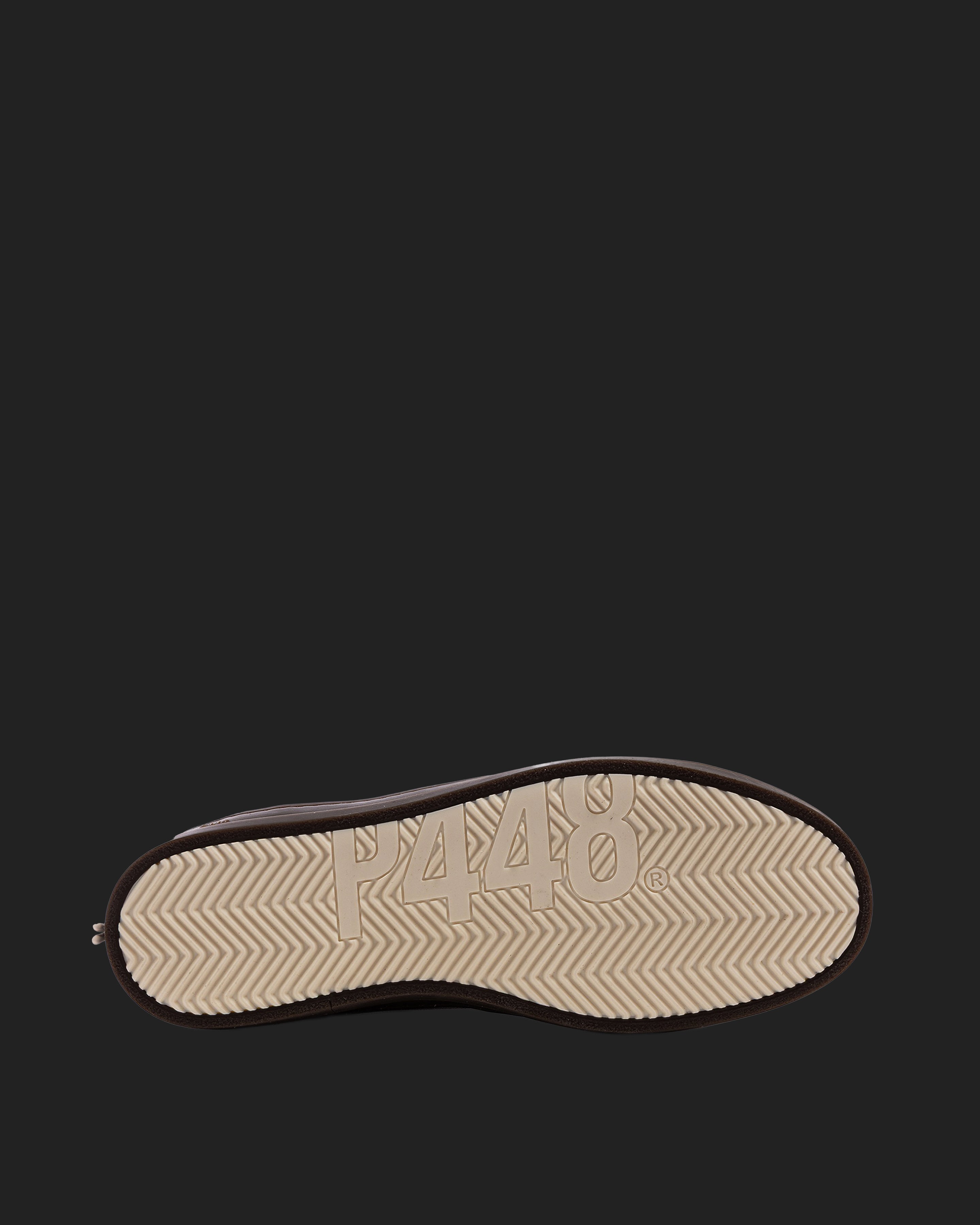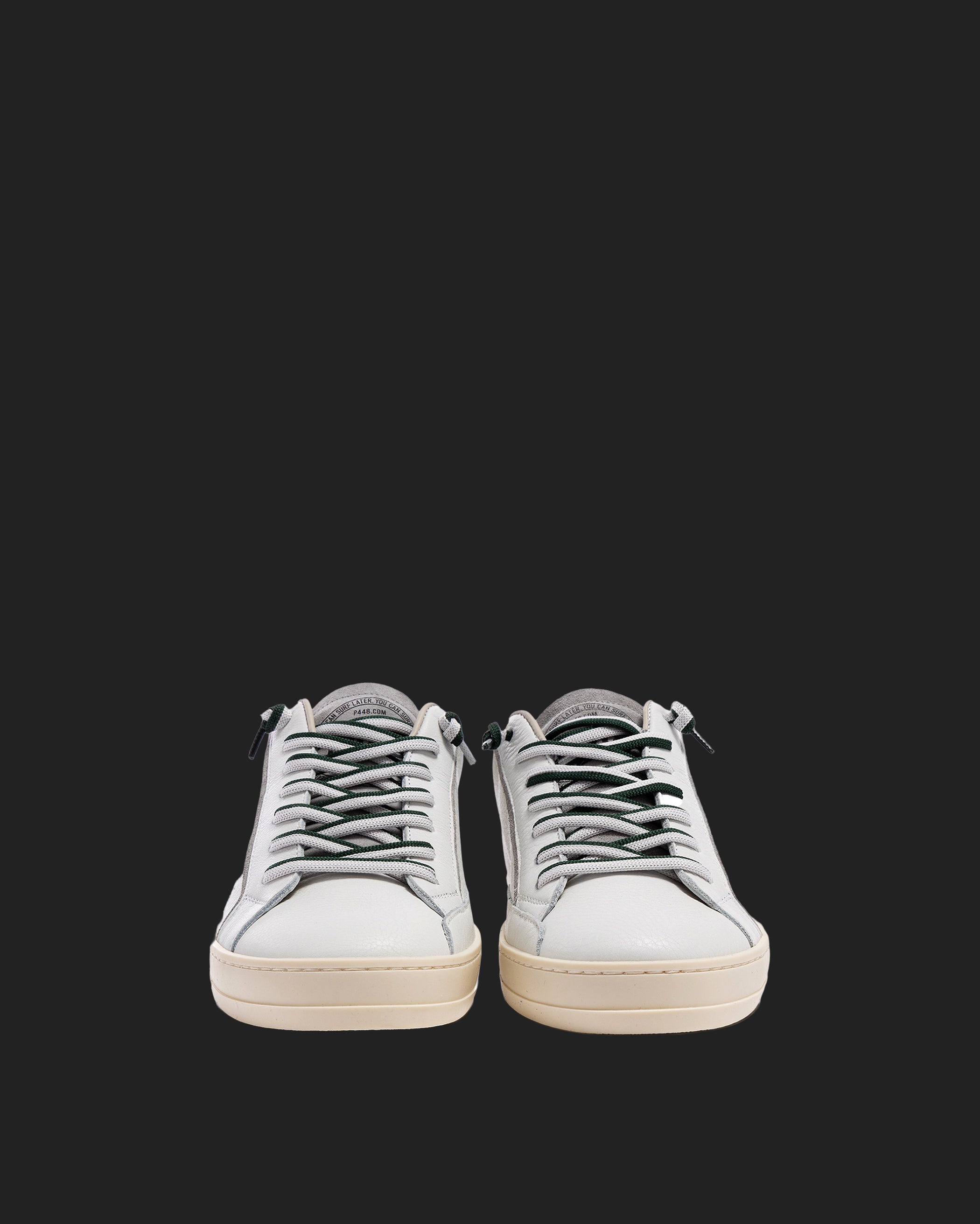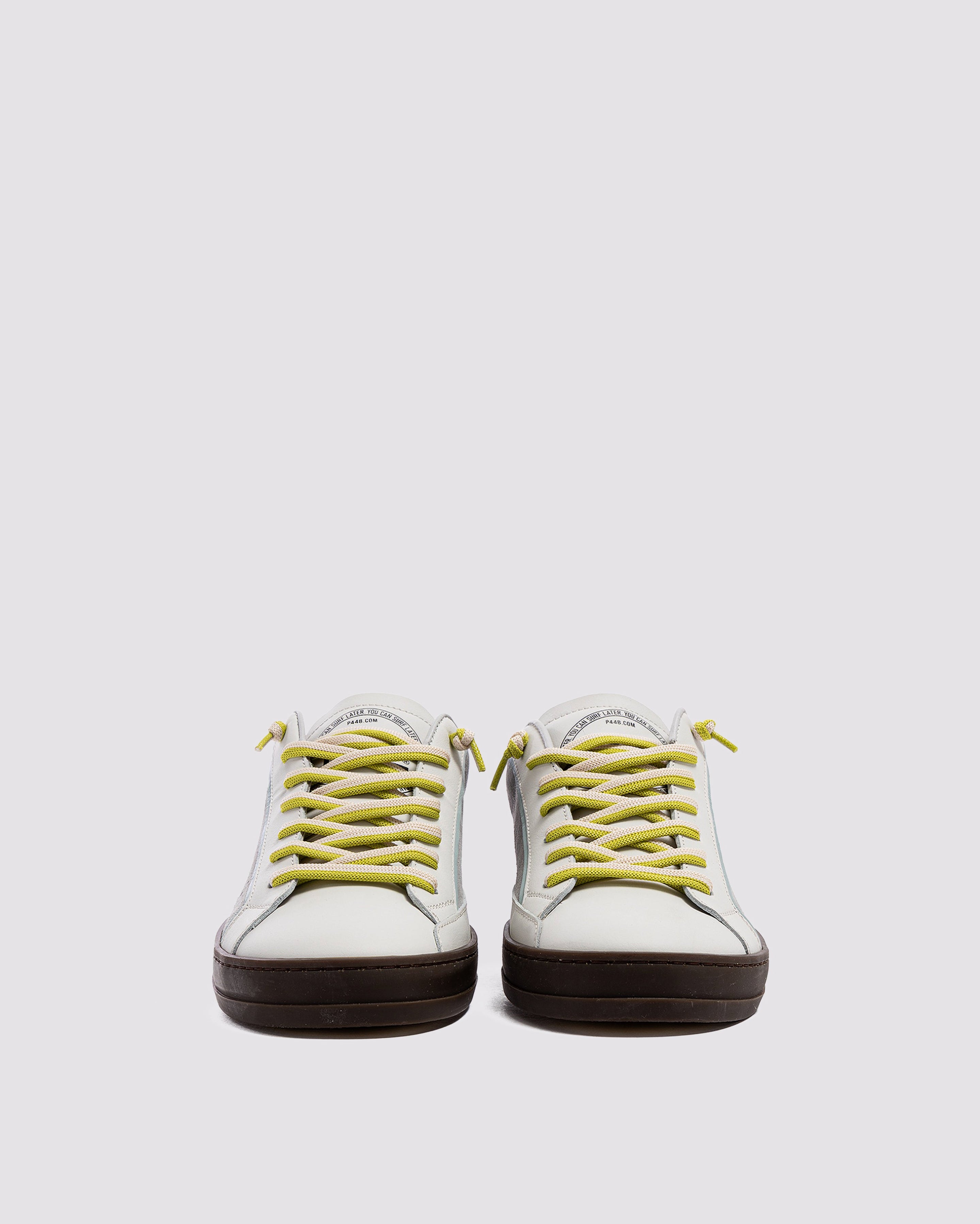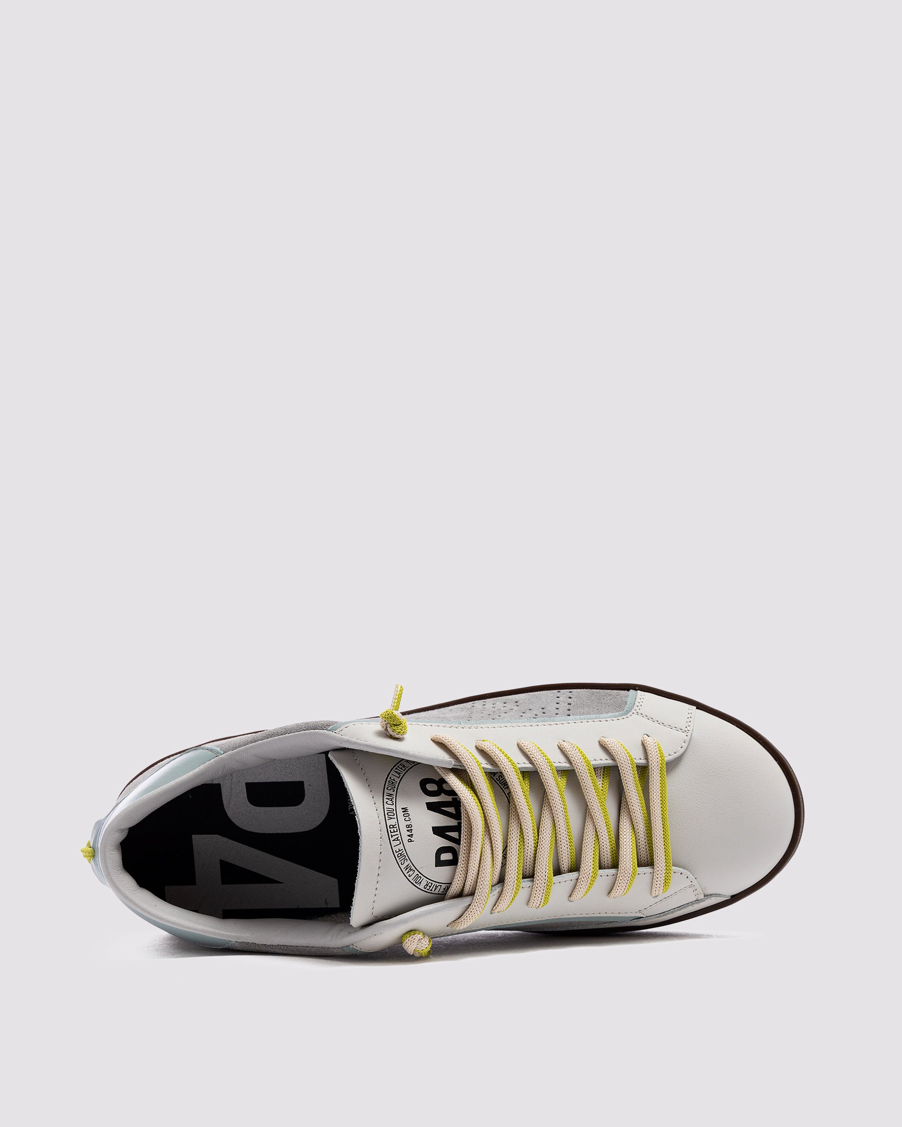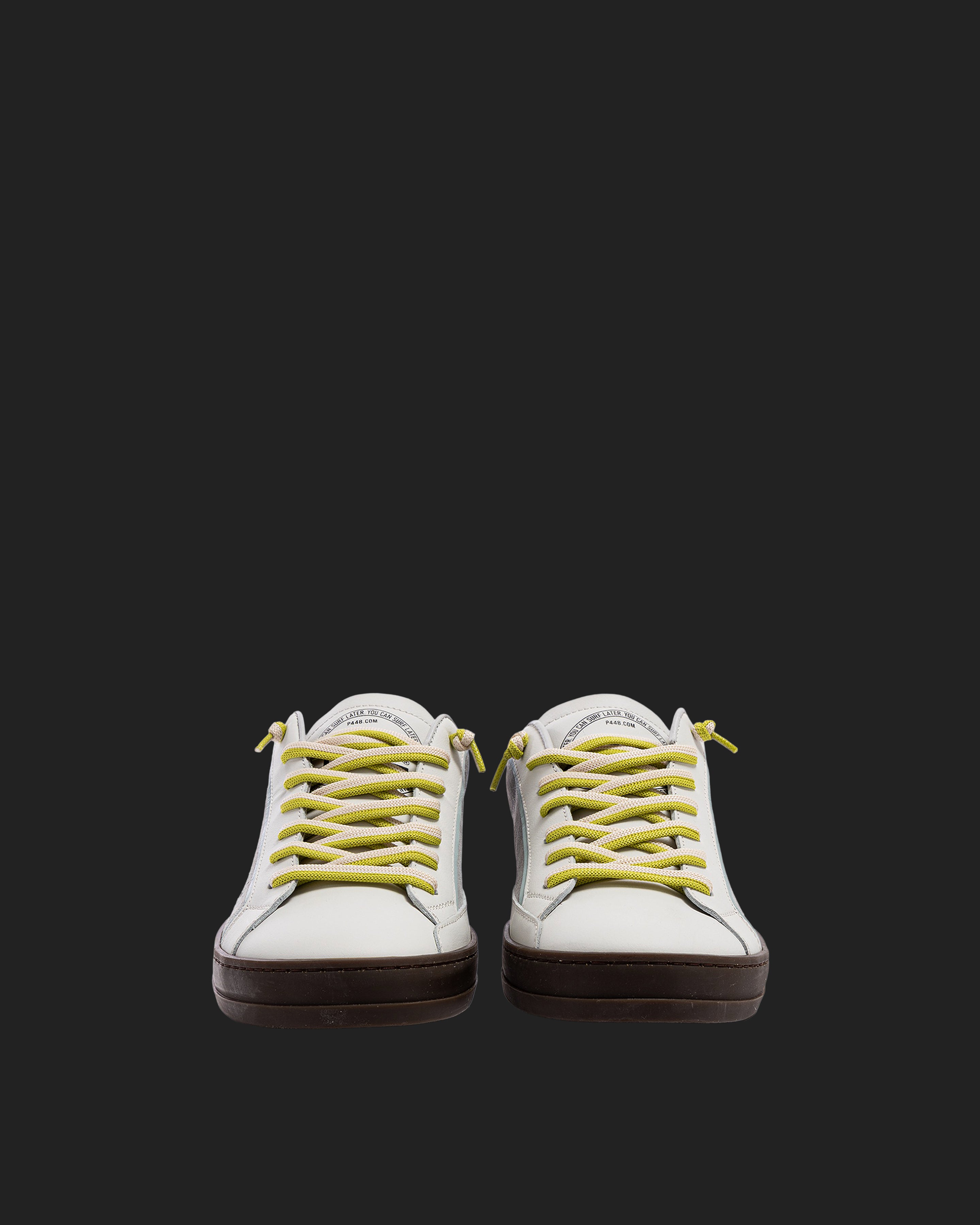 The John Lemon Sky is wrapped in grey suede and white leather, complemented by a light blue leather heel tab, cream and yellow laces and a yellow lace charm. Our signature P448 black rubber sole and cream tread finish off the look. Swap in the extra pair of white laces to keep it simple.