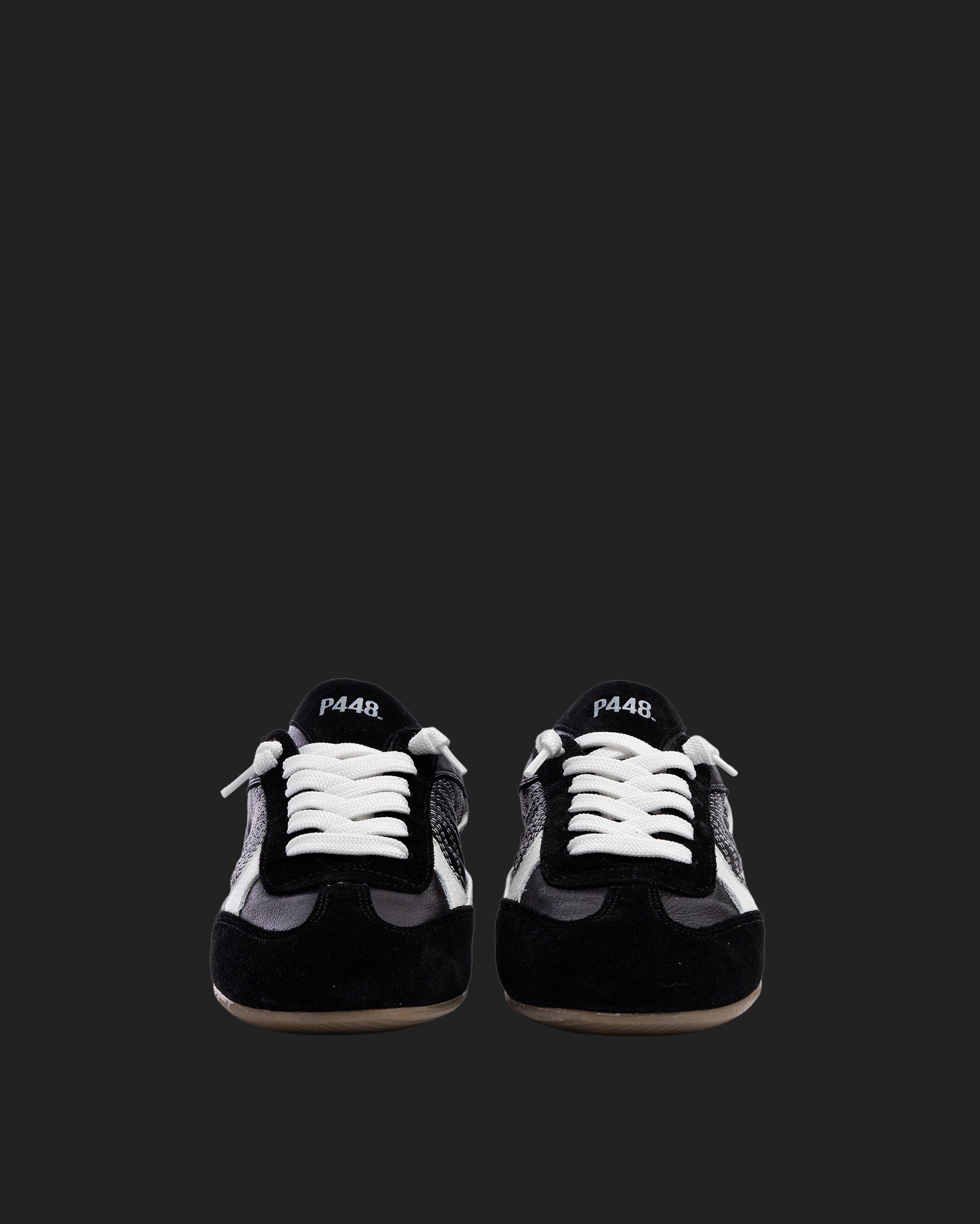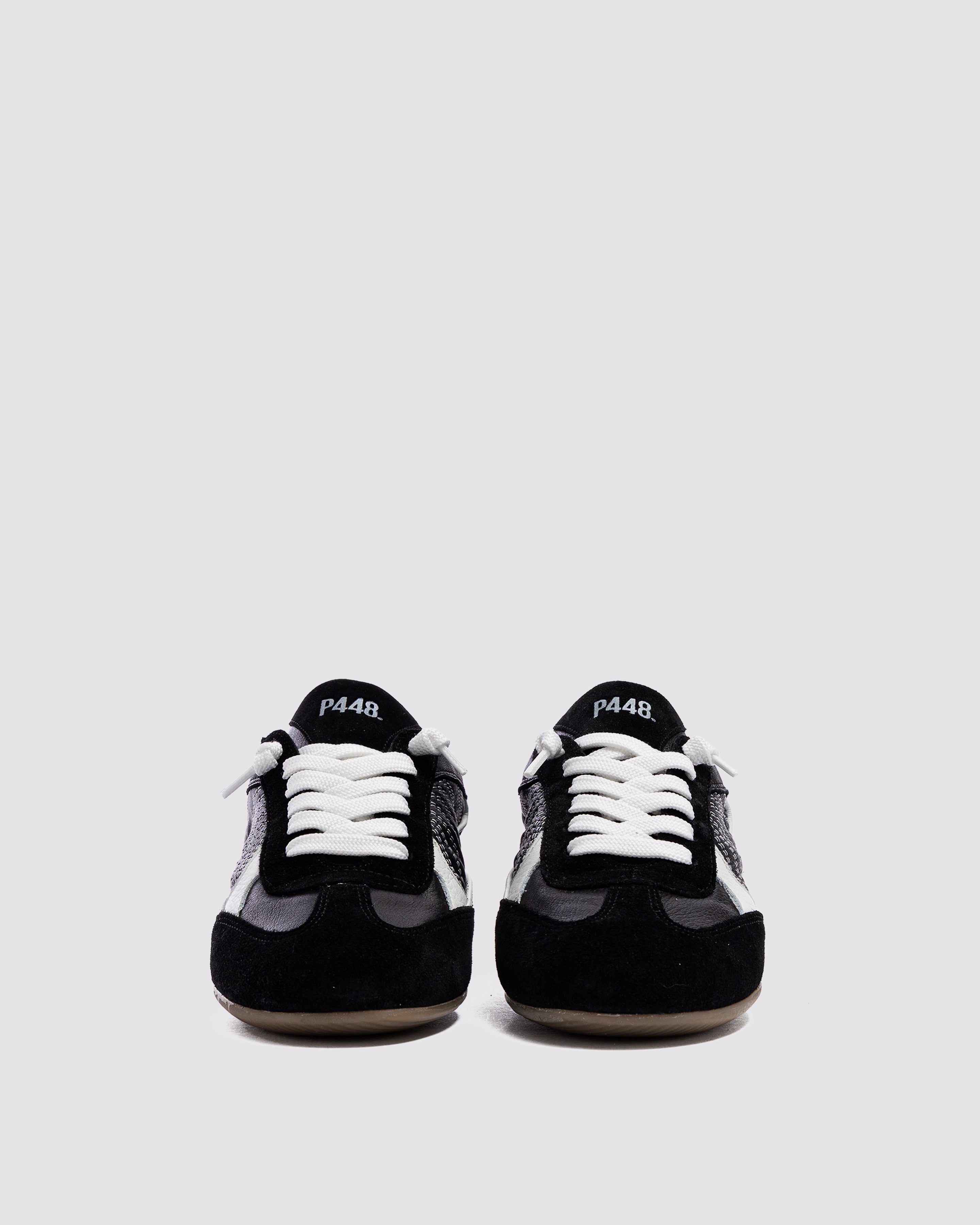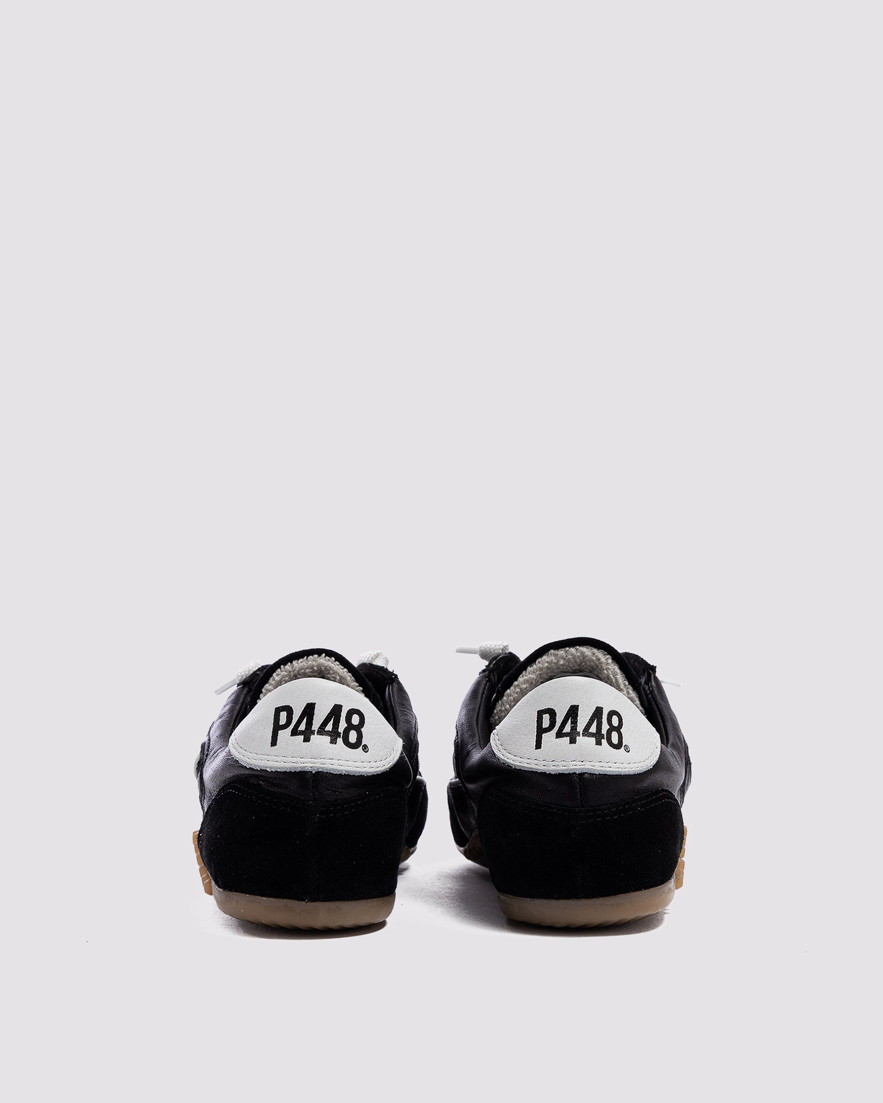 The Lisbon Black is a P448 sacchetto-designed retro soccer silhouette that uses a handmade process to bring you extra softness, flexibility and comfort. Sleek all-over black leather and suede are complemented by a white leather heel tab and contrast stitching. White laces and our raised gum tread finish off the look. Swap in the extra pair of black laces for a monochromatic moment.