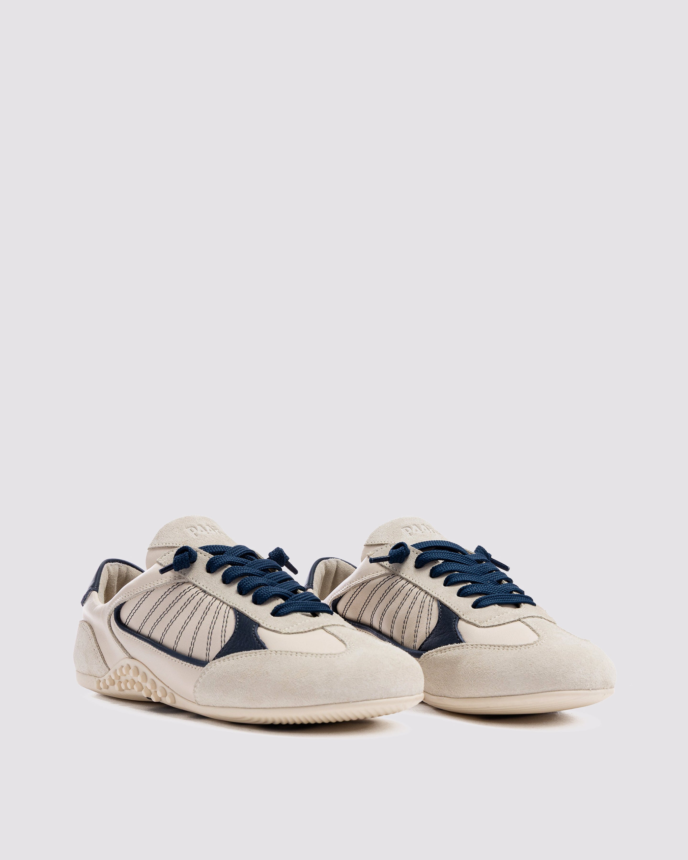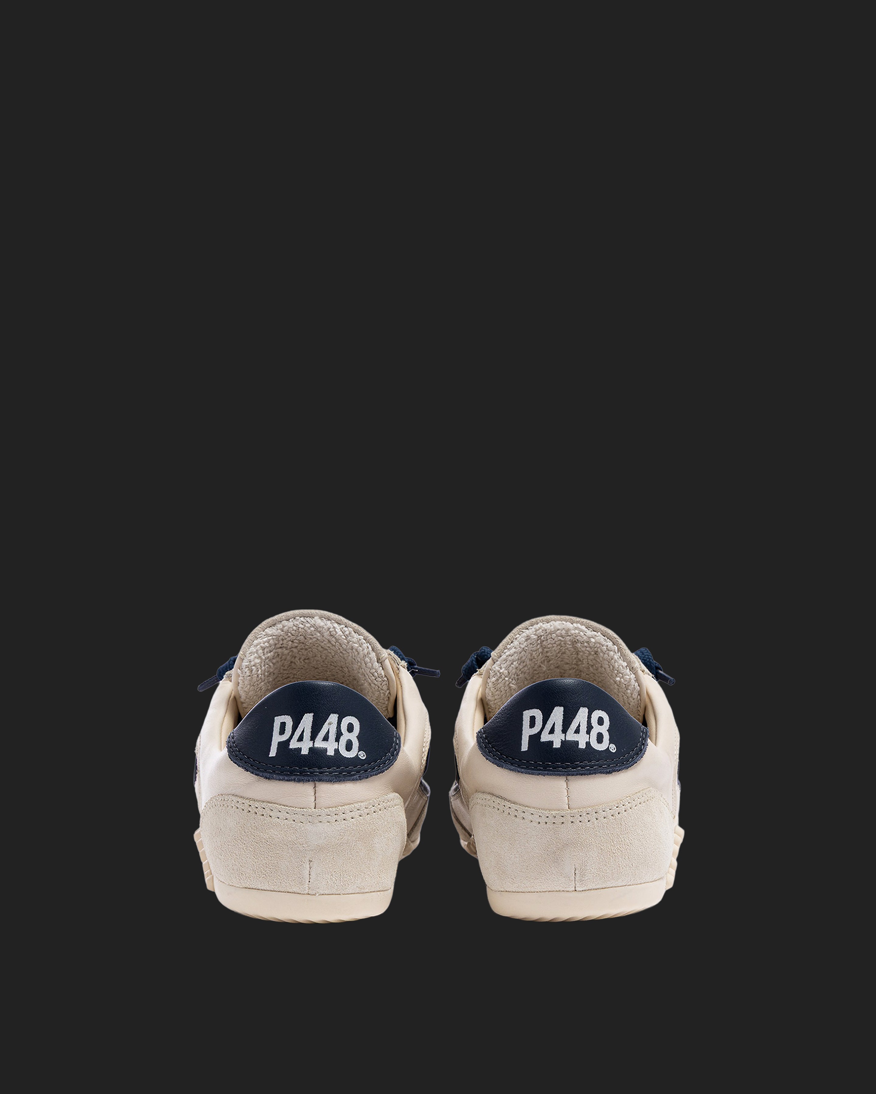 The Lisbon Cream Blue is a P448 sacchetto-designed retro soccer silhouette that uses a handmade process to bring you extra softness, flexibility and comfort. Sleek all-over white leather and cream suede are complemented by a blue leather heel tab and contrast stitching. Blue laces and our raised gum tread finish off the look. Swap in the extra pair of cream laces for a monochromatic moment.