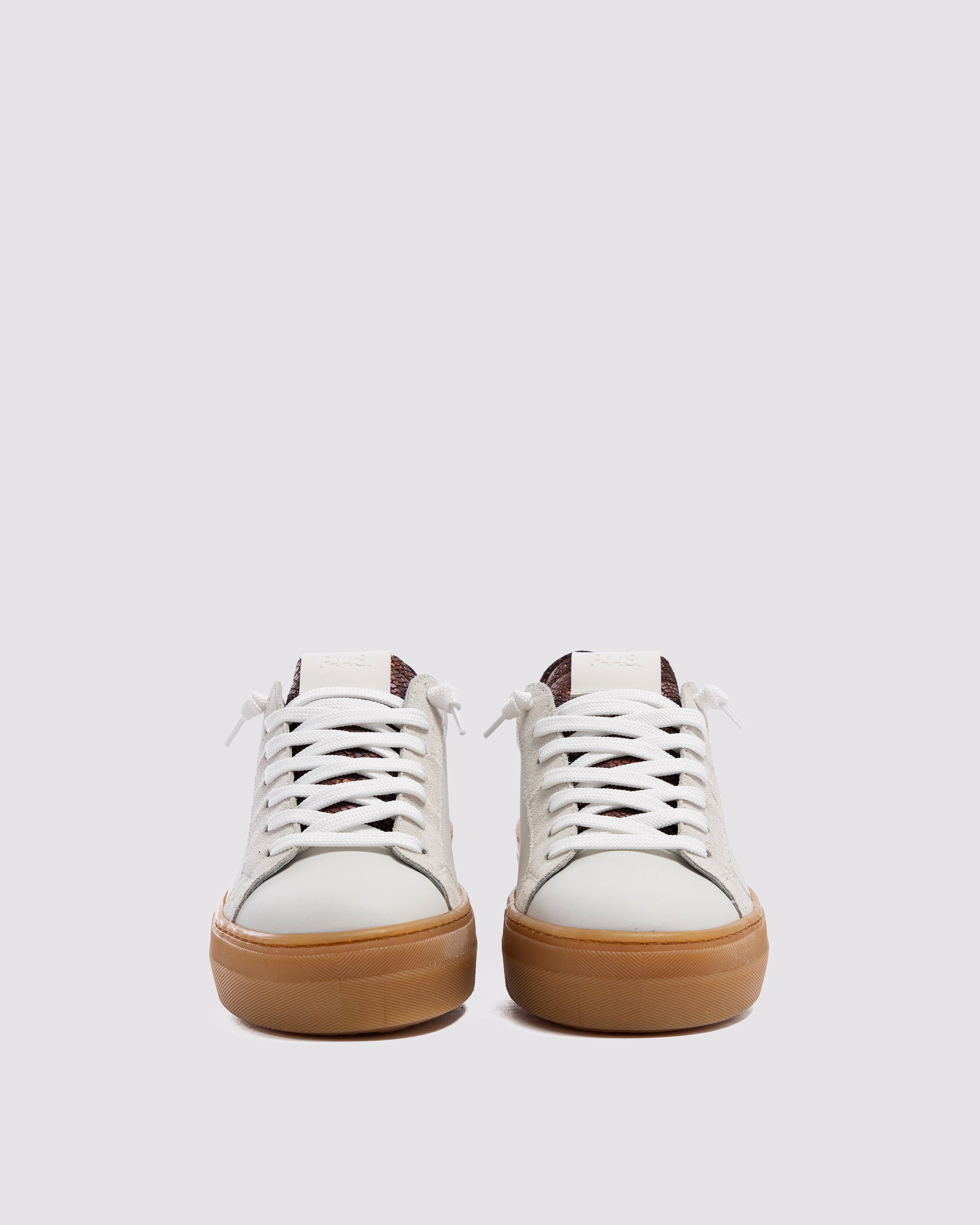 The Thea Pearl/White is wrapped in white leather with a perforated P448 logo, complemented by textured black suede details at the tongue and heel tab with white suede trim. White laces and our signature P448 rubber platform soles with gum treads finish off the look. This playful platform runs small, so be sure to size up if you’re in between. Extra pink lace included