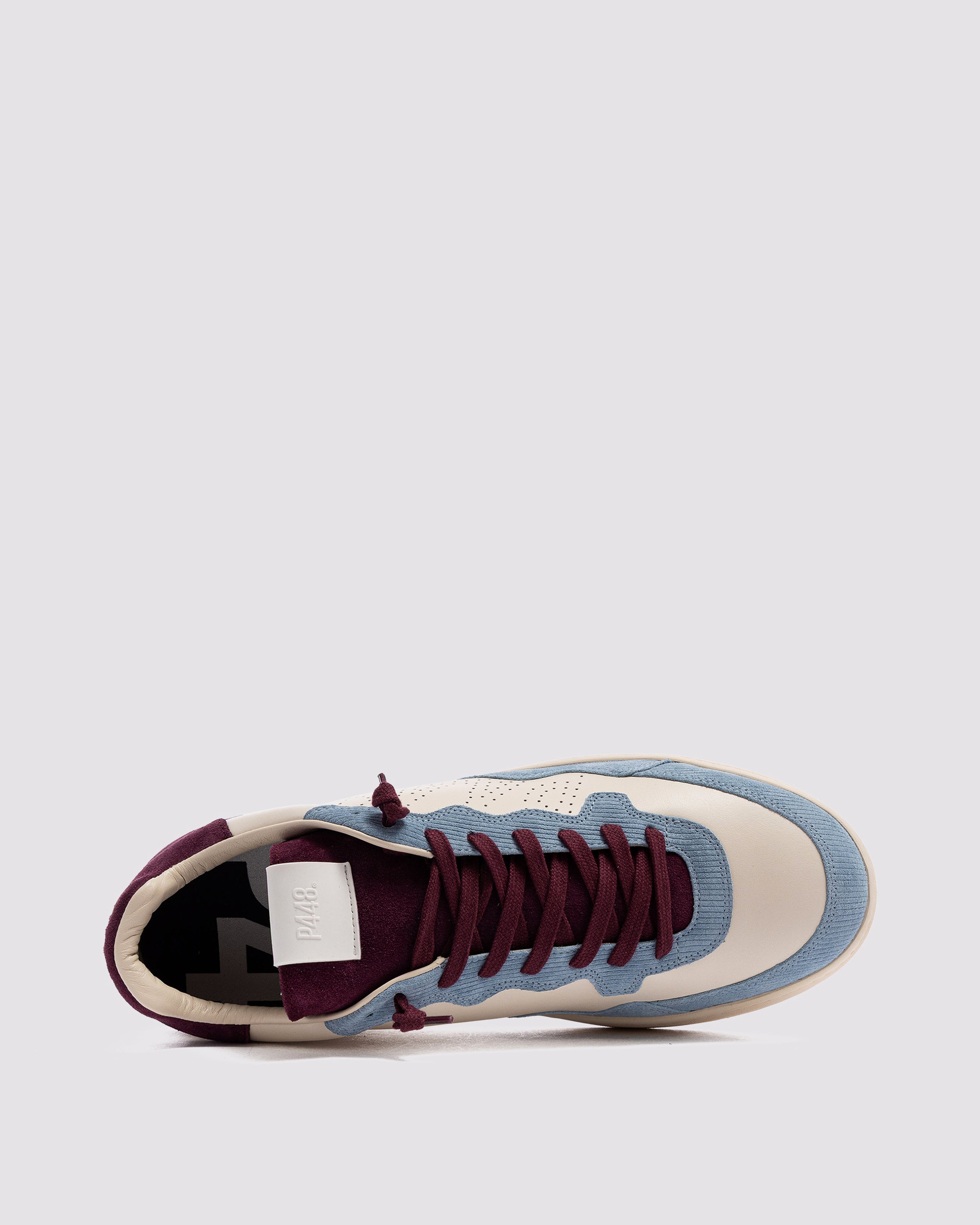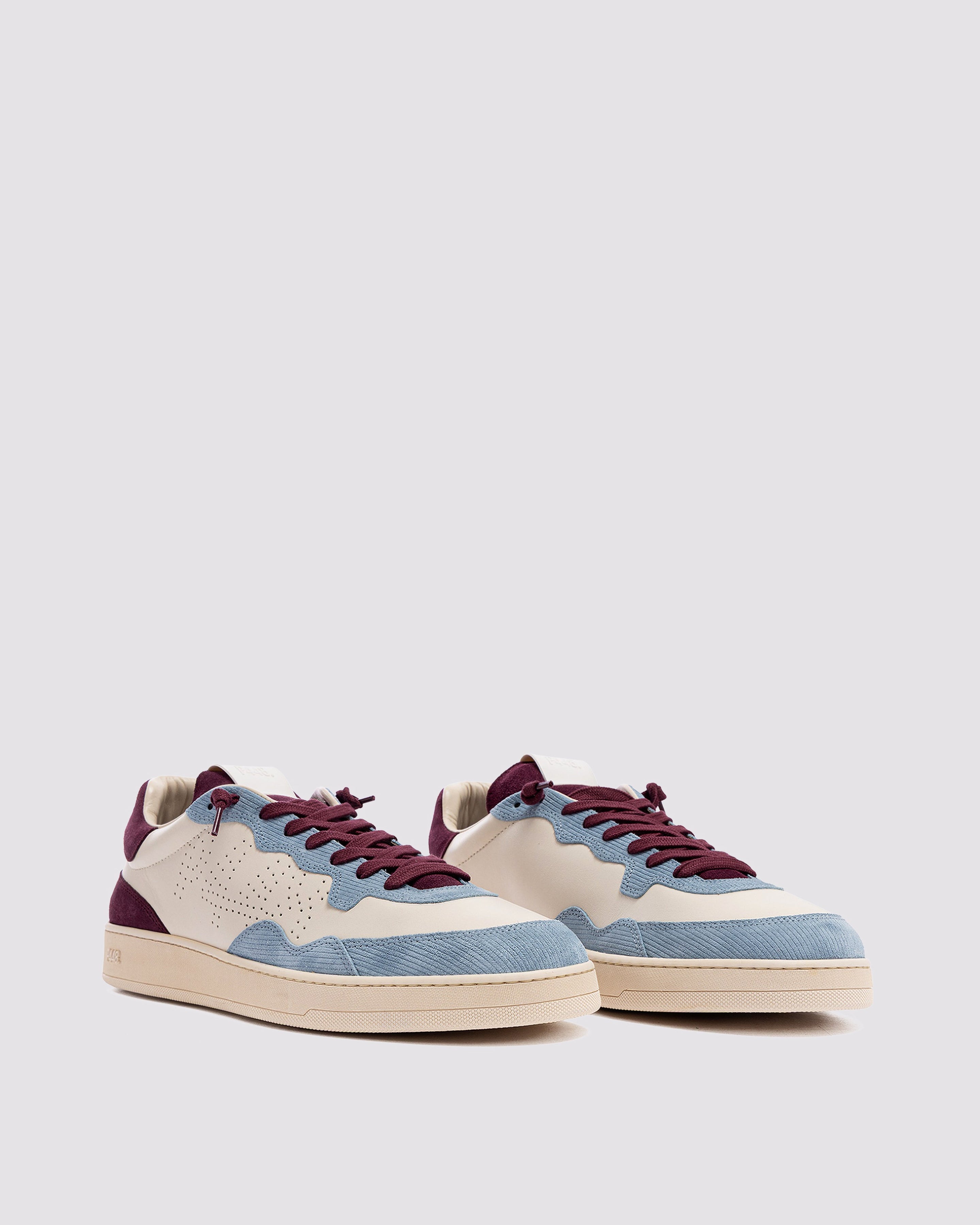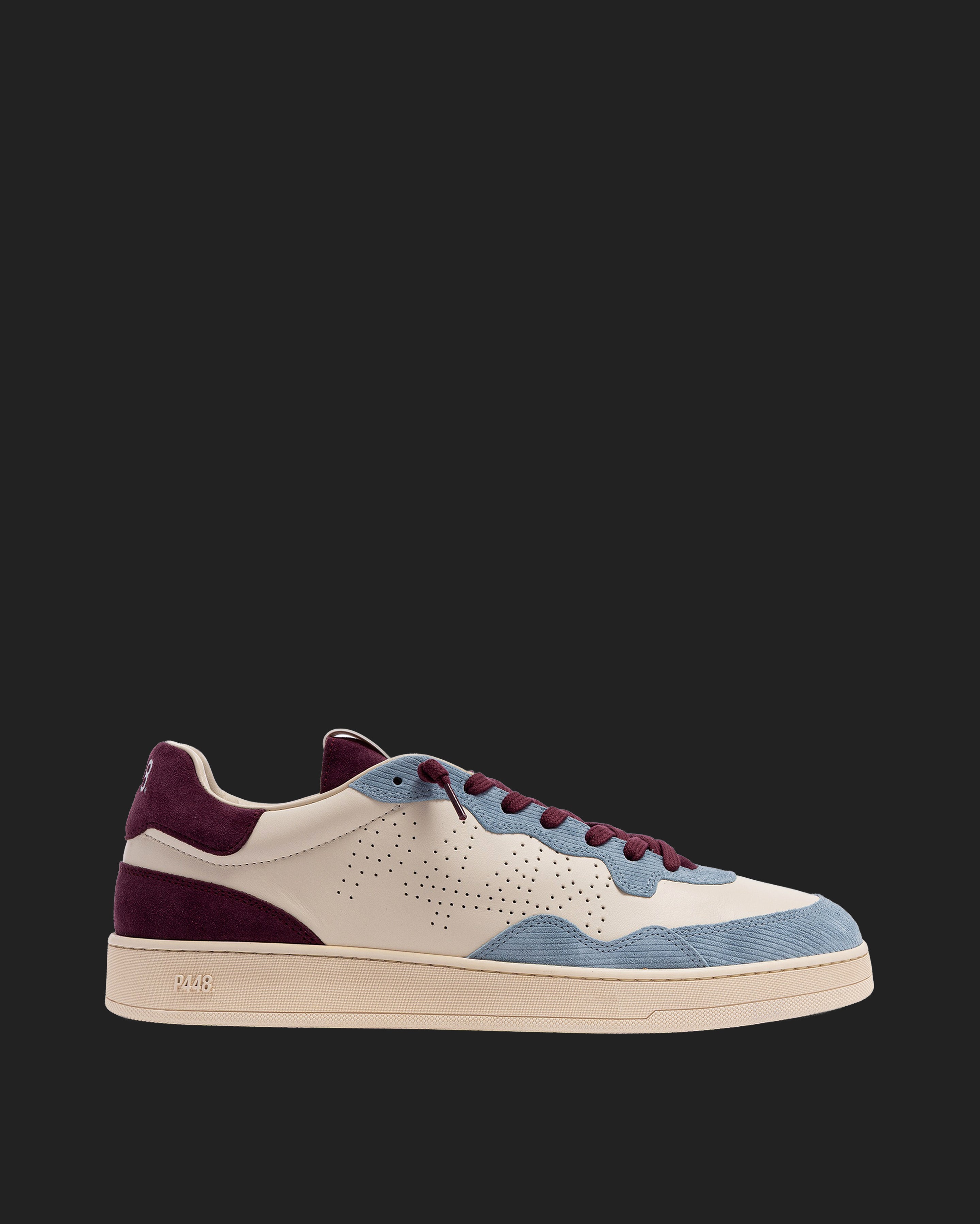 The Vert Sand Sky features a white leather upper with a perforated P448 logo, accented by a burgundy suede tongue, blue corduroy suede trim and toe, and burgundy suede heel tab and detailing. Finished with burgundy cotton laces, or swap in the extra pair of white cotton laces for a cleaner look. Our signature P448 rubber sole is crafted with skaters in mind, featuring a herringbone tread and pivot point for extra grip and ultimate comfort.
