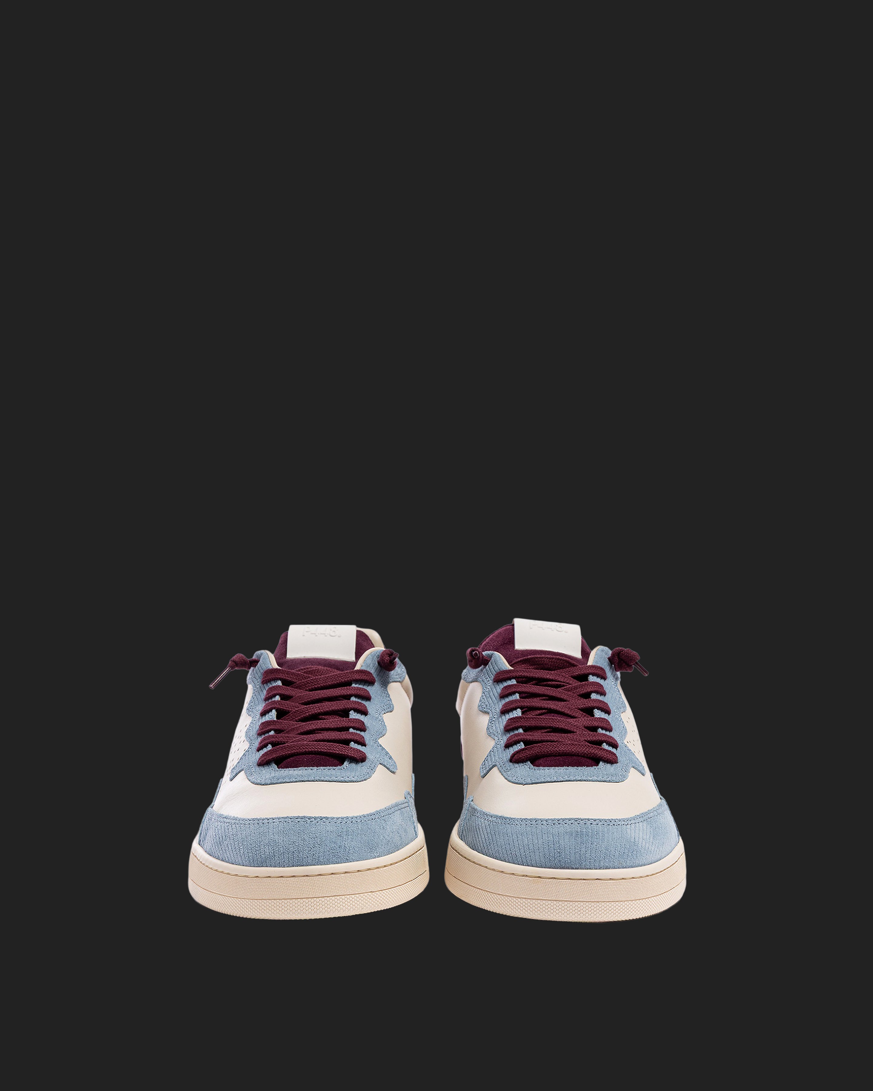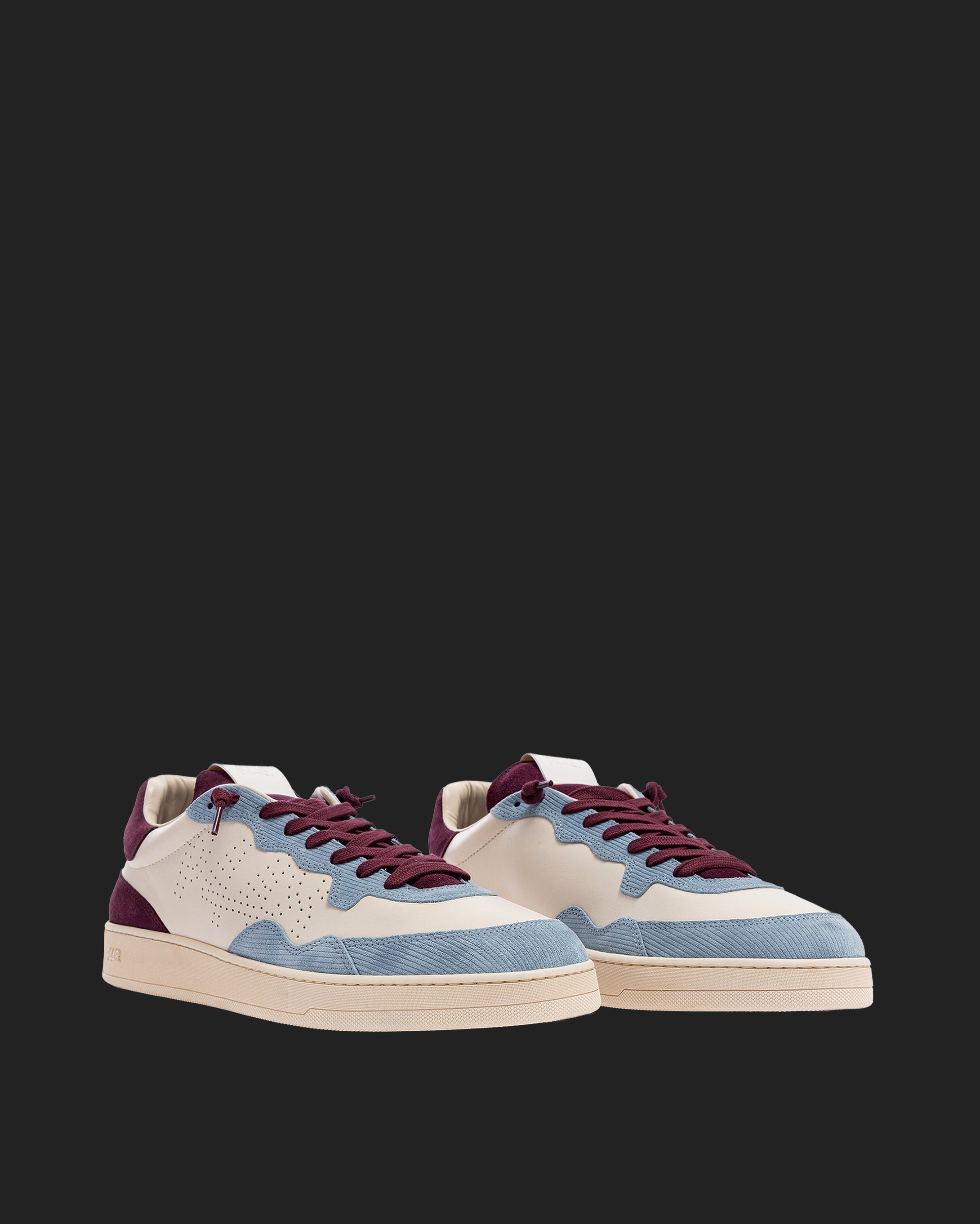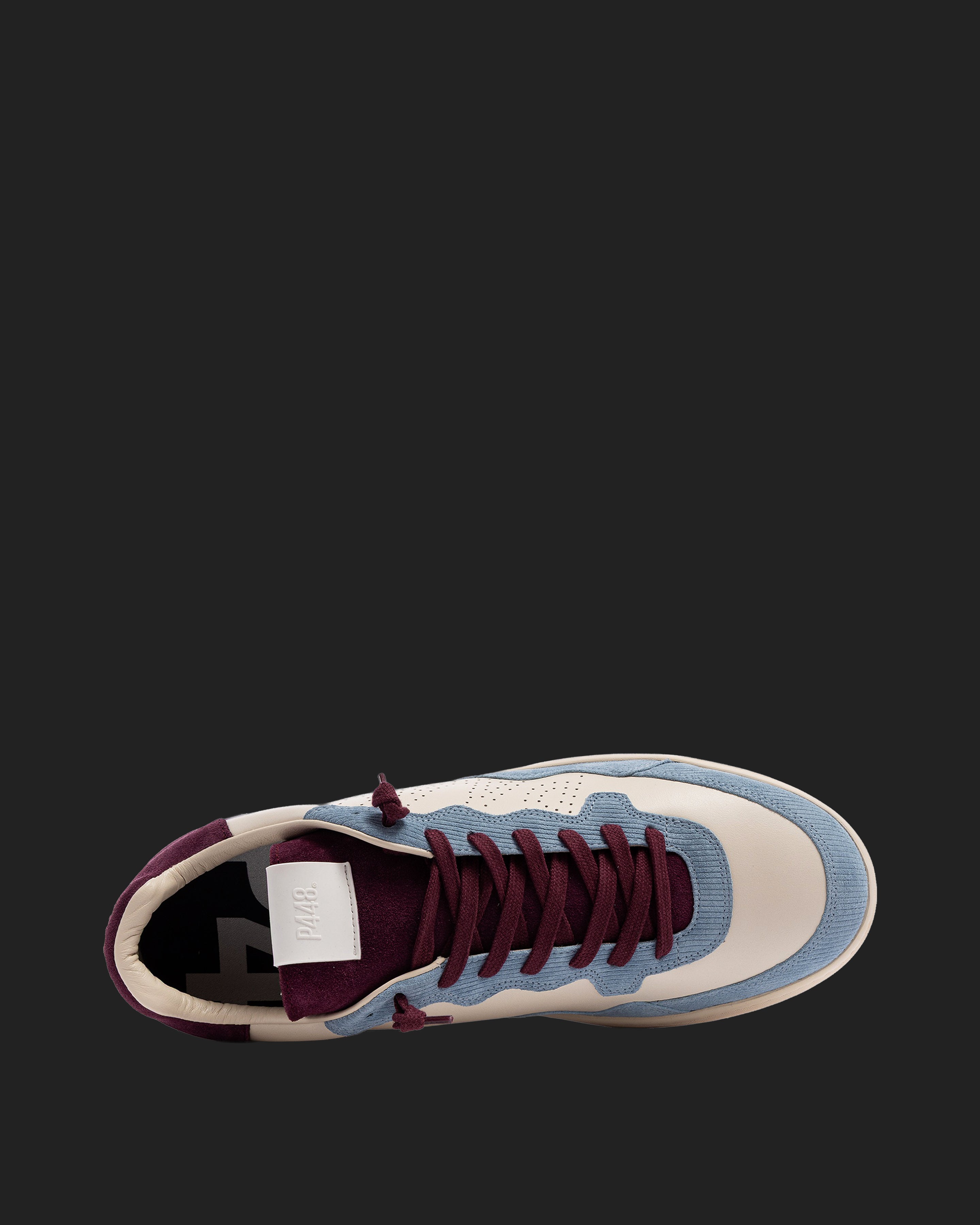 The Vert Sand Sky features a white leather upper with a perforated P448 logo, accented by a burgundy suede tongue, blue corduroy suede trim and toe, and burgundy suede heel tab and detailing. Finished with burgundy cotton laces, or swap in the extra pair of white cotton laces for a cleaner look. Our signature P448 rubber sole is crafted with skaters in mind, featuring a herringbone tread and pivot point for extra grip and ultimate comfort.